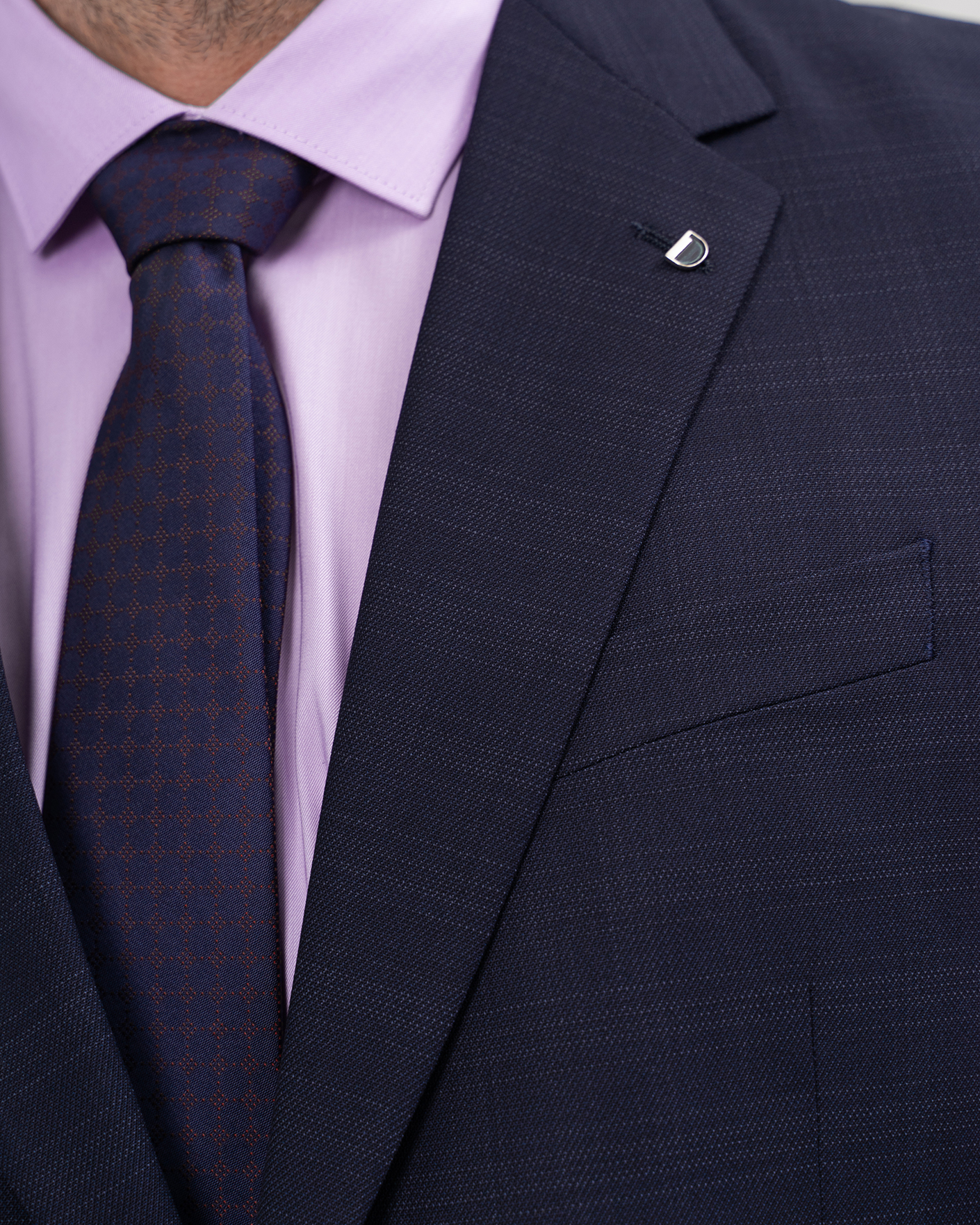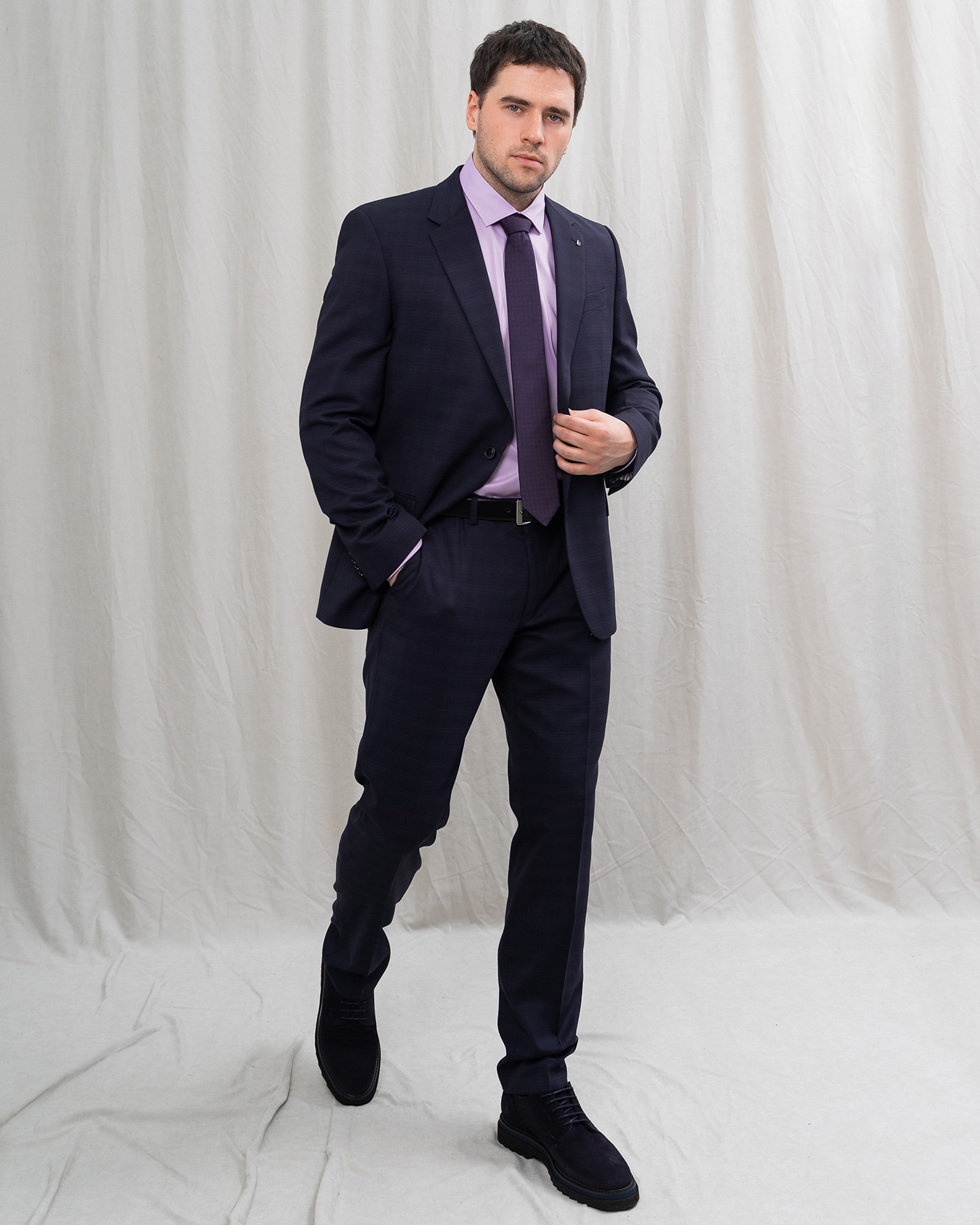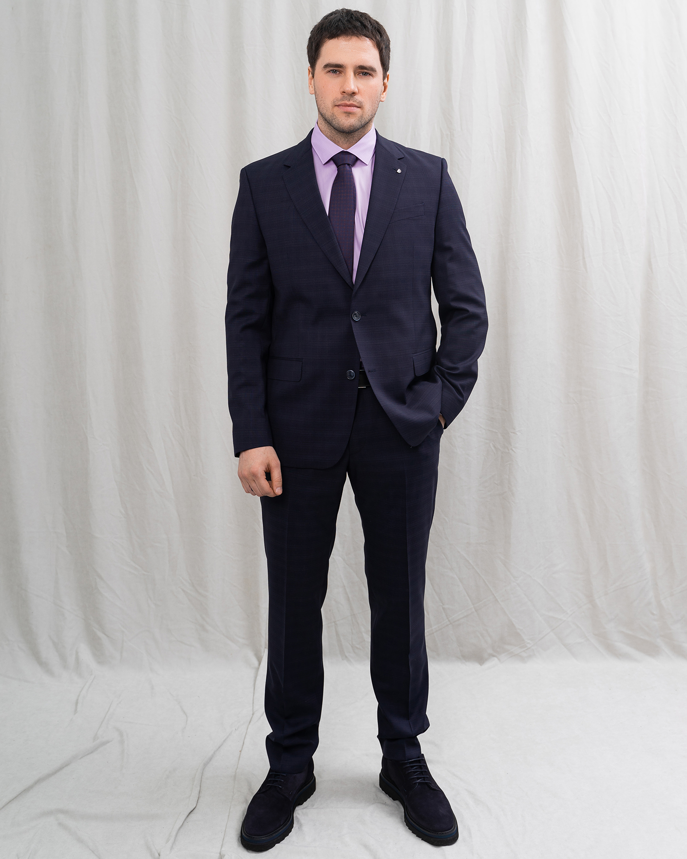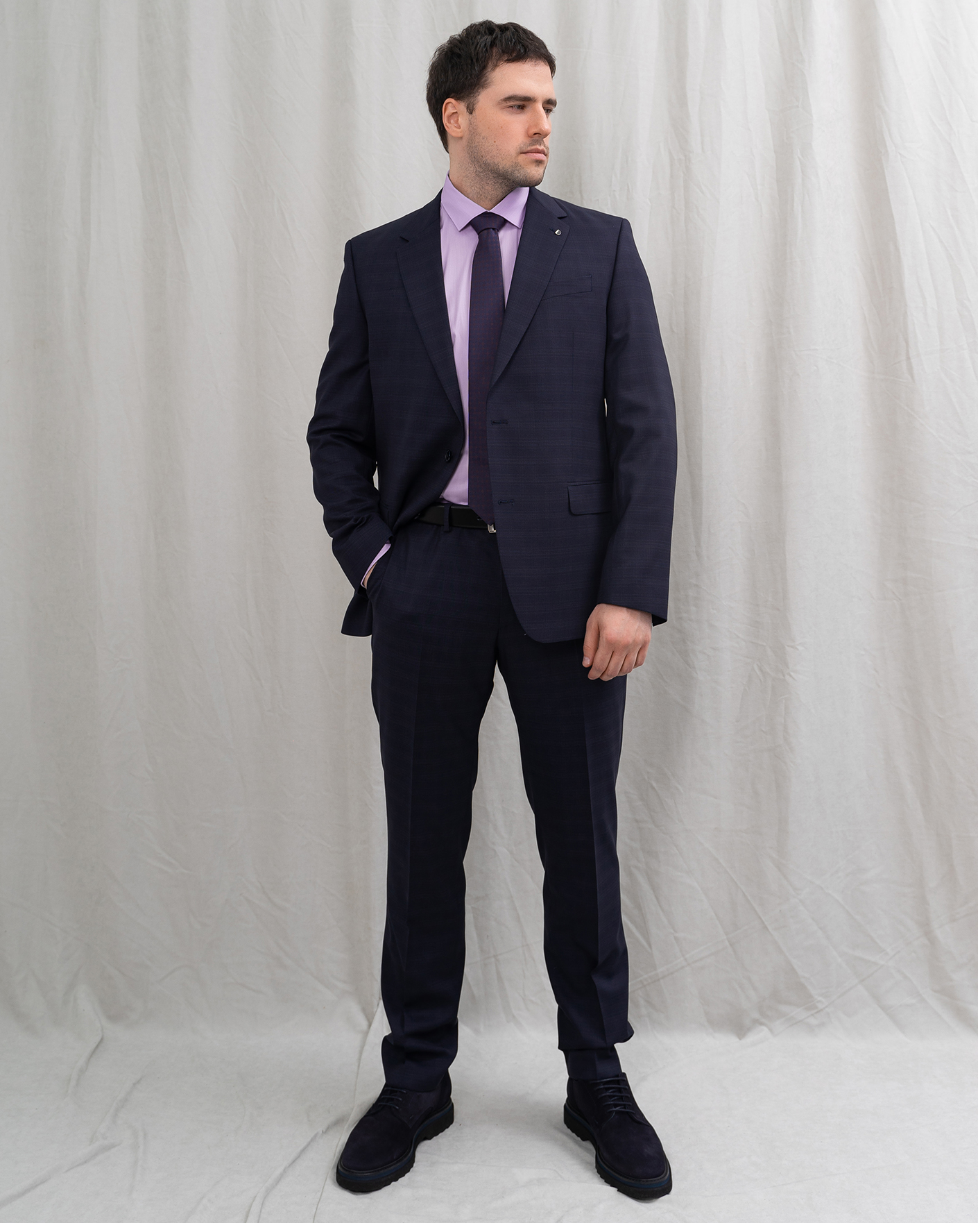 Деловой костюм Digel синего цвета в строчный рисунок и клетку. Пиджак с лацканами, застежка на две пуговицы, врезные карманы с клапанами по бокам. Классические брюки со стрелками, на стандартной застежкой, врезные карманы по бокам и сзади. Костюм идеально подойдет для деловой встречи.
