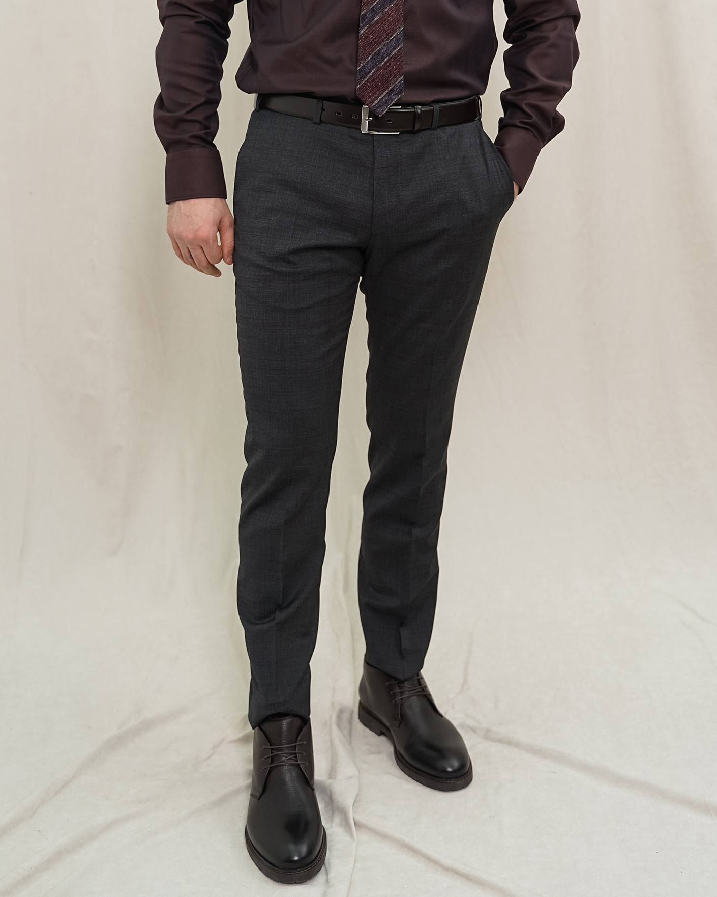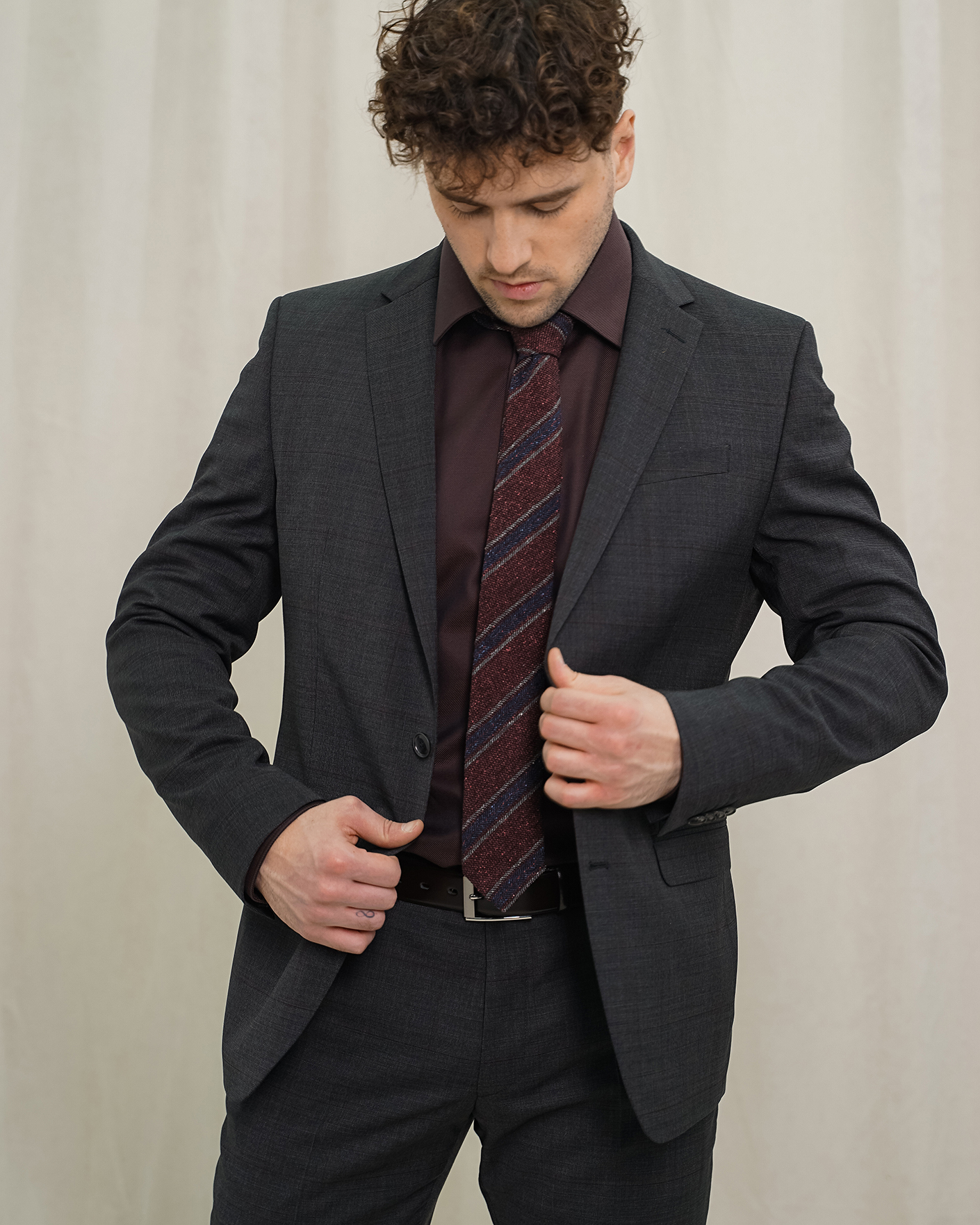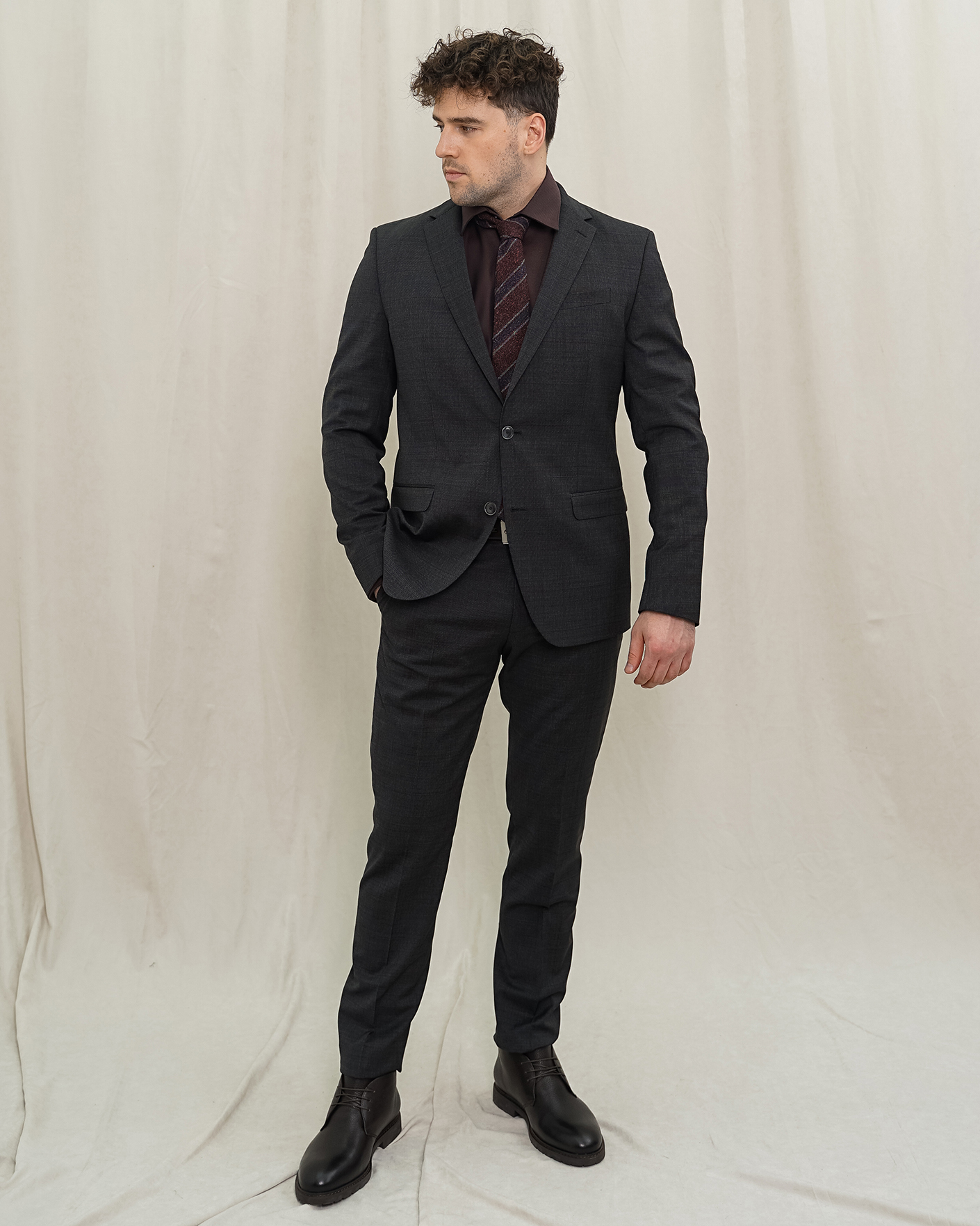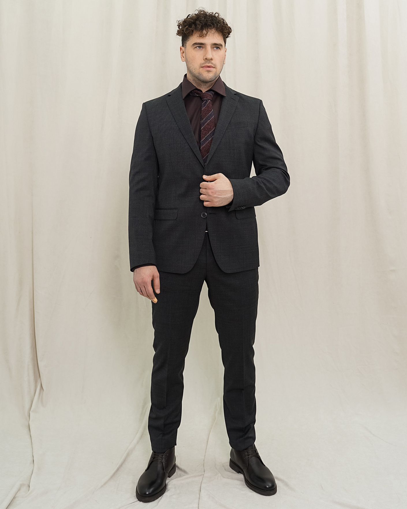 Шерстяной костюм Digel бордово-кричневого цвета в крупную клетку. Пиджак с лацканами, застежка на две пуговицы, врезные карманы с клапанами по бокам. Классические брюки на стандартной застежкой, врезные карманы по бокам и сзади. Костюм идеально подойдет для деловой встречи.