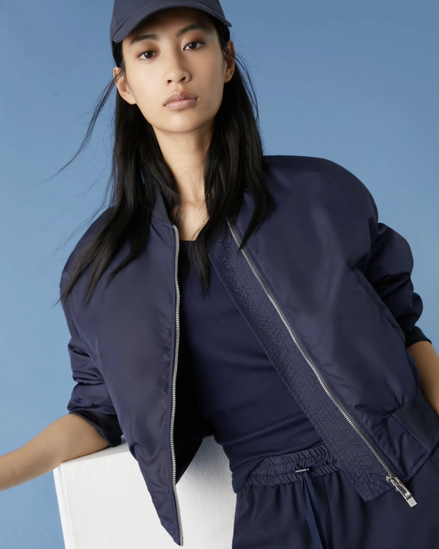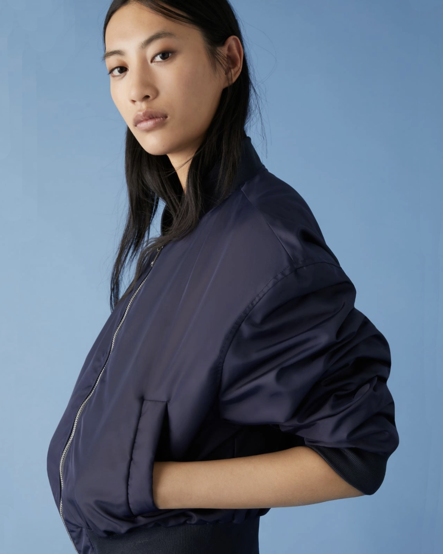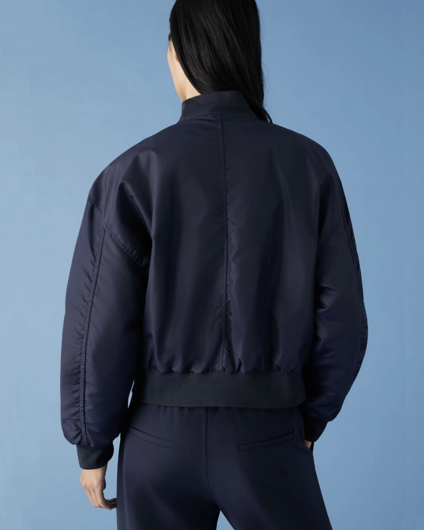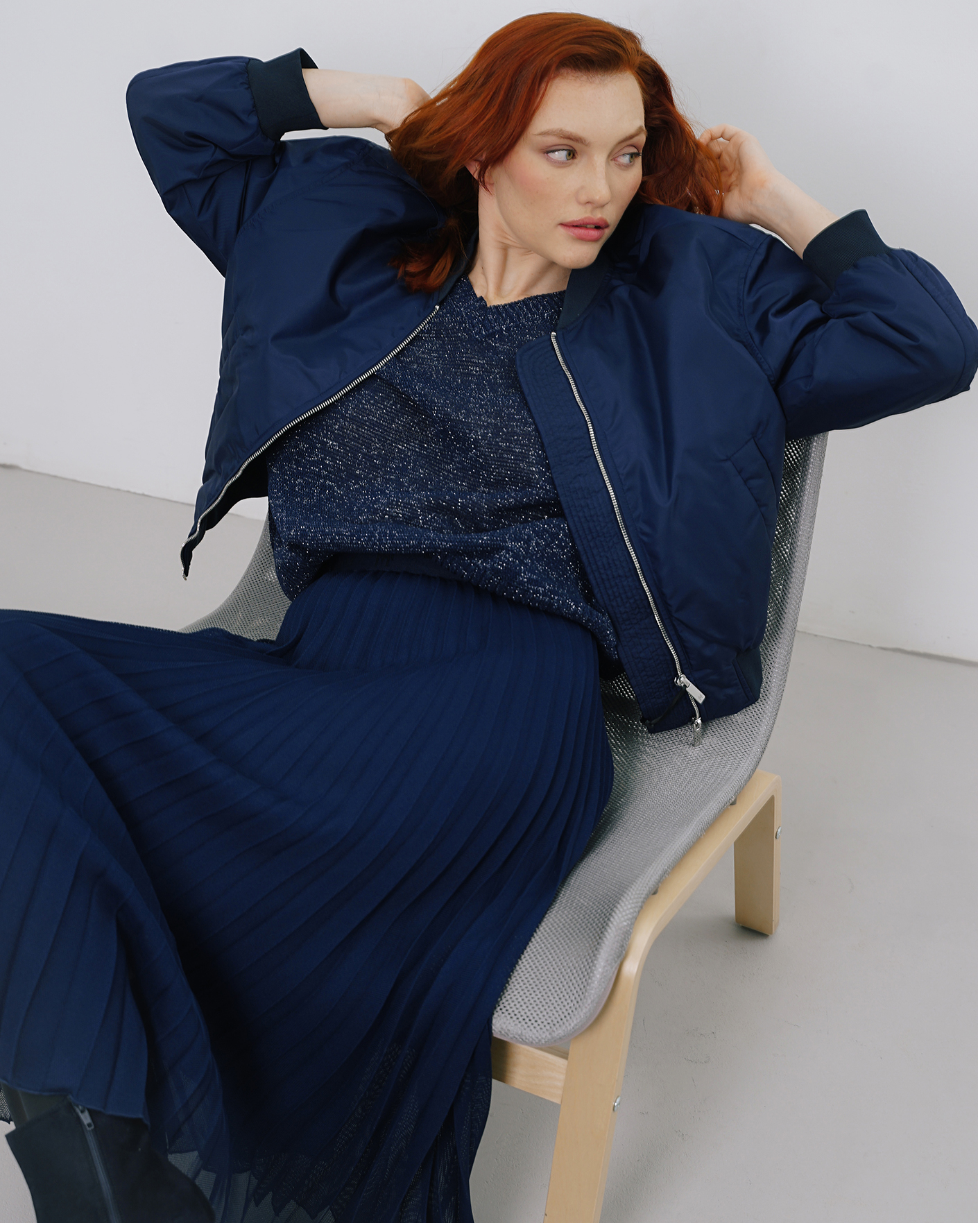 Утепленная куртка-бомбер Marella темно-синего цвета. Укороченная модель с небольшим воротником-стойка, манжетами и низом на резинке. Спущенная линия плеча, застежка на молнию, врезные карманы по бокам. Куртка-бомбер - универсальная вещь на каждый день.