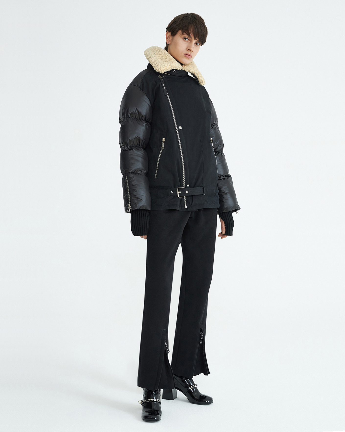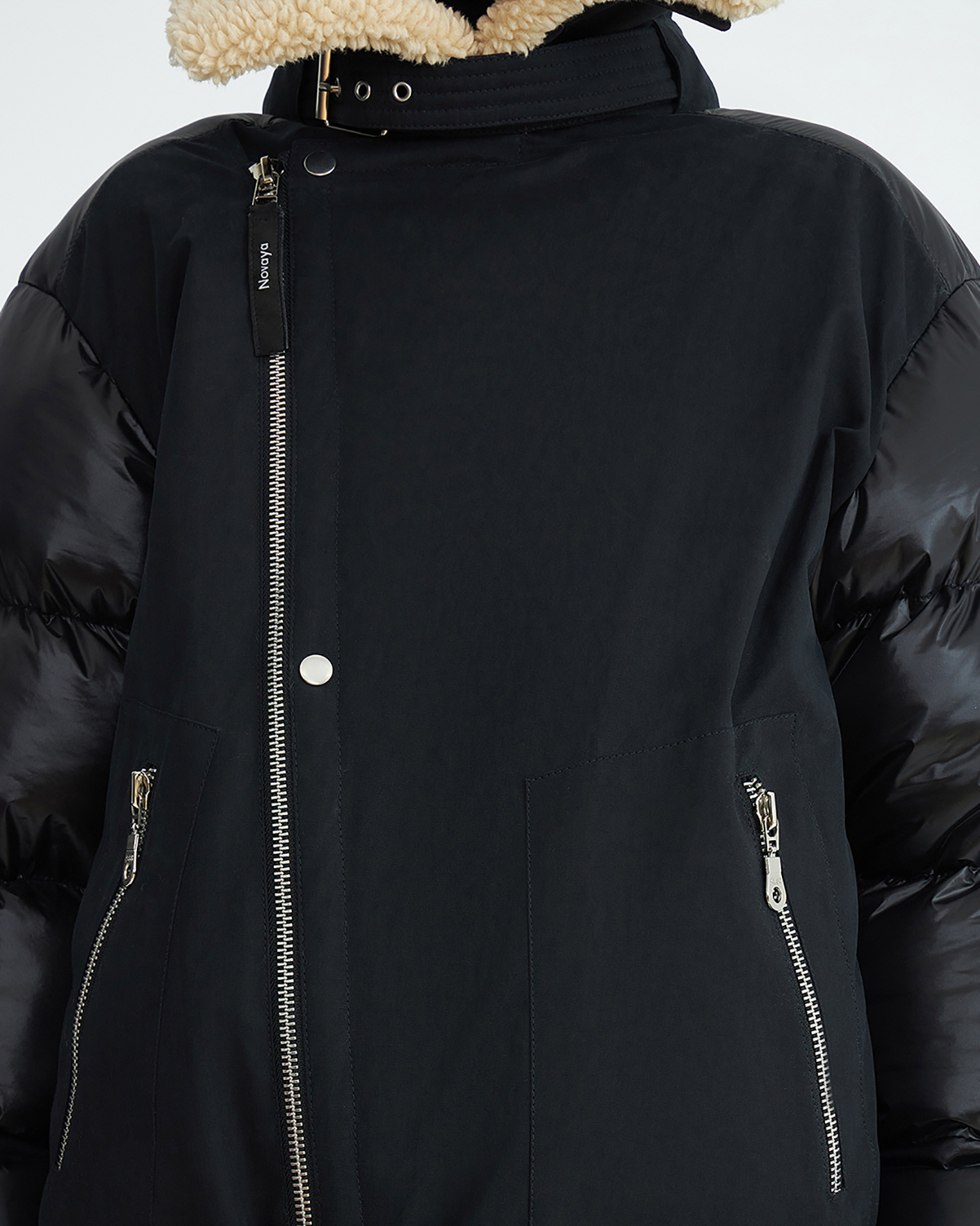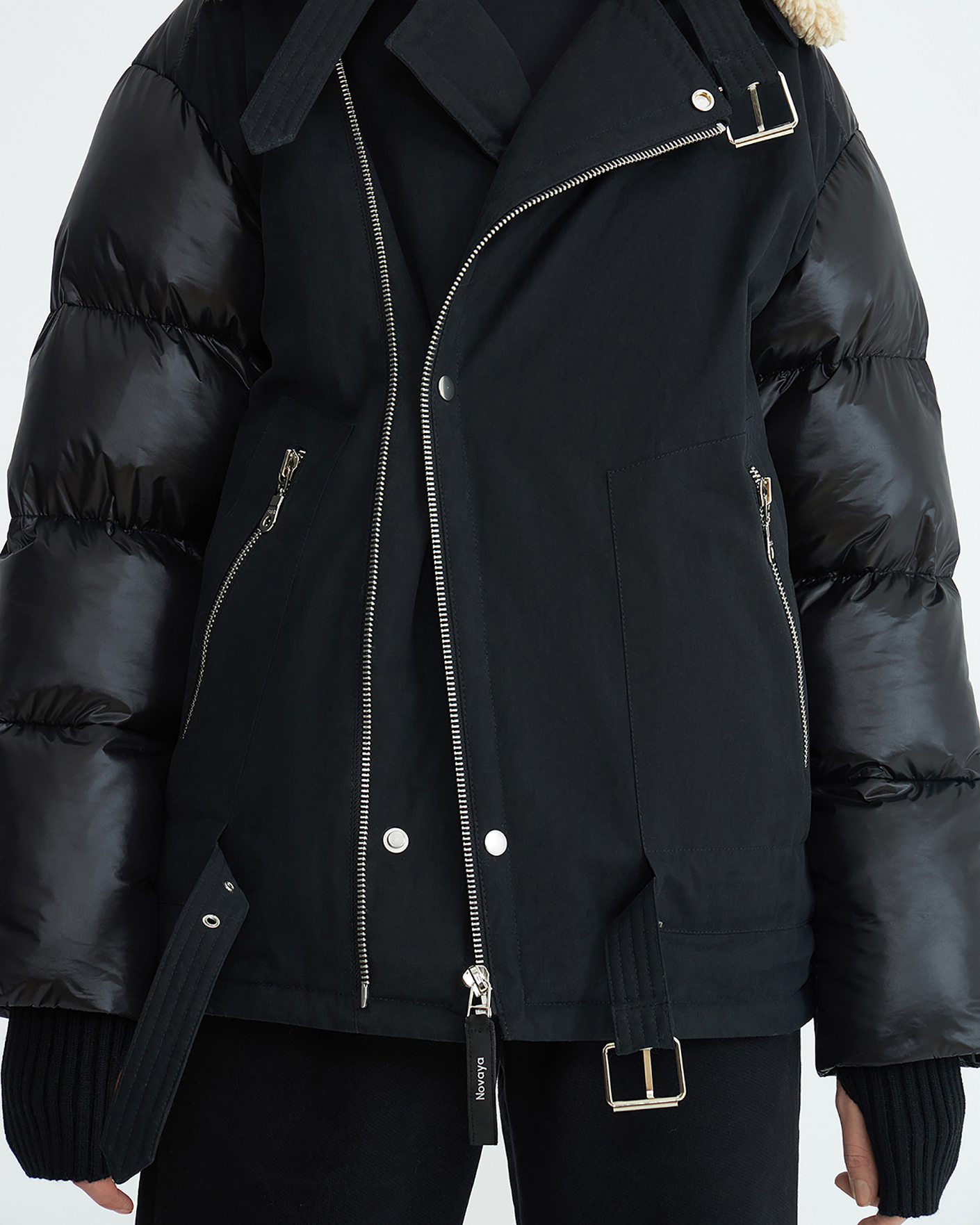 Теплая куртка-косуха Novaya черного цвета из комбинированных тканей. Модель с воротником-стойка, смещенная застежка на молнию, имеются карманы по бокам на молнии. также по низу вставной пояс с пряжкой. Стильная и универсальная куртка-косуха станет незаменимым спутником в холодную погоду.