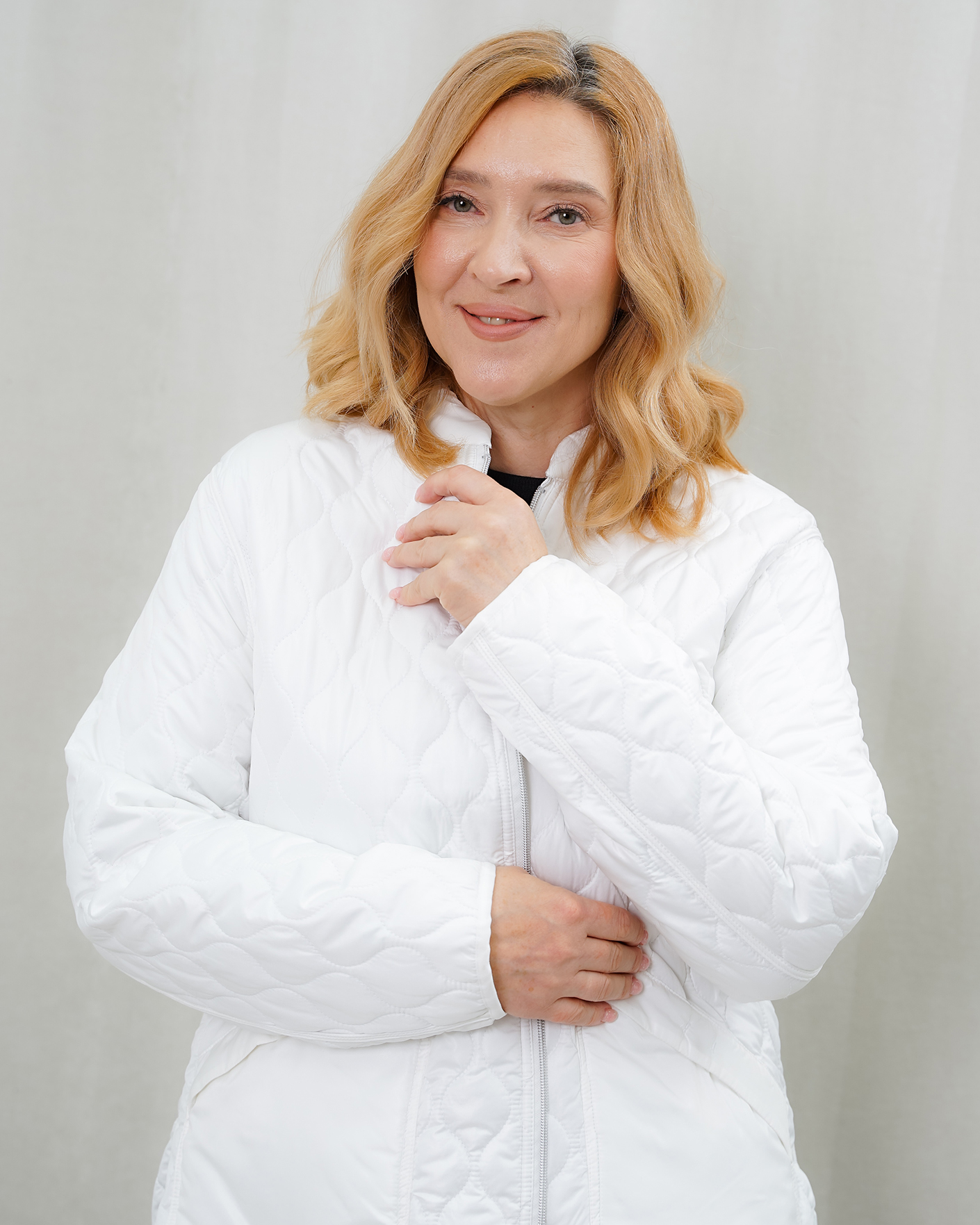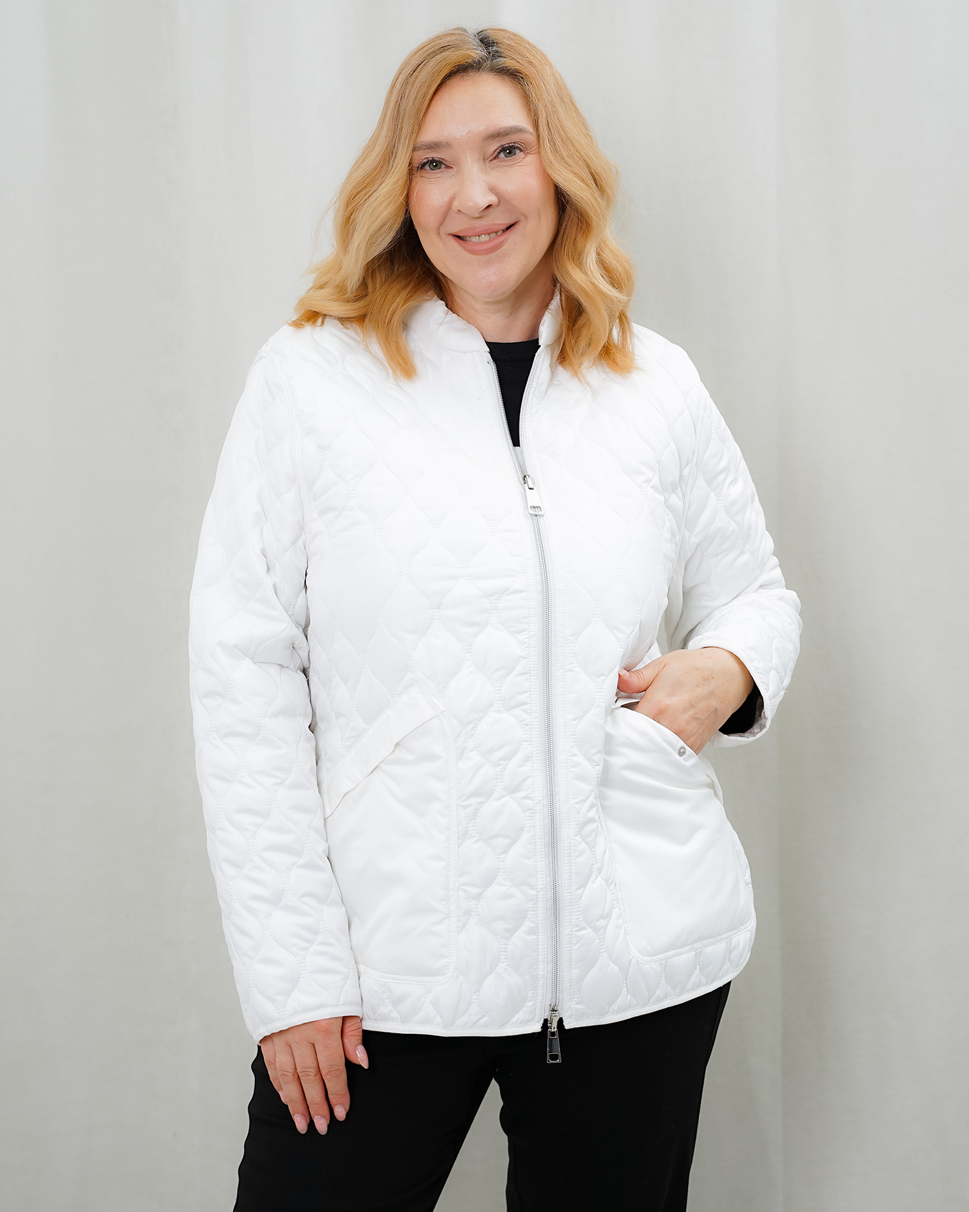 Утепленная куртка Barbara Lebek белого цвета в геометрическую стежку. Модель с воротником-стойка, застежка на молнию, большие карманы по бокам с клапанами и застежкой на скрытую клепку. Куртка - идеальный спутник в прохладную погоду.