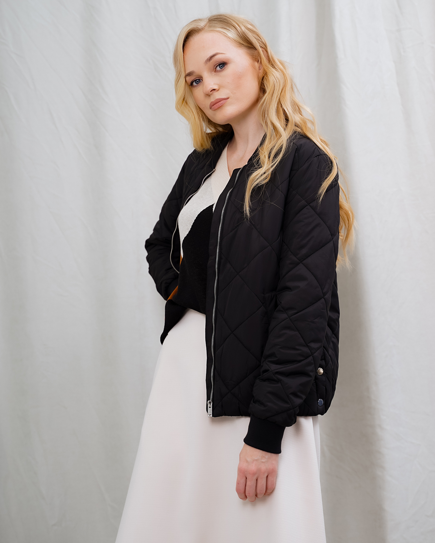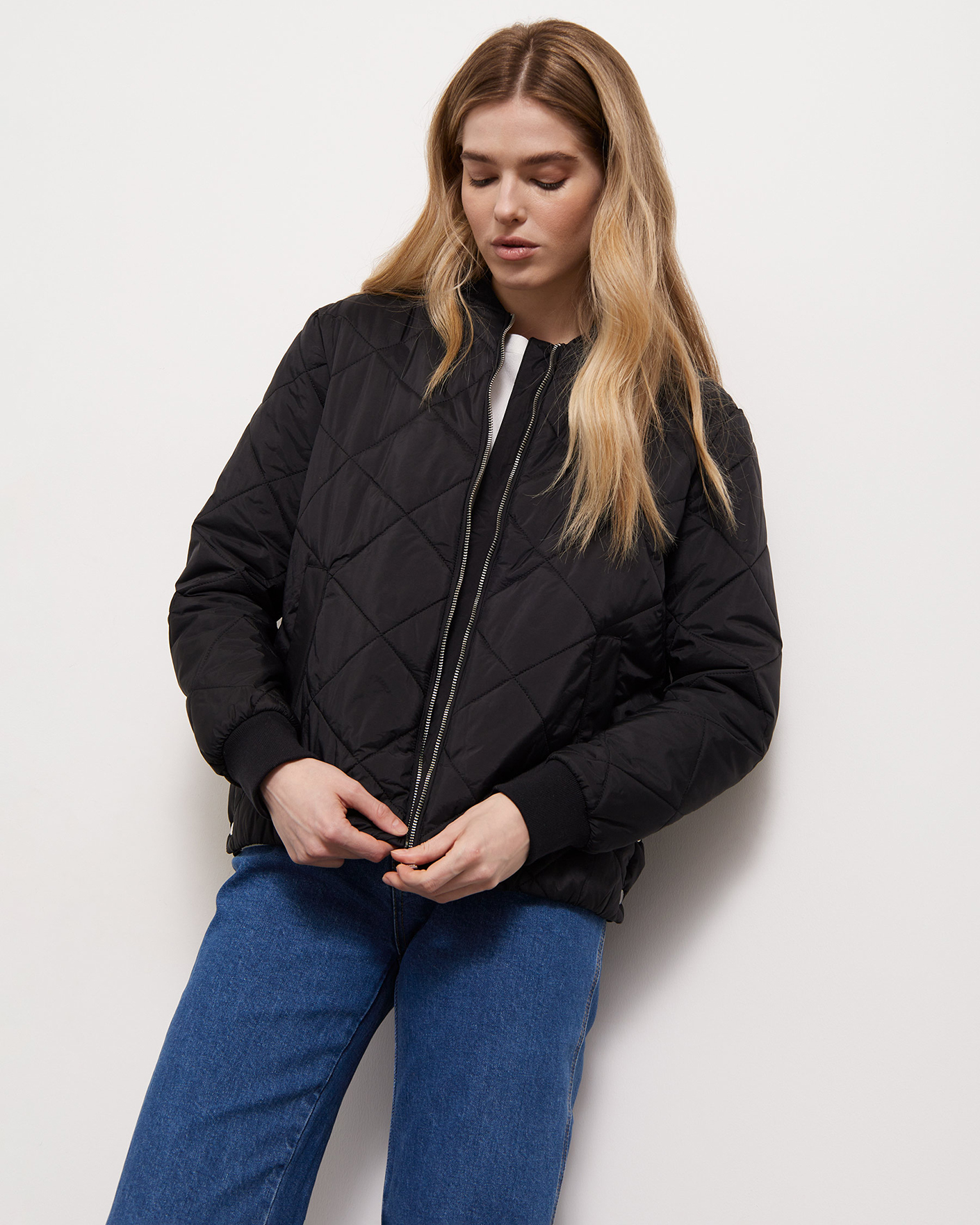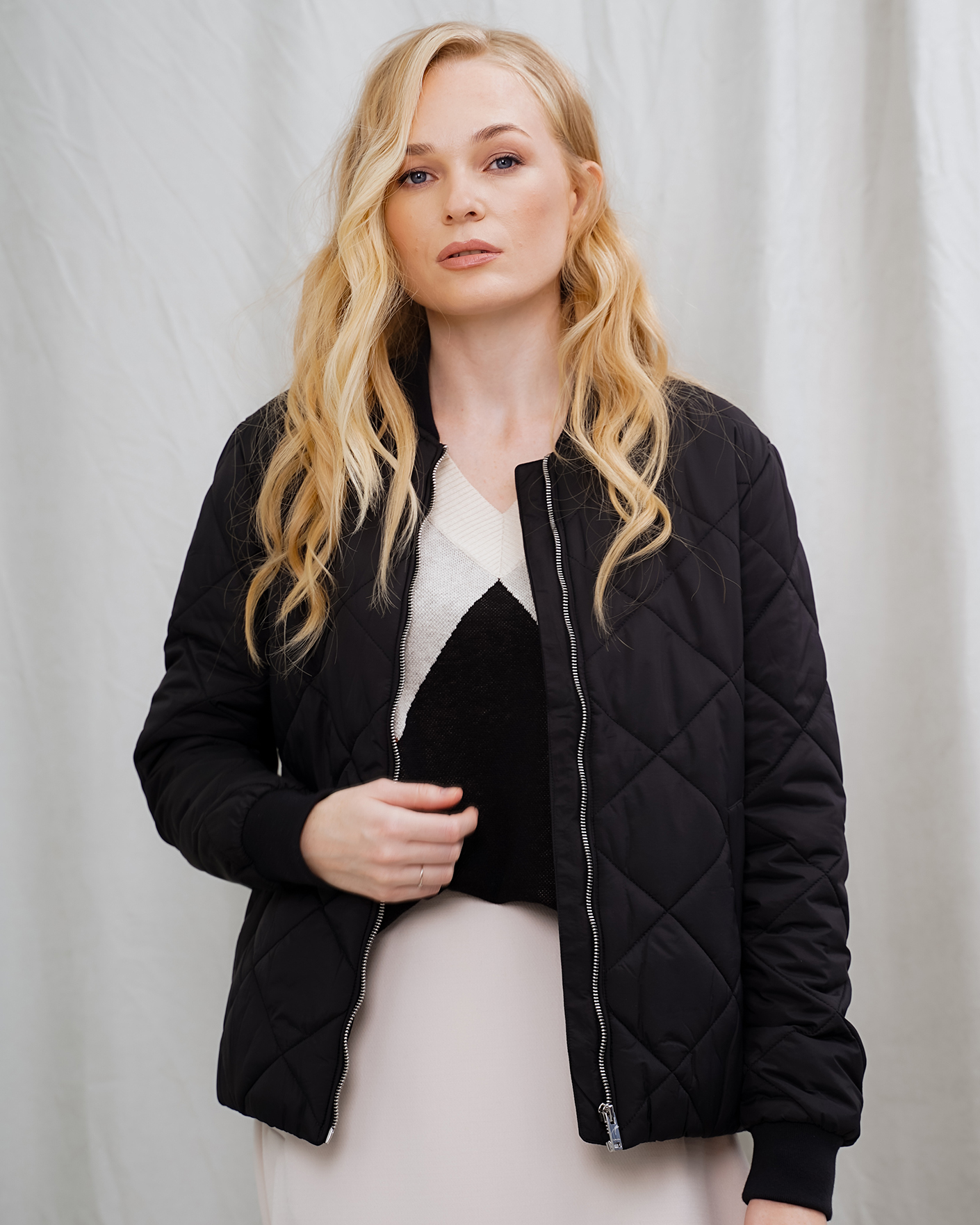 Куртка-бомбер Emka черного цвета в ромбическую стежку. Модель прямого силуэта, круглый вырез, застежка на молнию. меются карманы по бокам и длинные рукава с манжетами на резинке. Универсальный бомбер дополнит разные повседневные демисезонные образы.