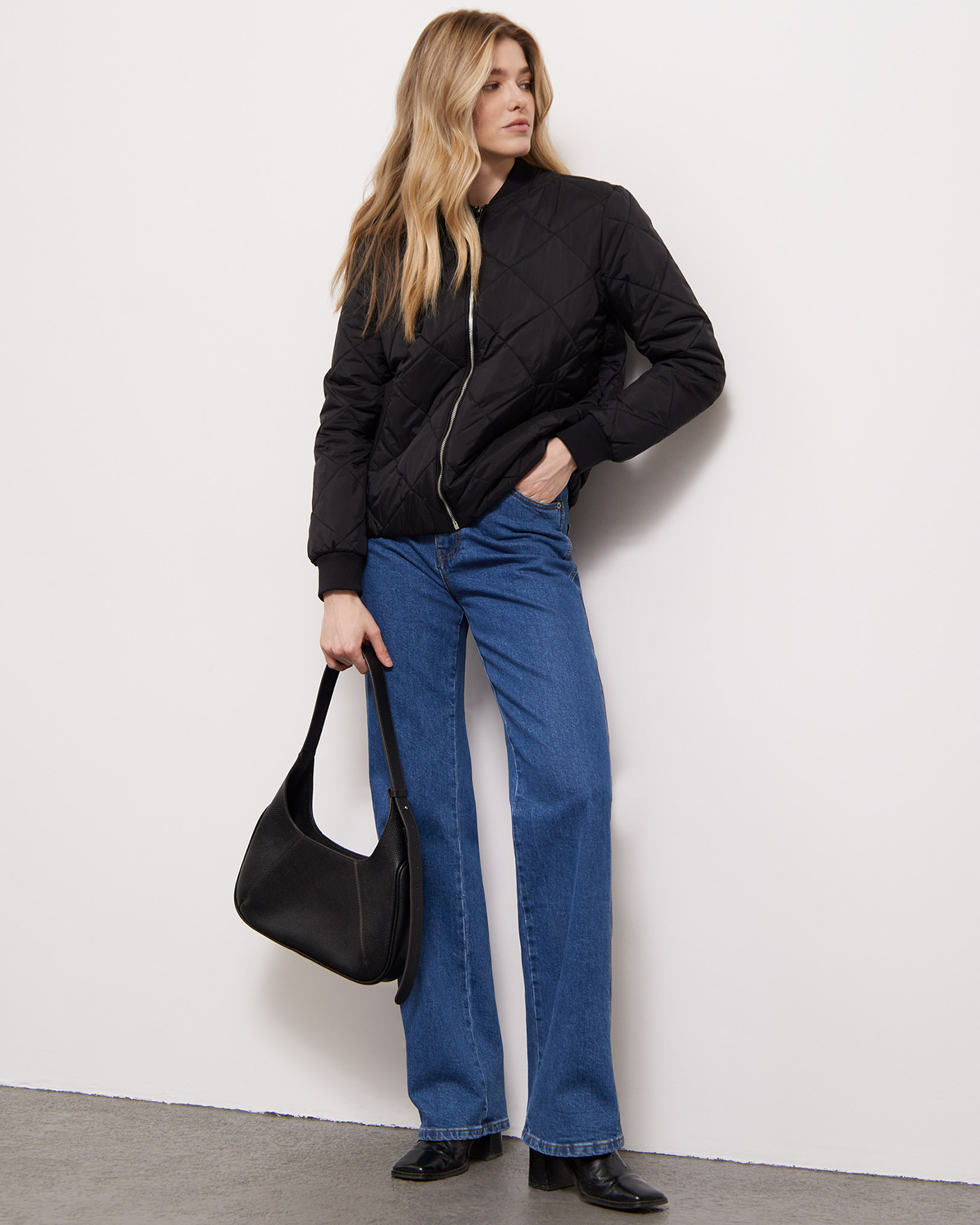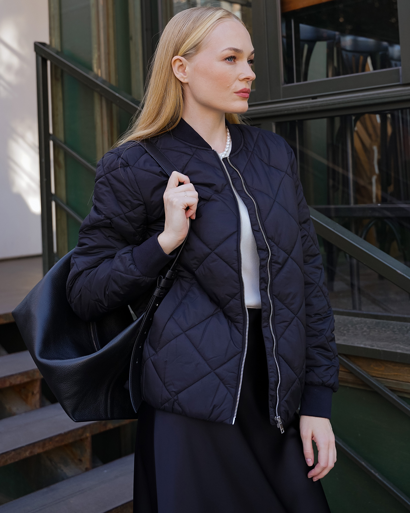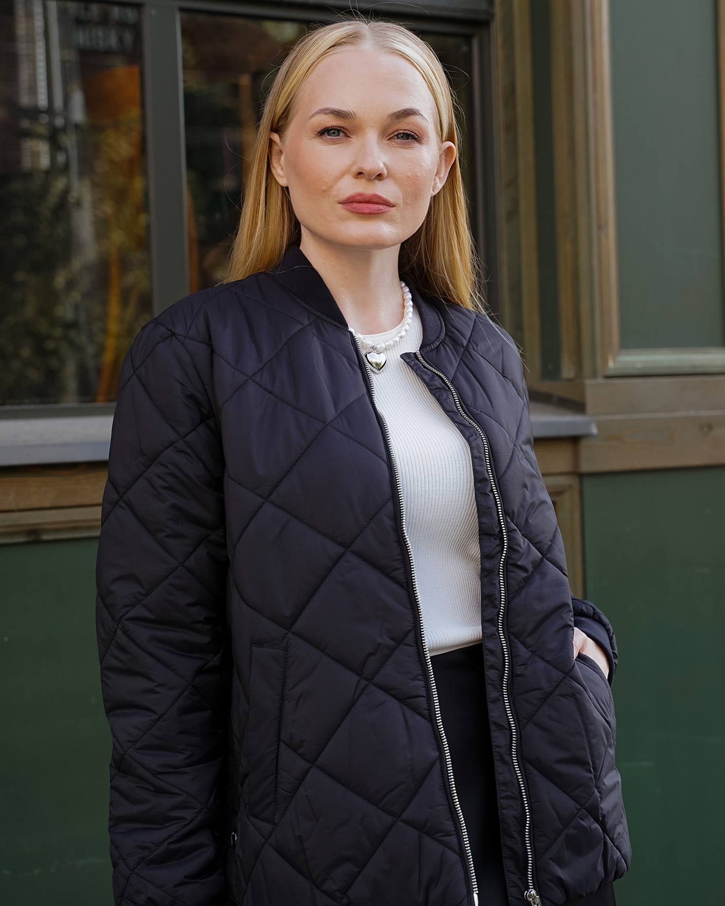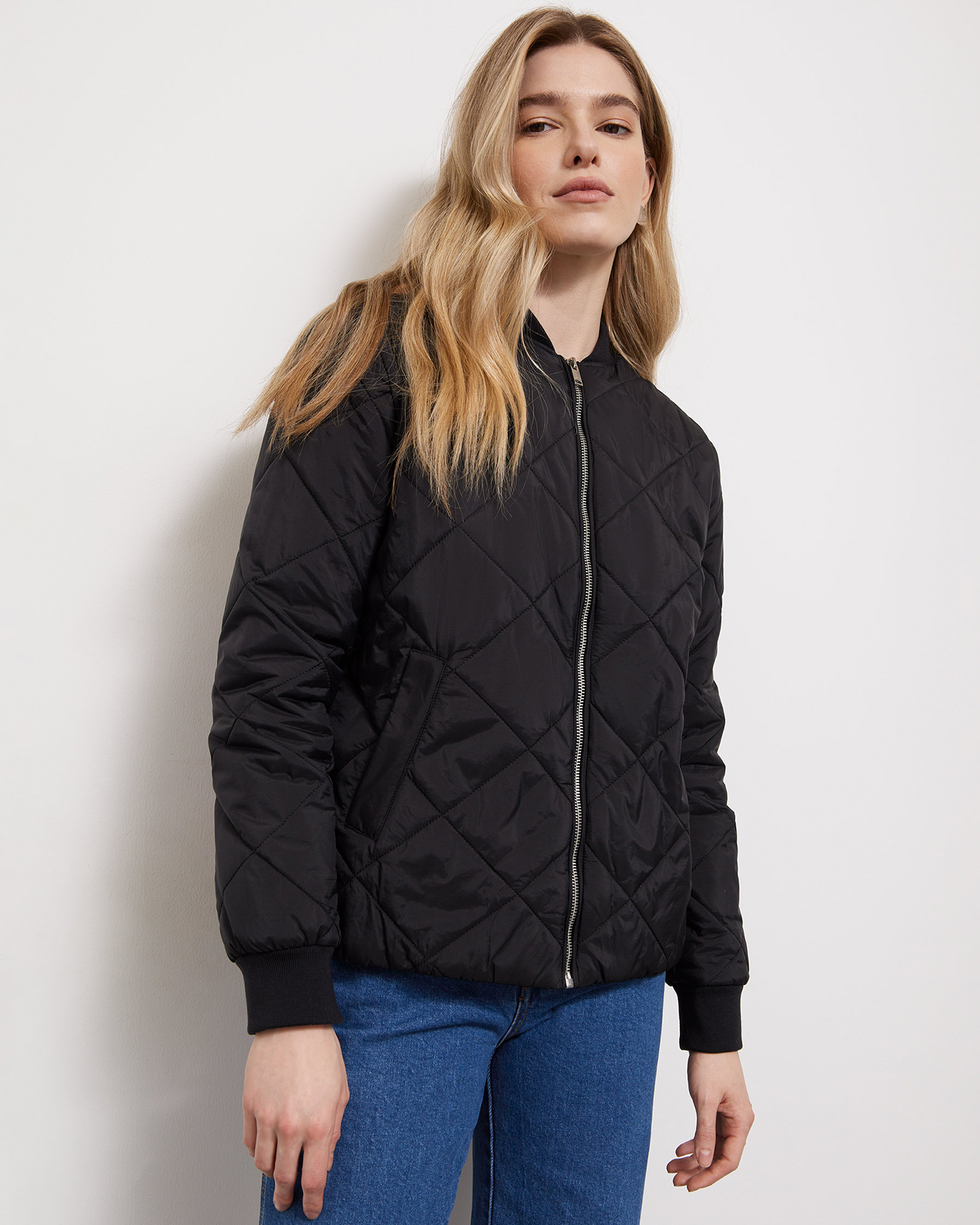 Куртка-бомбер Emka черного цвета в ромбическую стежку. Модель прямого силуэта, круглый вырез, застежка на молнию. меются карманы по бокам и длинные рукава с манжетами на резинке. Универсальный бомбер дополнит разные повседневные демисезонные образы.