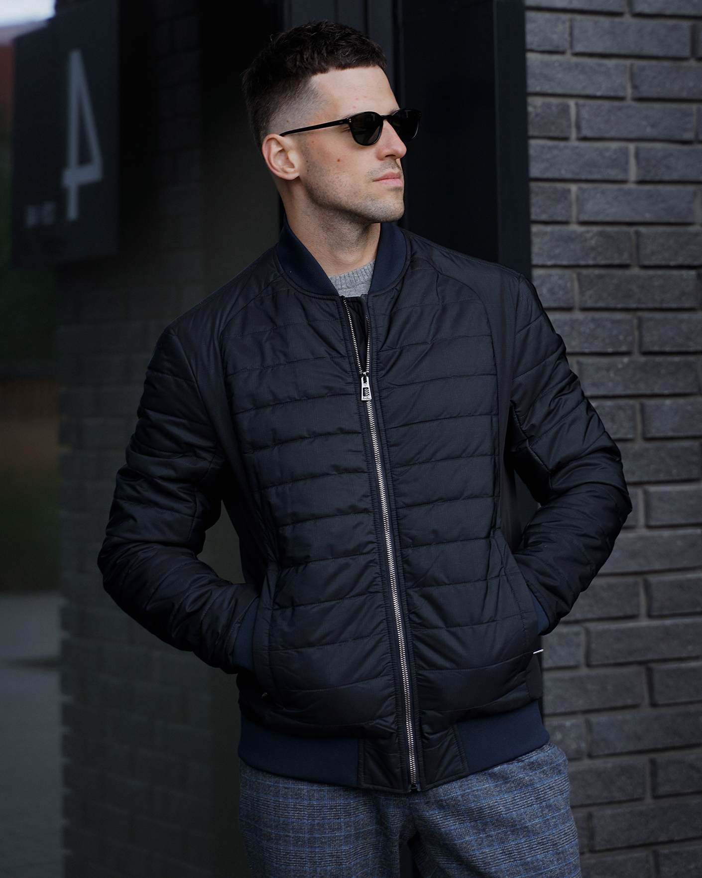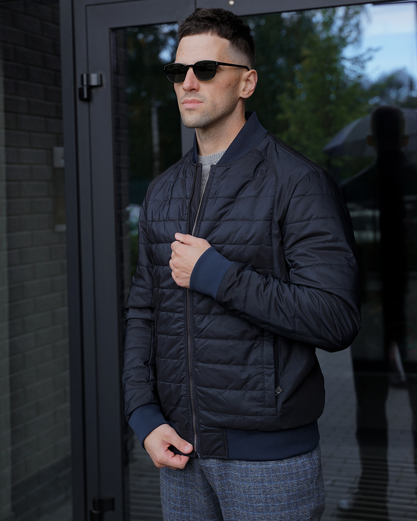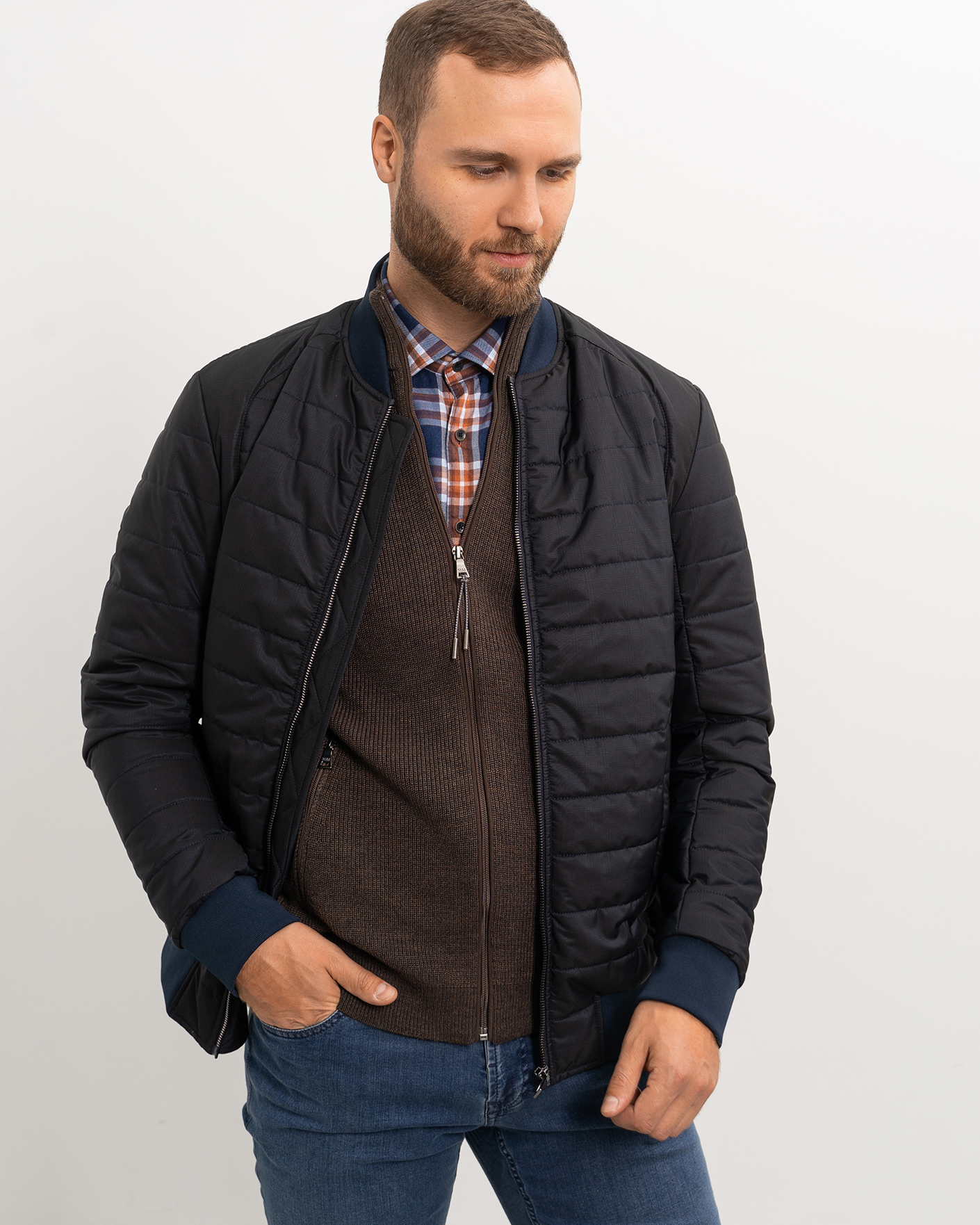 Утепленная куртка-бомбер Aero Giacca черно-синего цвета в горизонтальную стежку. Удлиненный ворот, манжеты и низ на тонкой резинке синего цвета. Застежка и боковые карманы на молниях. Куртка-бомбер станет идеальным дополнением вашему гардеробу в стиле casual.