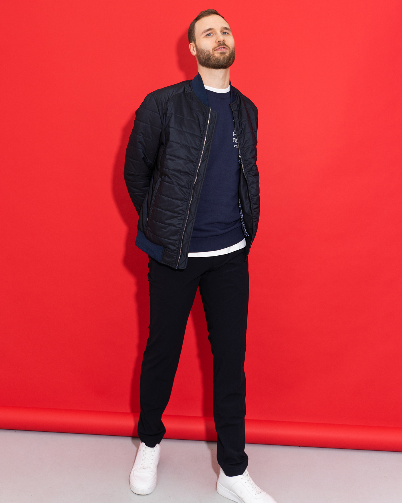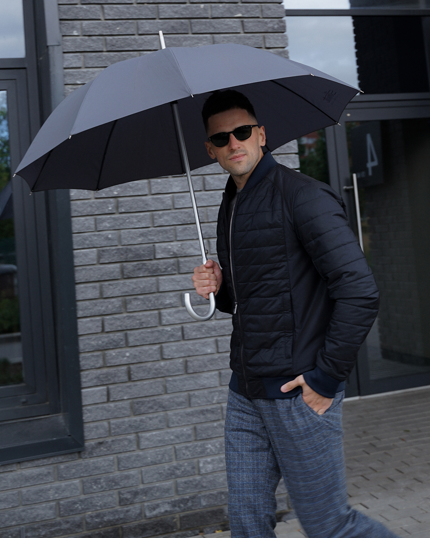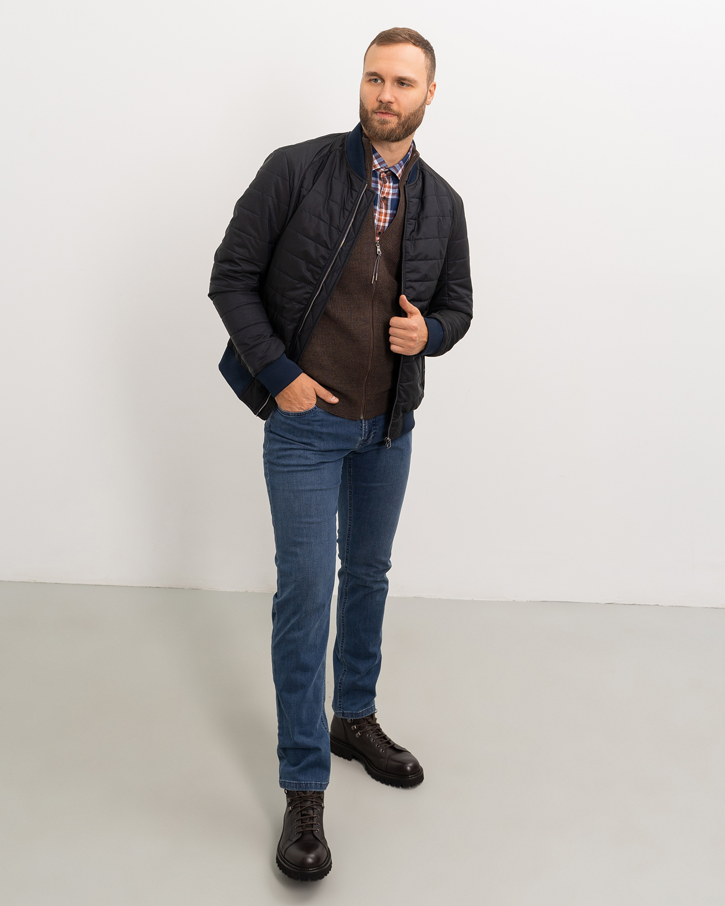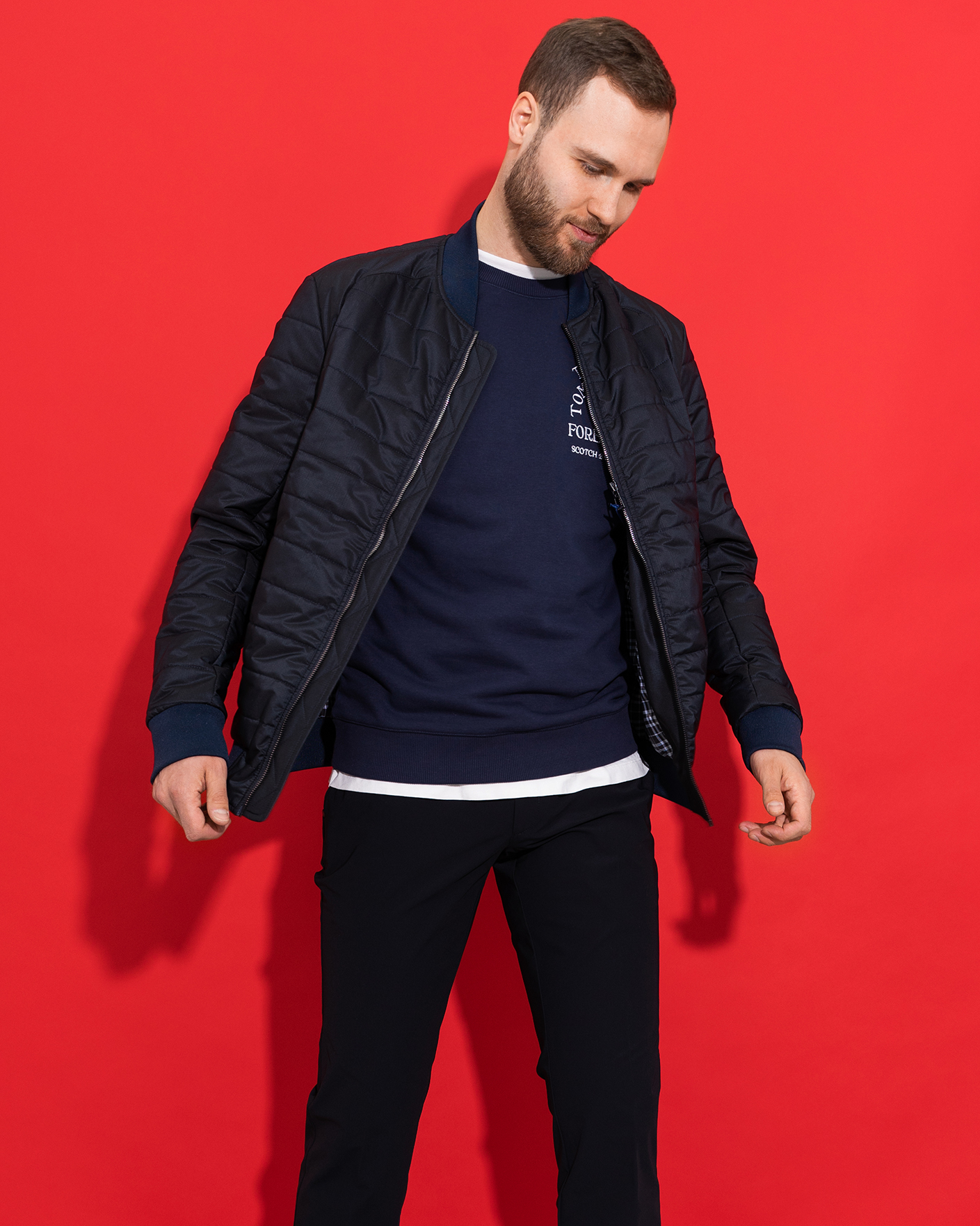 Утепленная куртка-бомбер Aero Giacca черно-синего цвета в горизонтальную стежку. Удлиненный ворот, манжеты и низ на тонкой резинке синего цвета. Застежка и боковые карманы на молниях. Куртка-бомбер станет идеальным дополнением вашему гардеробу в стиле casual.