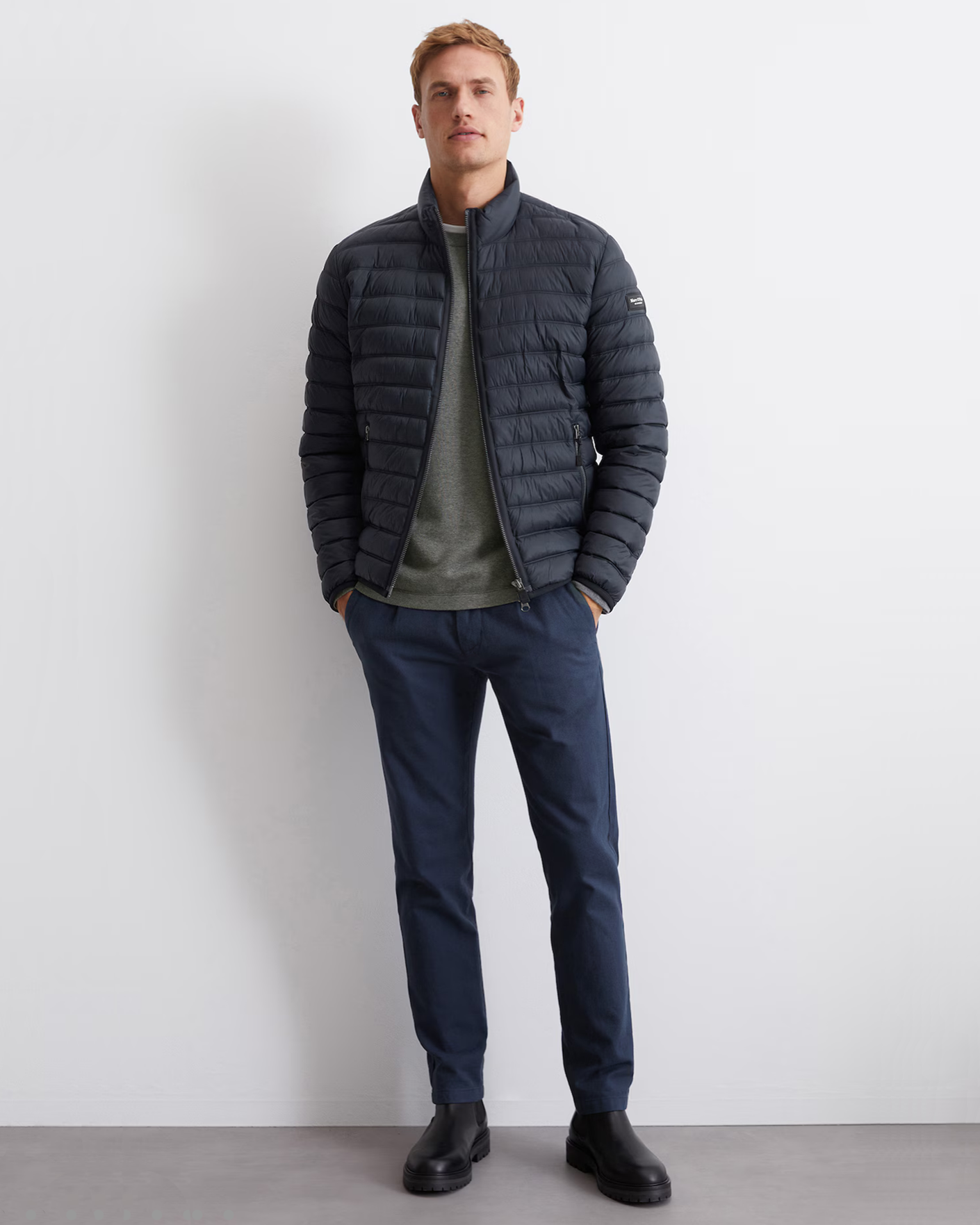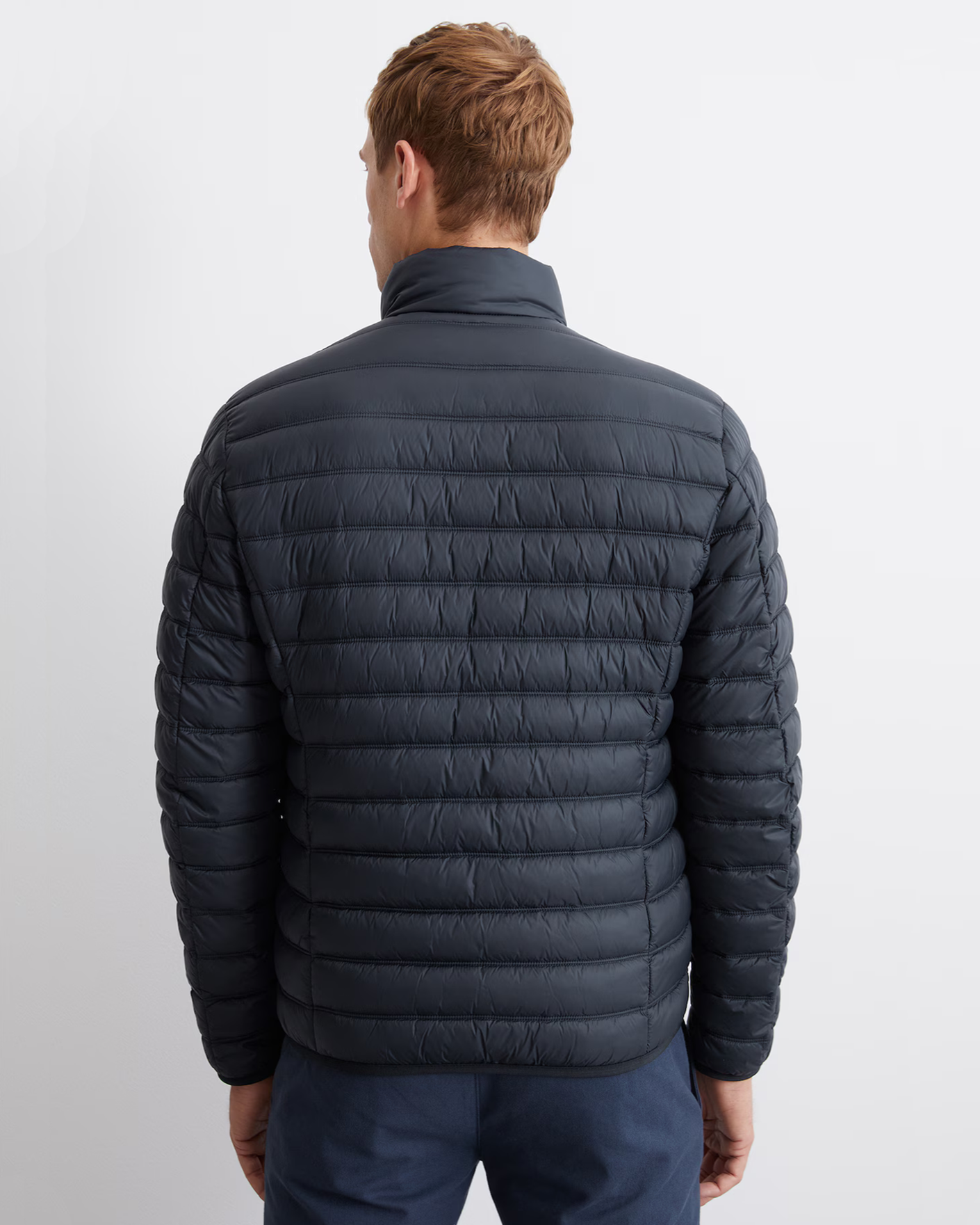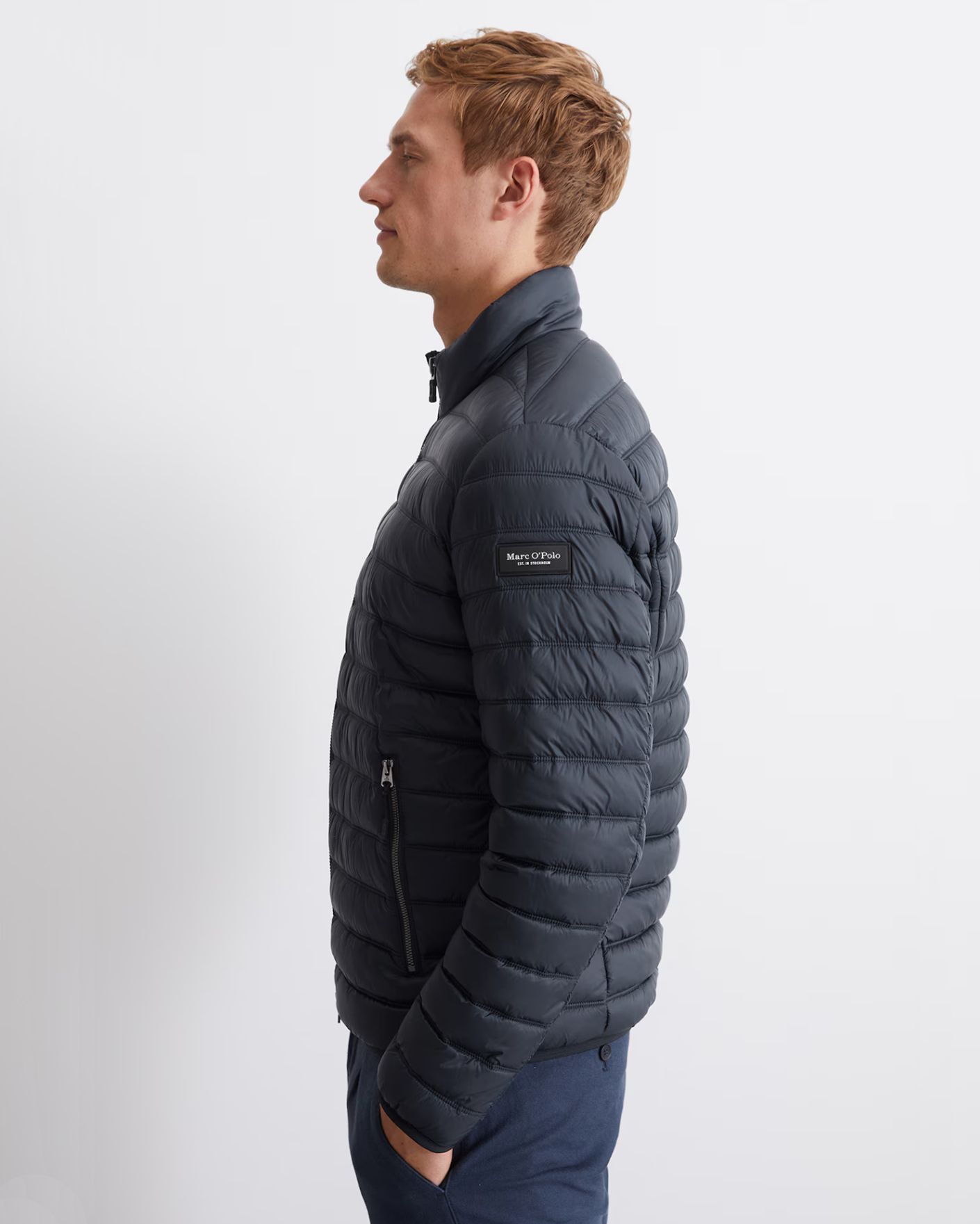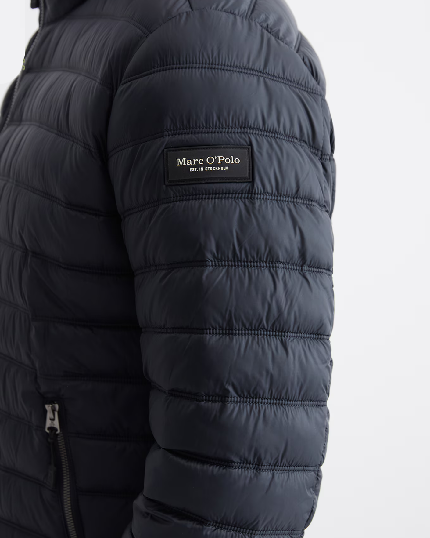 Утепленная куртка Marc O'Polo темно-синего цвета в горизонтальную полосу. Модель с воротником-стойка, застежка и боковые карманы на молнии. Куртка - универсальная вещь повседневного гардероба.
