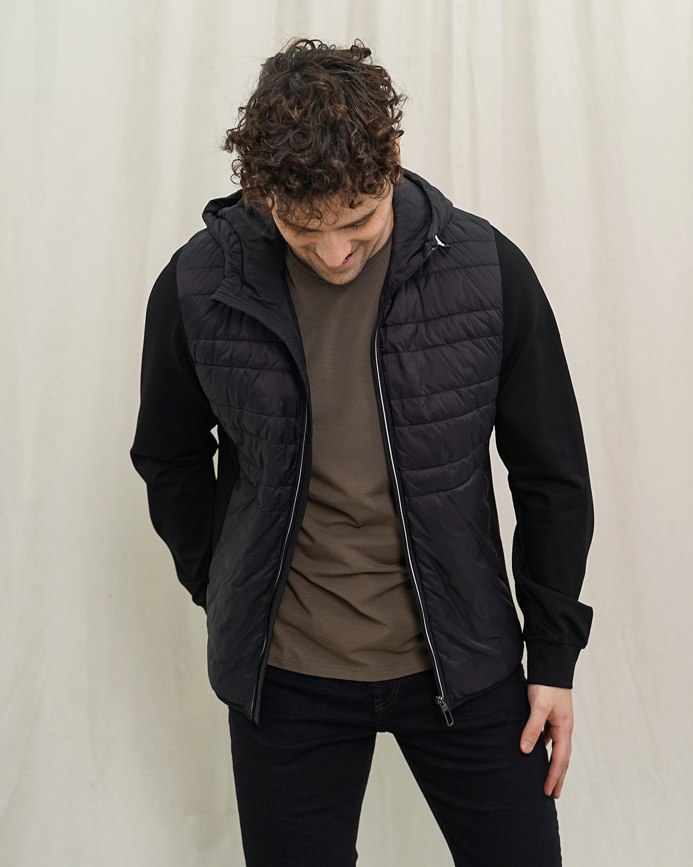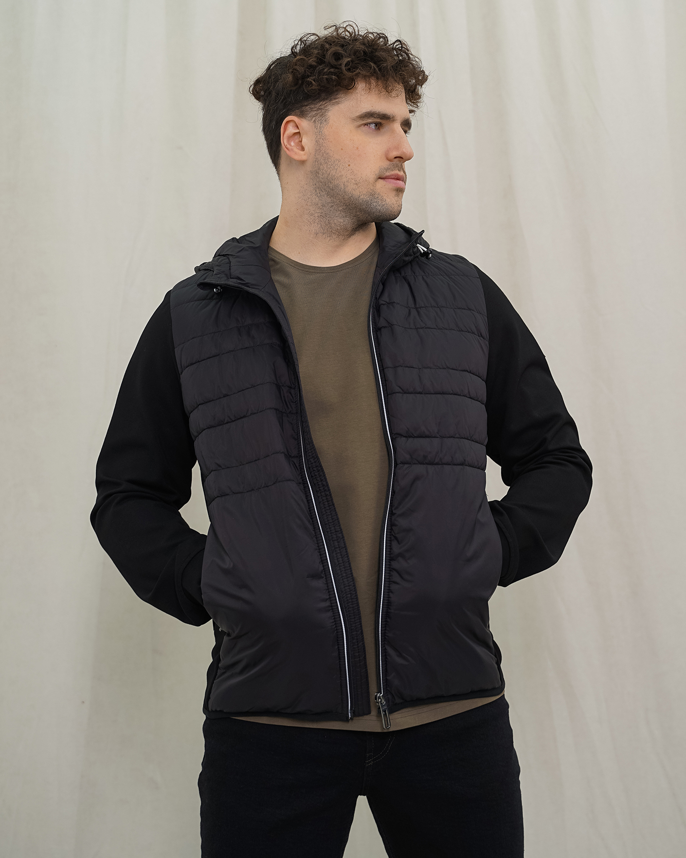 Комбинированная куртка Digel черного цвета в горизонтальную стежку. Модель с воротником-стойка с фиксированным регулируемым капюшоном. Застежка и боковые карманы на молнии. Стильная курта отлично впишется в повседневный гардероб.