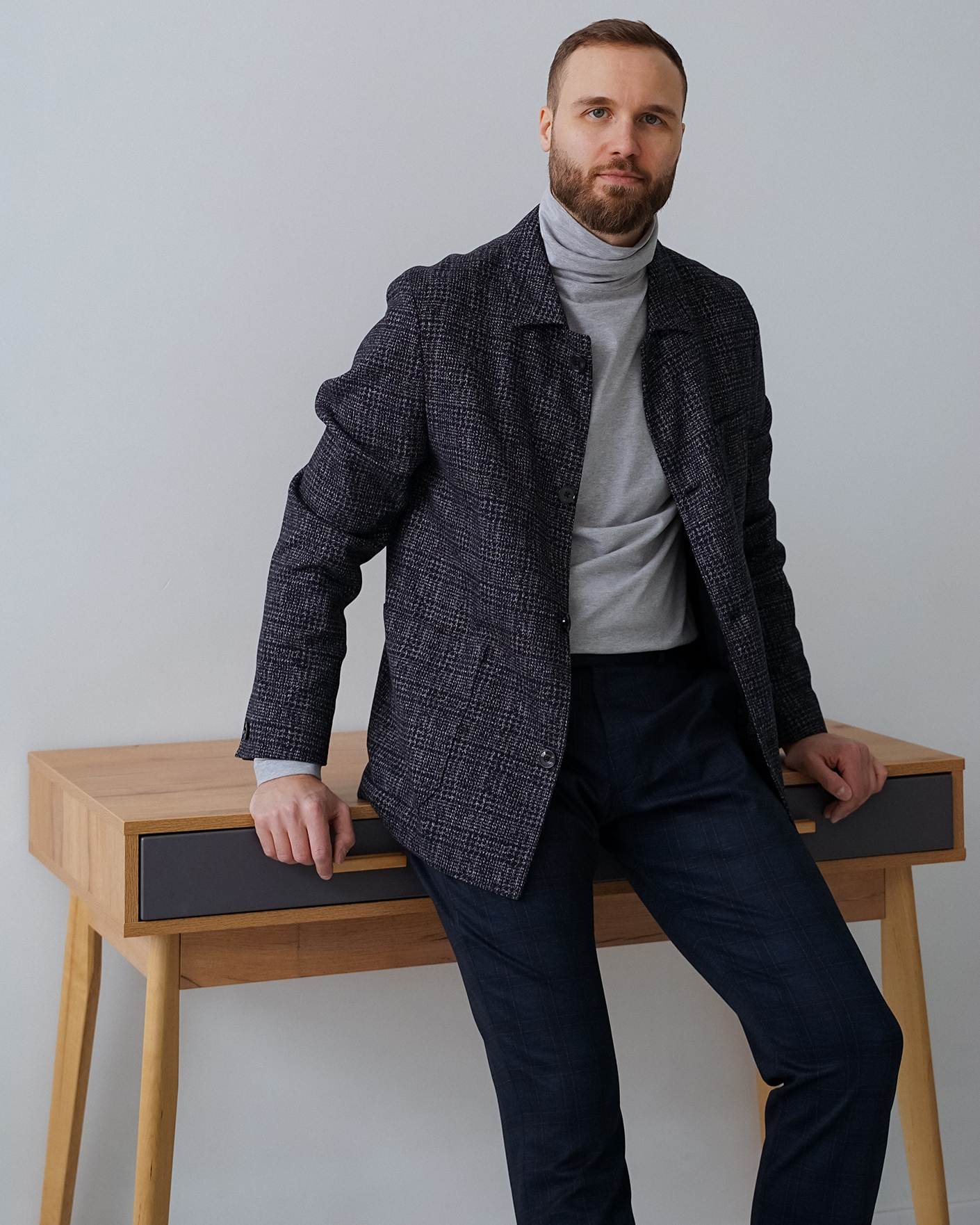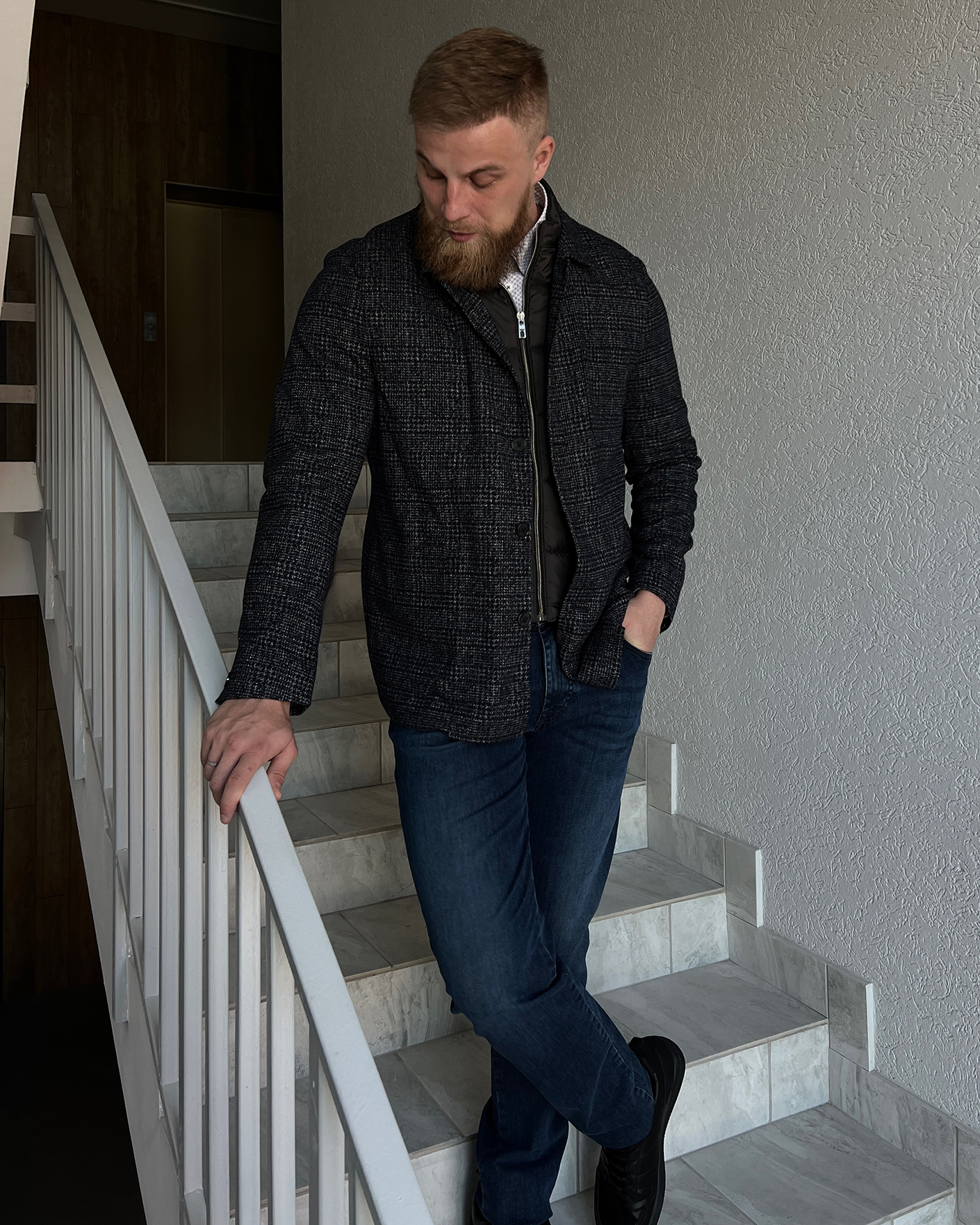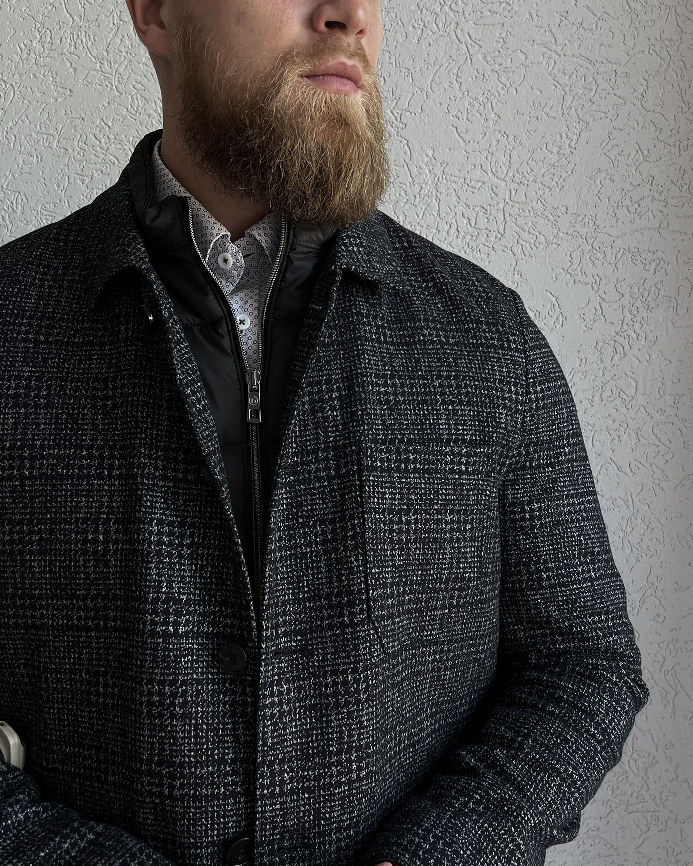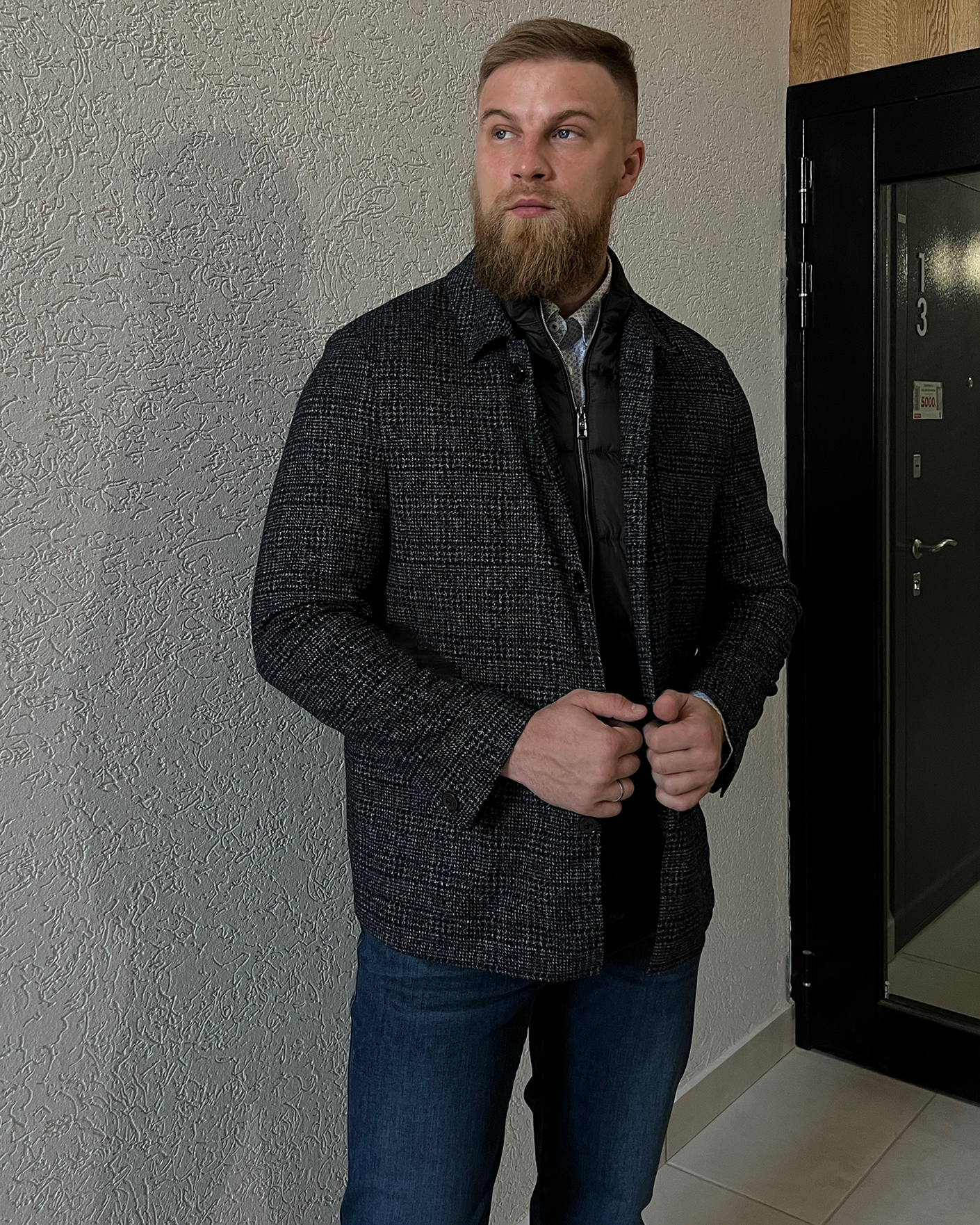 Куртка Bugatti серо-синего цвета в клетку и рисунок гусиные лапки. Модель с отложным воротником, застежка напуговицы, имеется стеганая манишка на молнии. Стильная куртка отлично впишется в ваш гардероб.
