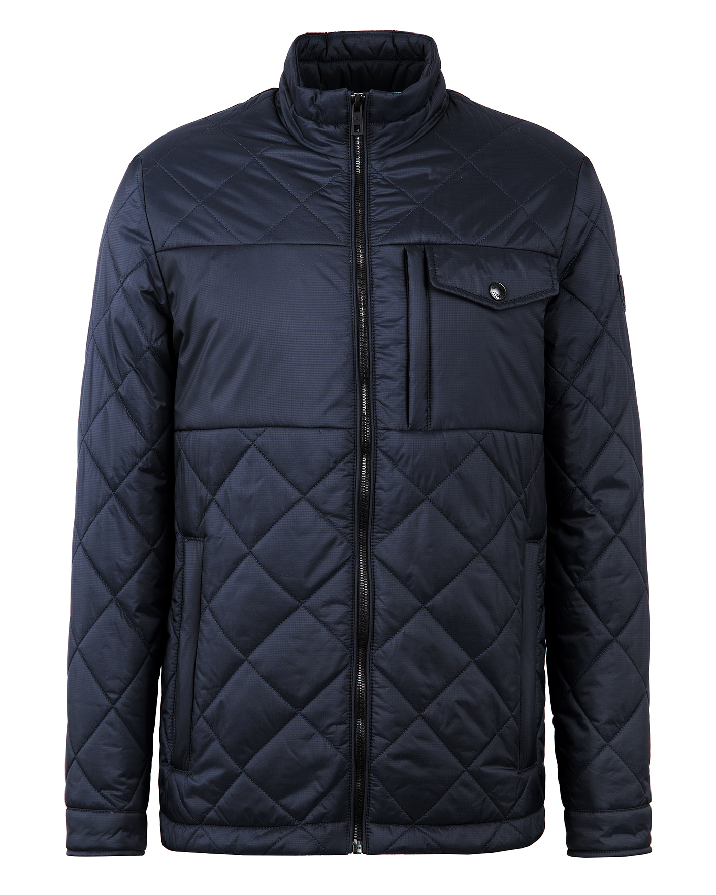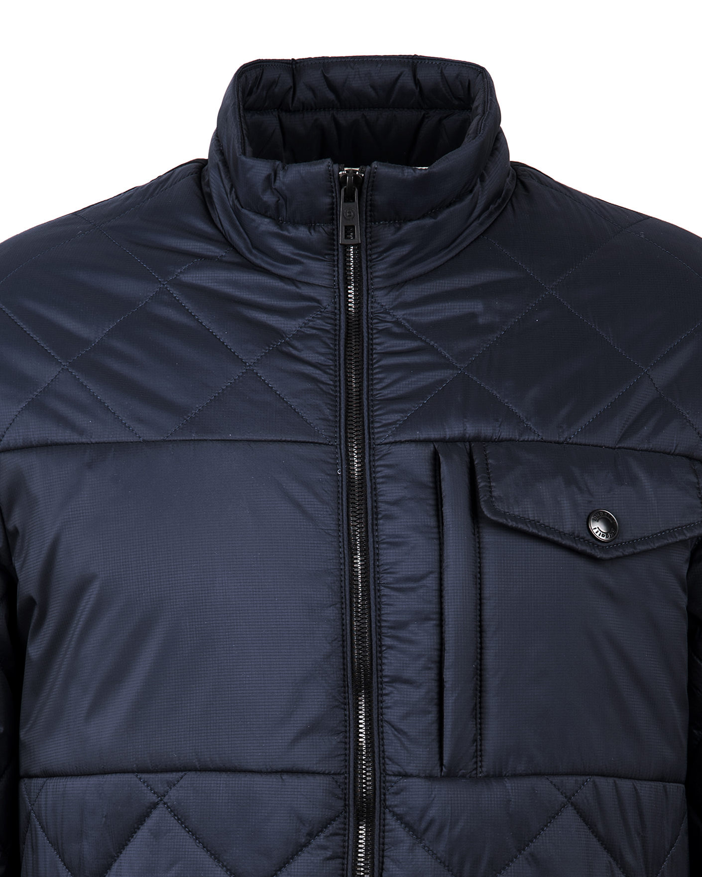 Утепленная куртка Bugatti синего цвета в ромбическуюстежку. Модель с воротником-стойка, застежка на молнию черного цветка. Имеются врезные карманы по бокам на молнии, а также наклданой карман на груди с клапаном и молнией. Универсальная куртка на каждыйдень.