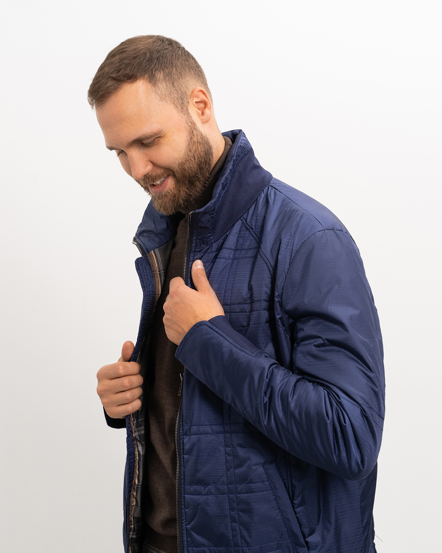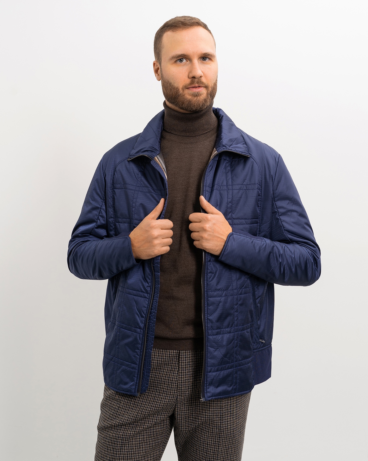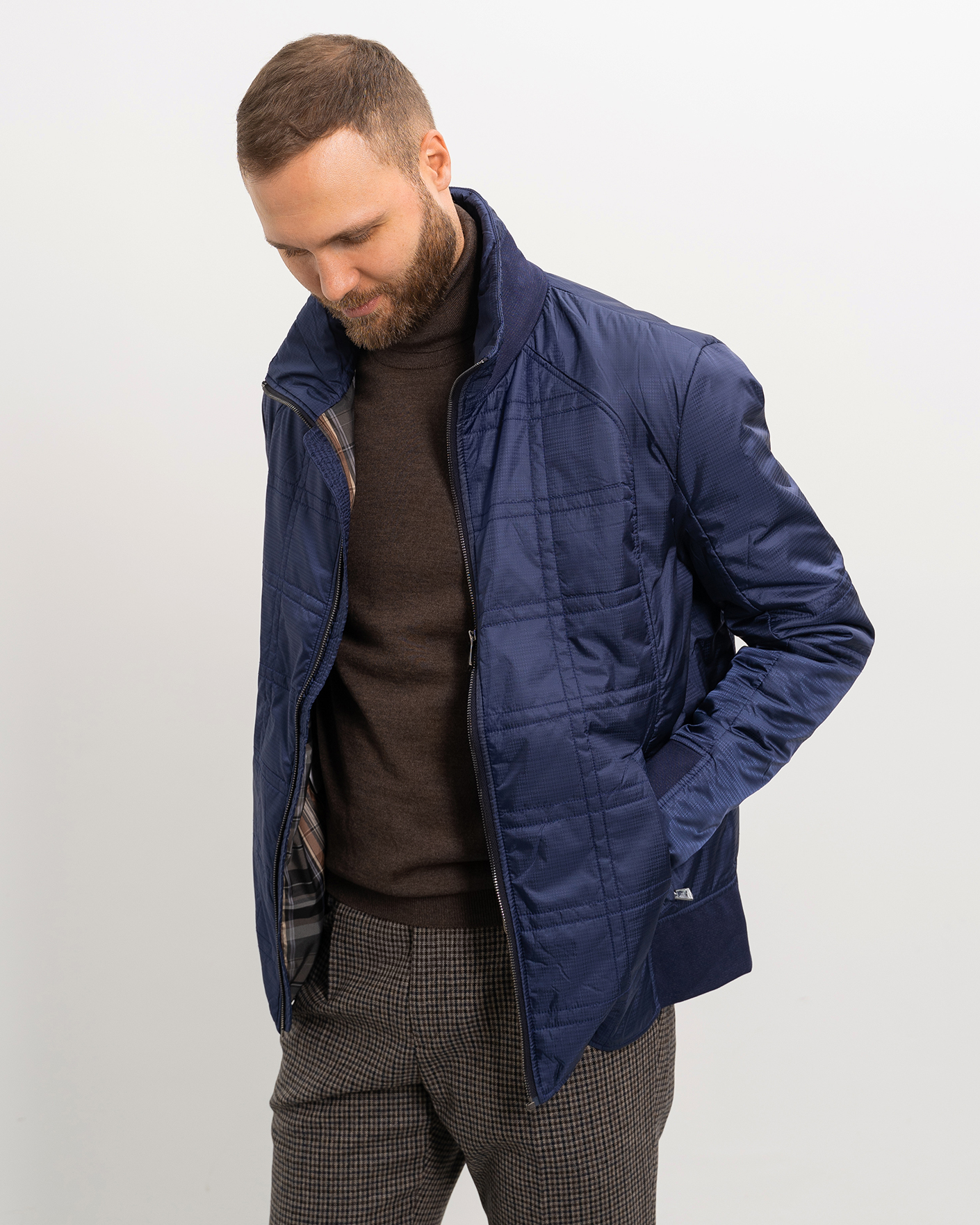 Утепленная куртка Aero Giacca синего цвета в оптический рисунок. Укороченная модель с внутренним подкладом в крупную клетку, воротник-стойка, застежка и боковые карманы на молниях. Куртка отлично впишется в ваш повседневный гардероб.