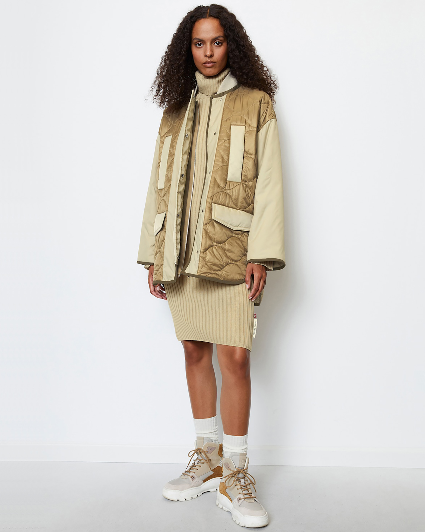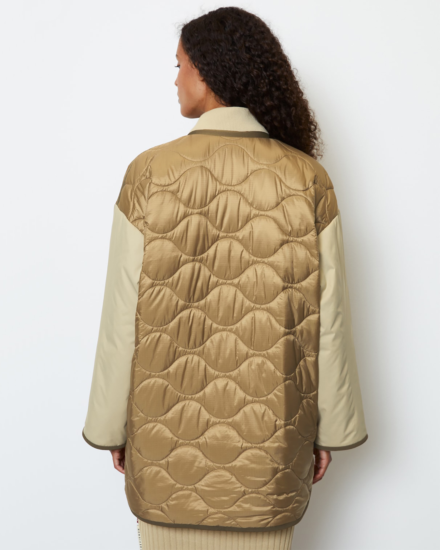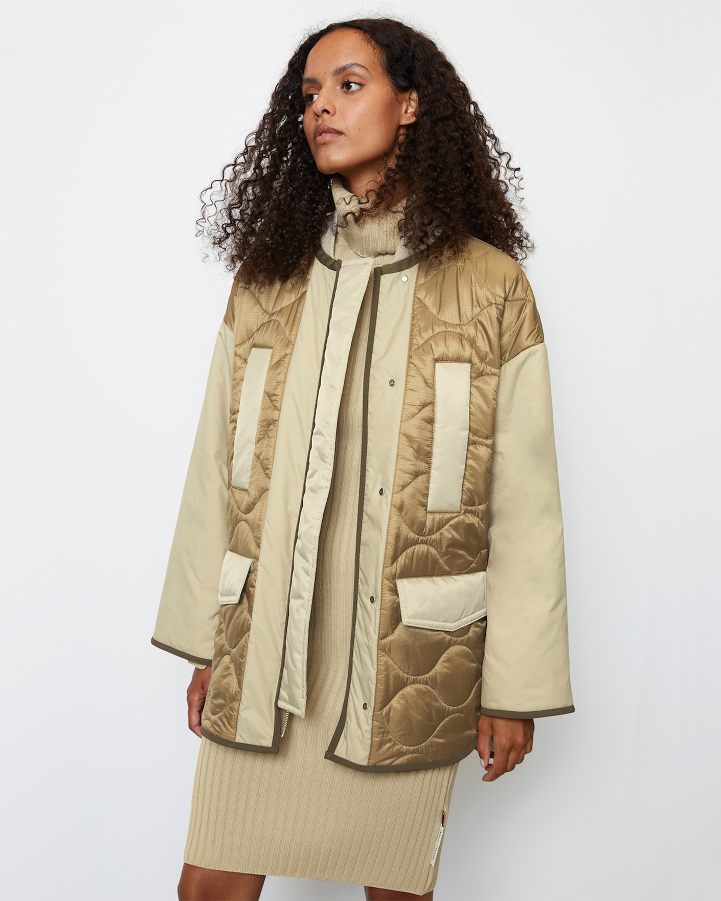 Утепленная куртка Marc O'Polo бежевого цвета выполнена из комбинированных текстур. Стеганая модель с круглым вырезом на ребристой резинке, застежка на скрытую молнию и планку на кнопки. Спущенная линия плеча с широкими рукавами. Также имеются врезные каманы на груди и с клапанами по бокам. Стильная куртка отлично впишется в ваш гардероб.