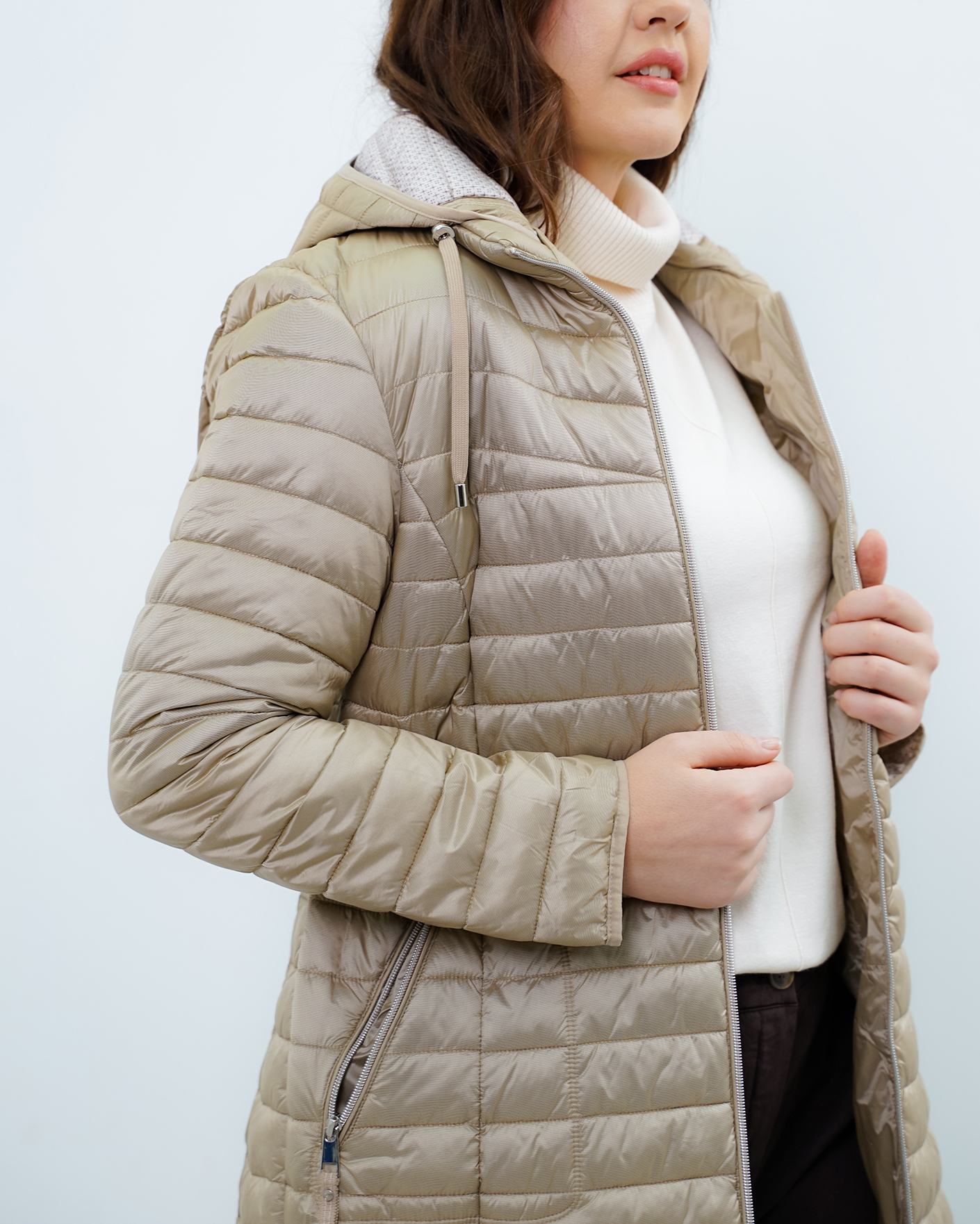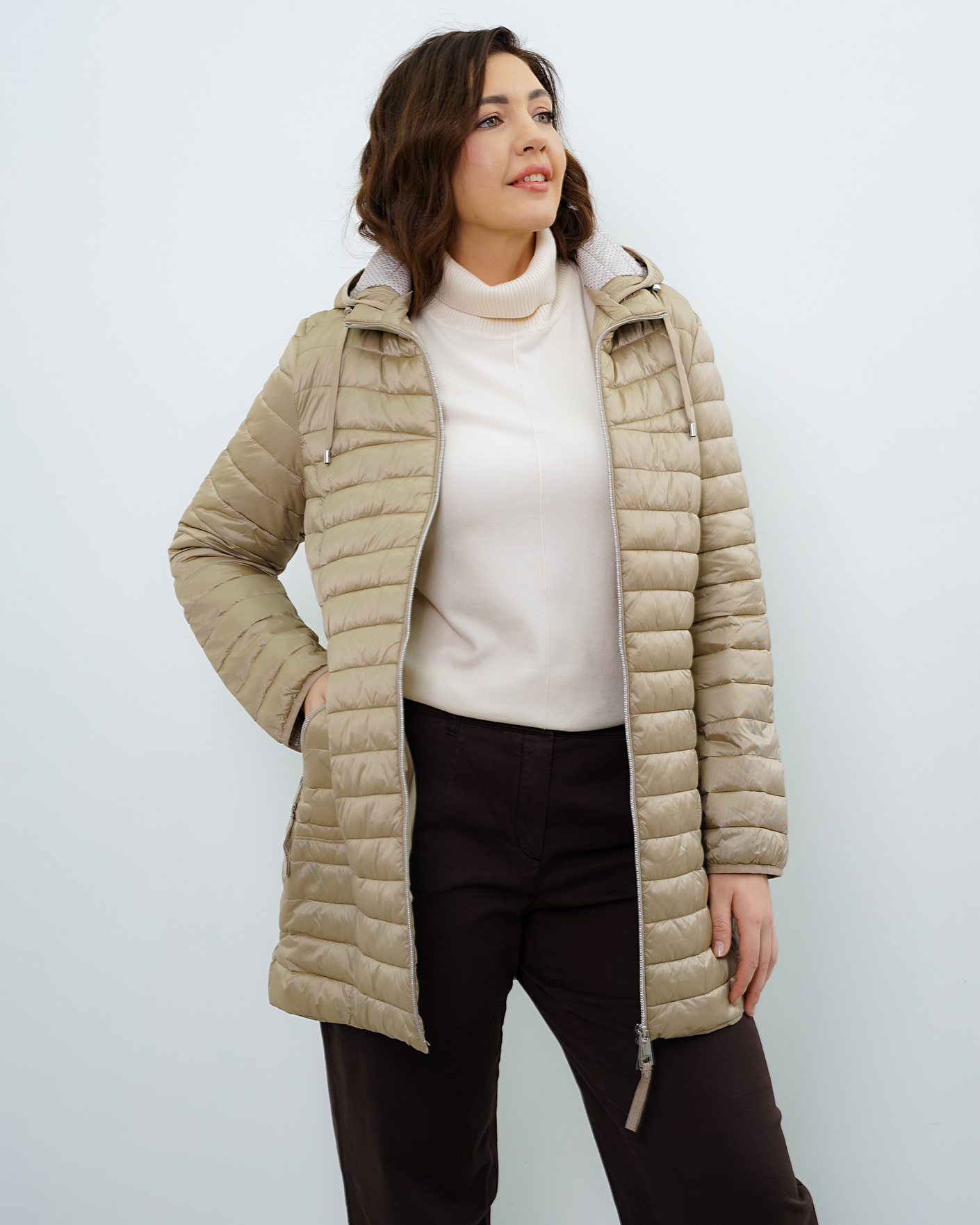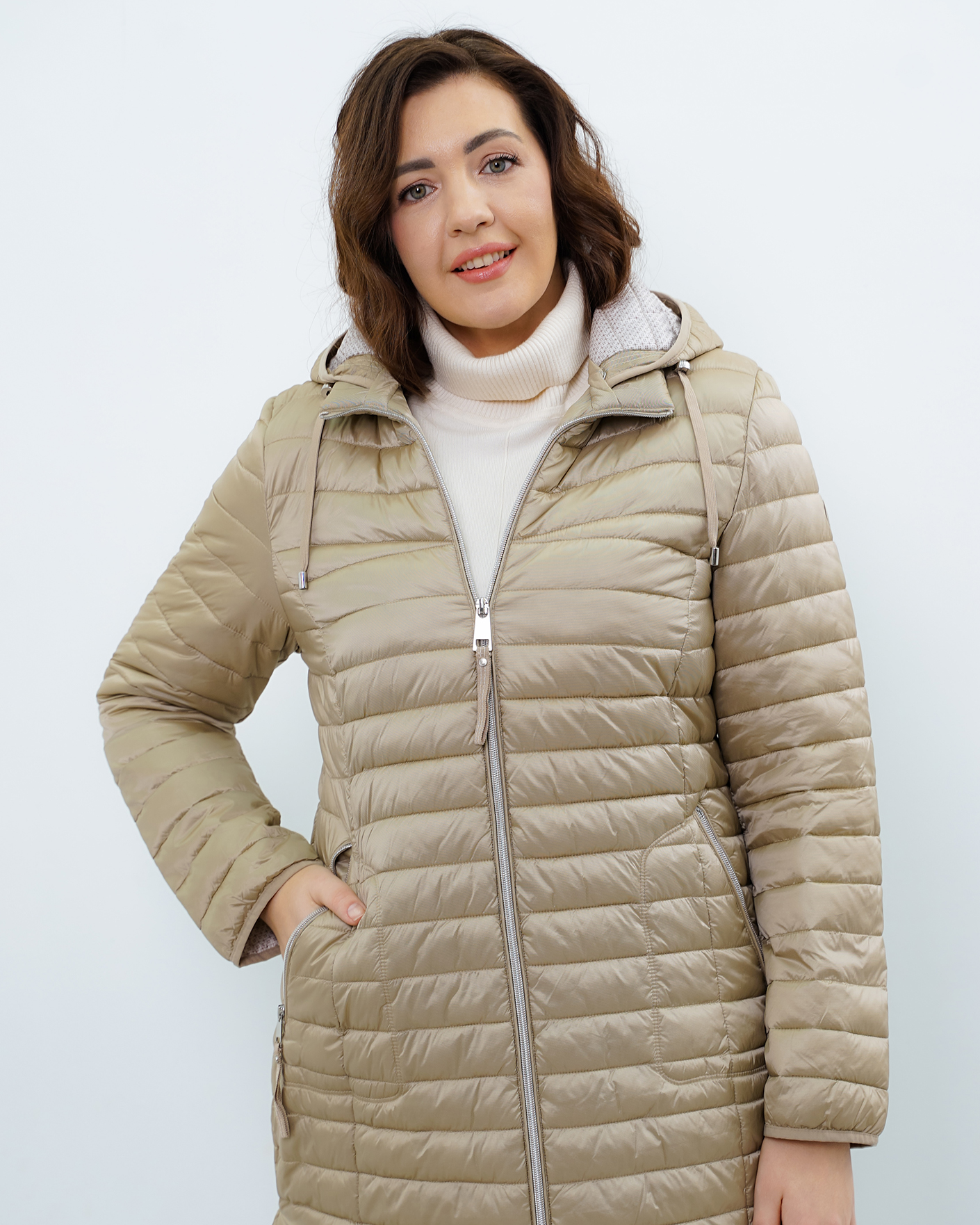 Утепелнная куртка Barbara Lebek бежевого цвета в горизонтальную стежку. Удлиненная модель с воротником-стойка, фиксированным капюшоном, застежка и боковые карманы на молнии. Куртка станет незаменимой вещью в прохладную погоду.