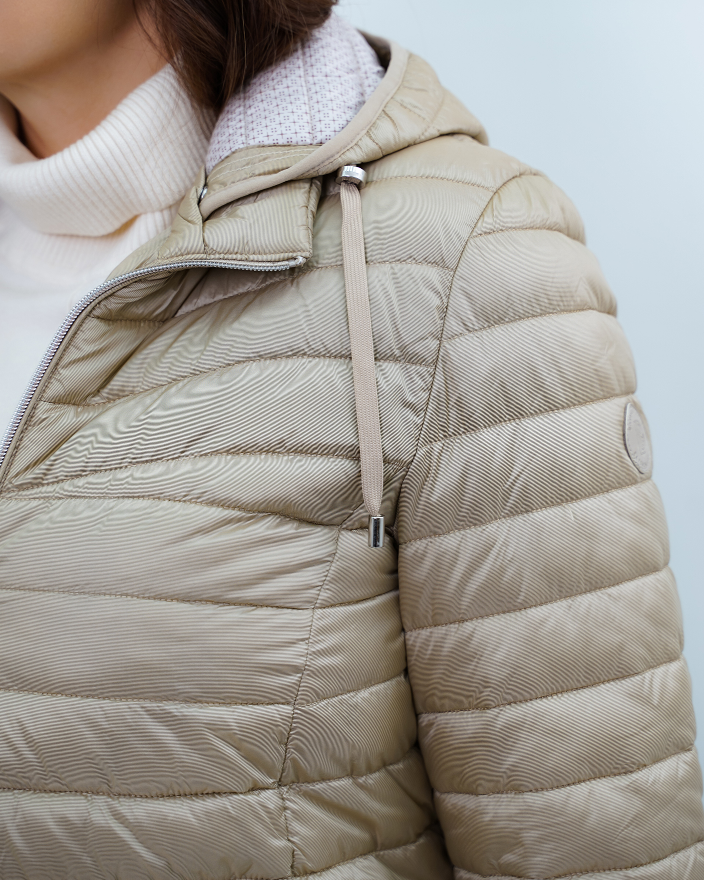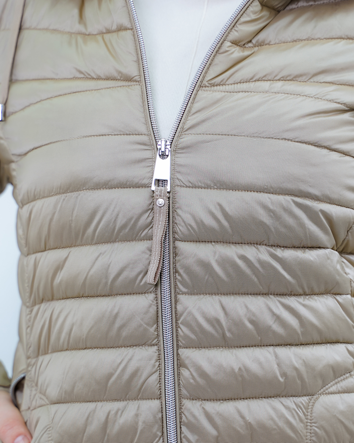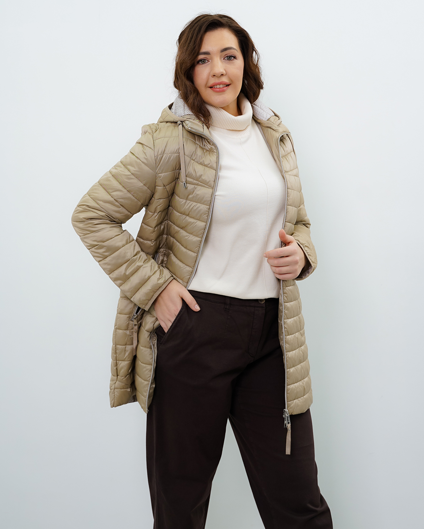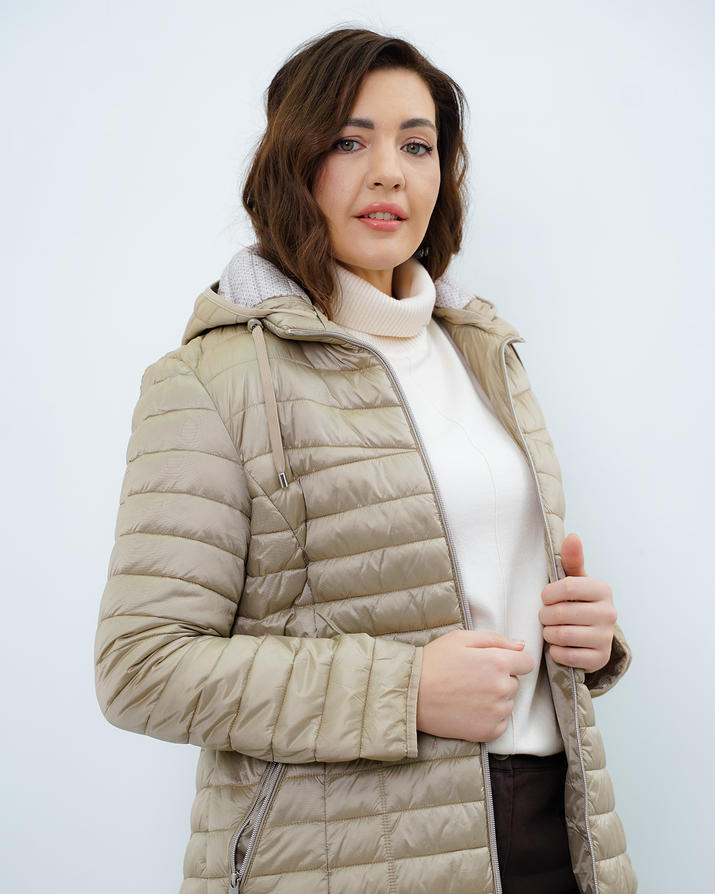 Утепелнная куртка Barbara Lebek бежевого цвета в горизонтальную стежку. Удлиненная модель с воротником-стойка, фиксированным капюшоном, застежка и боковые карманы на молнии. Куртка станет незаменимой вещью в прохладную погоду.