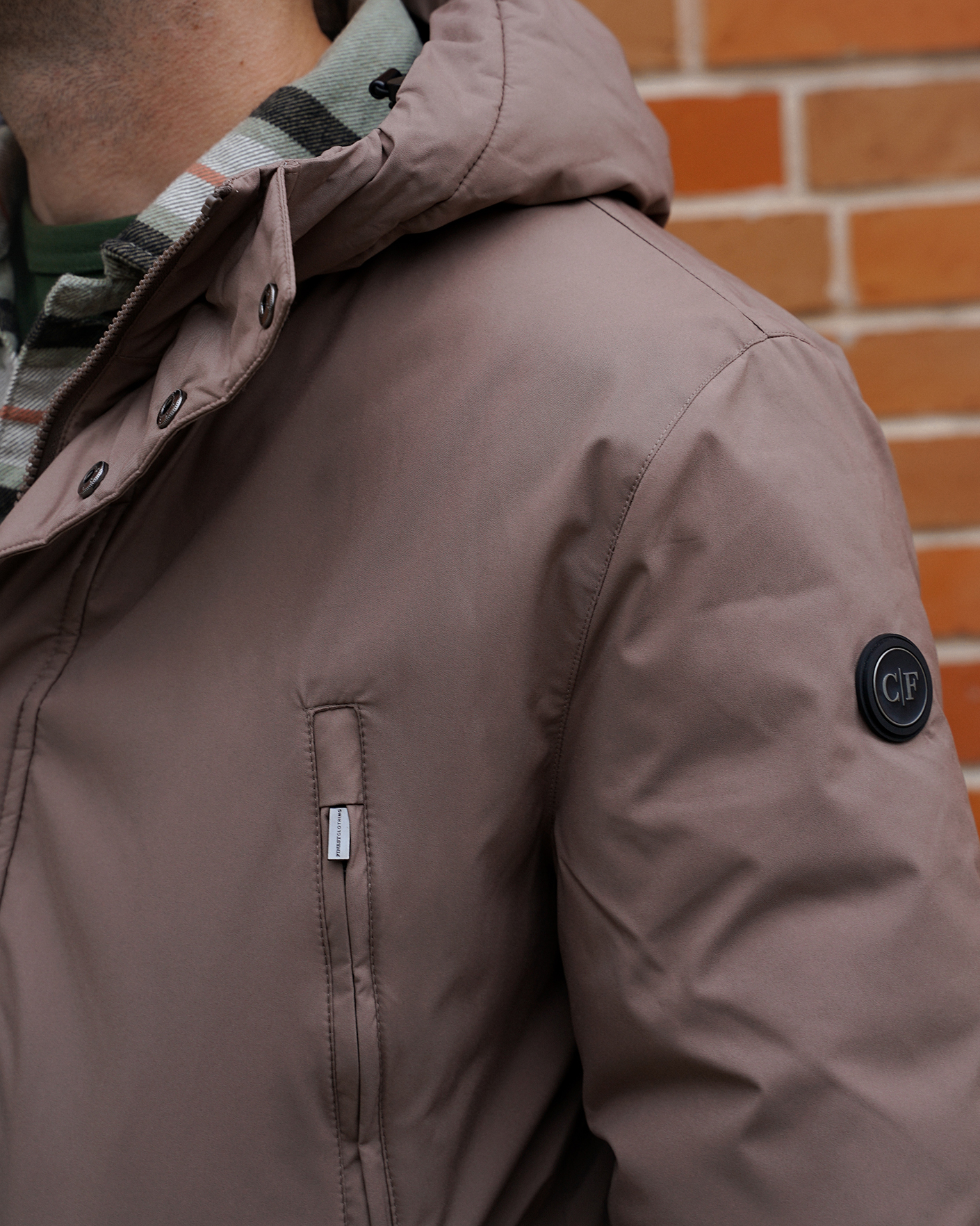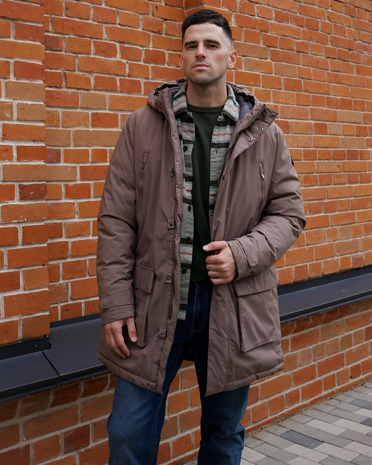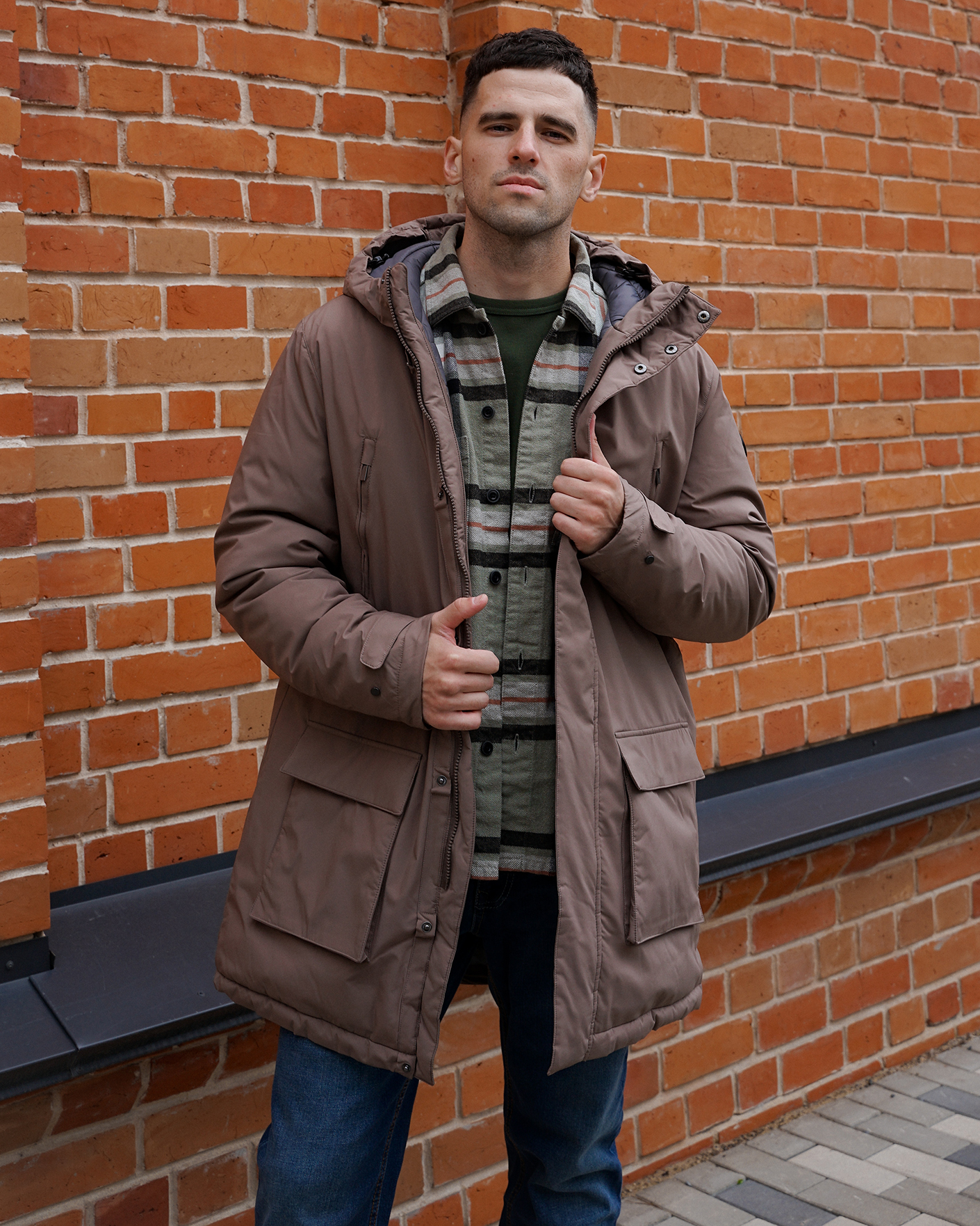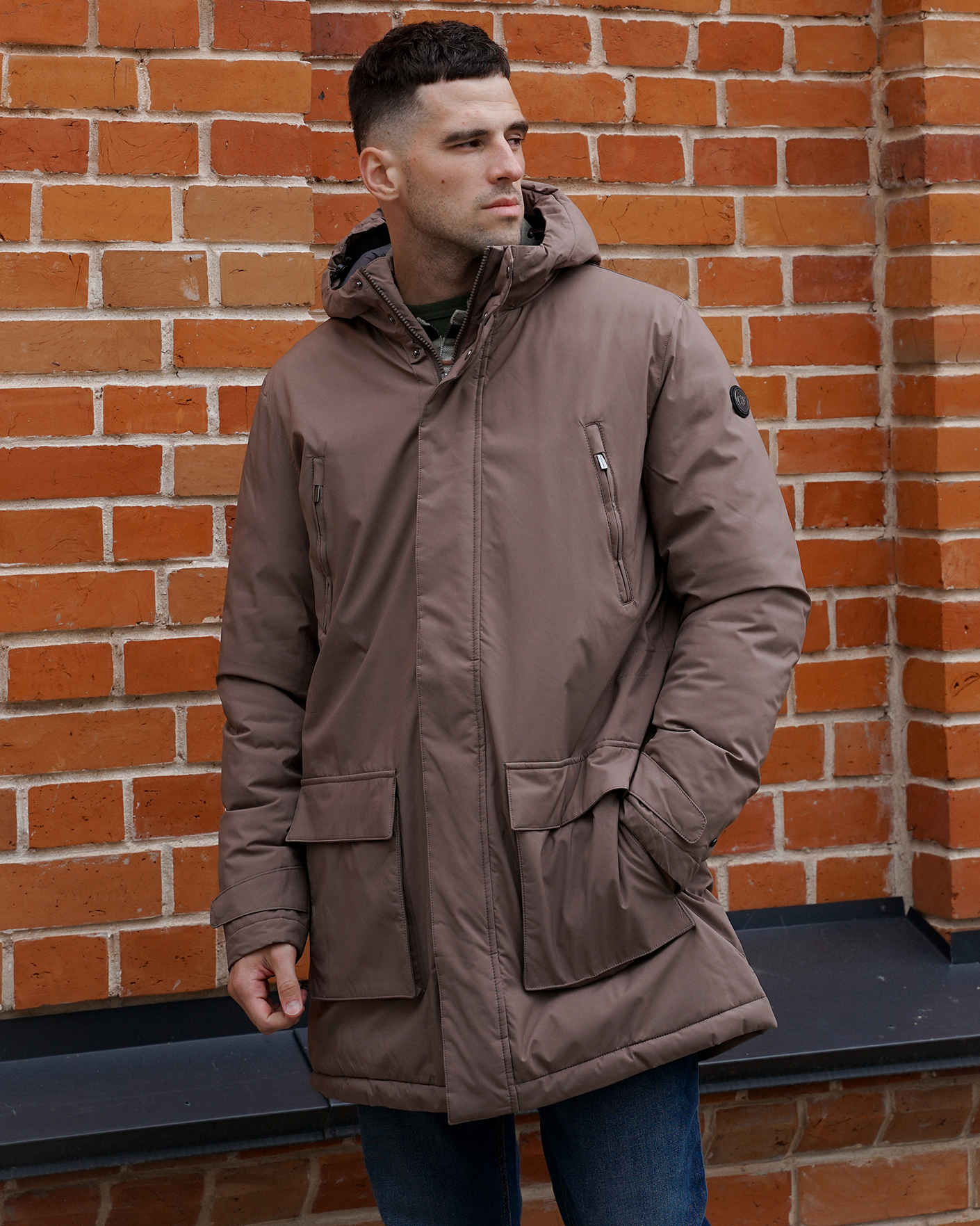 Куртка-парка Commander серо-коричневого цвета. Модель с воротником-стойка, с фиксированным капюшоном, застежка на скрытую молнию и планку на кнопки. Имеются накладные карманы с клапанами по бокам и нагрудные на молнии. Стильная куртка-парка станет идеальным спутником в прохладную погоду.