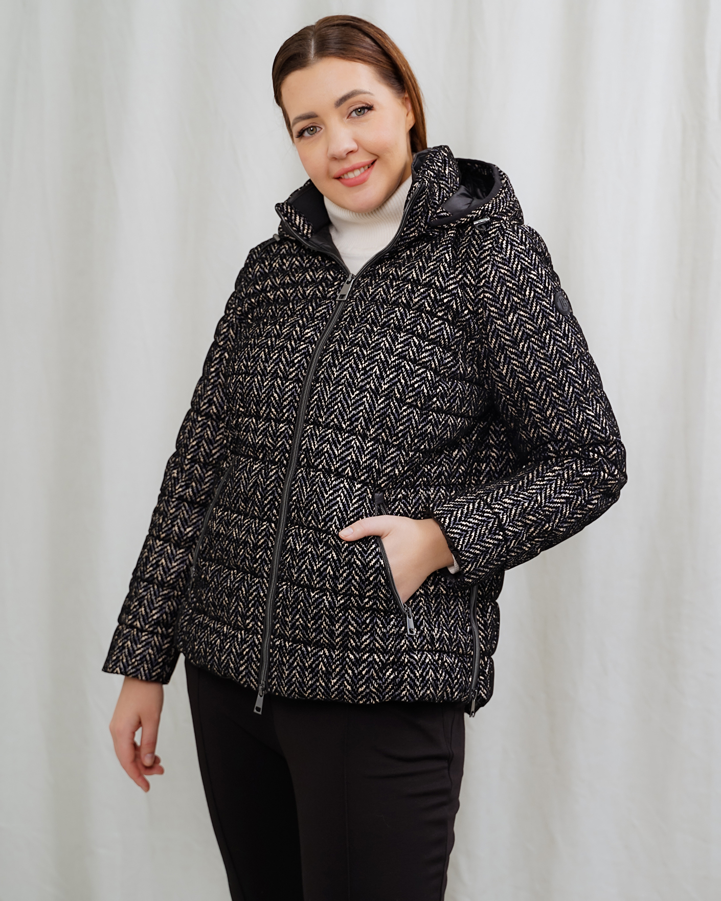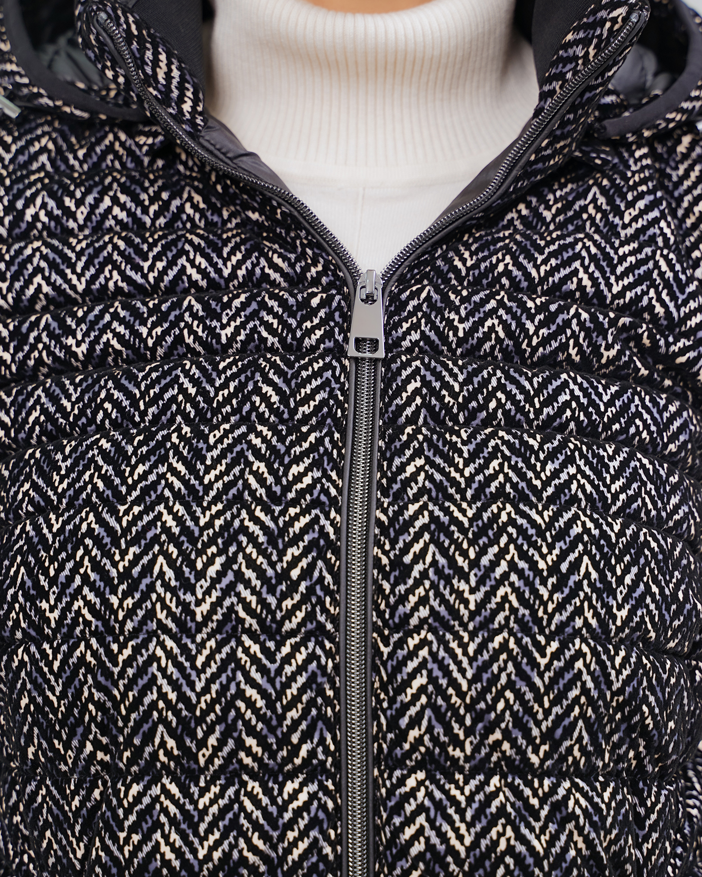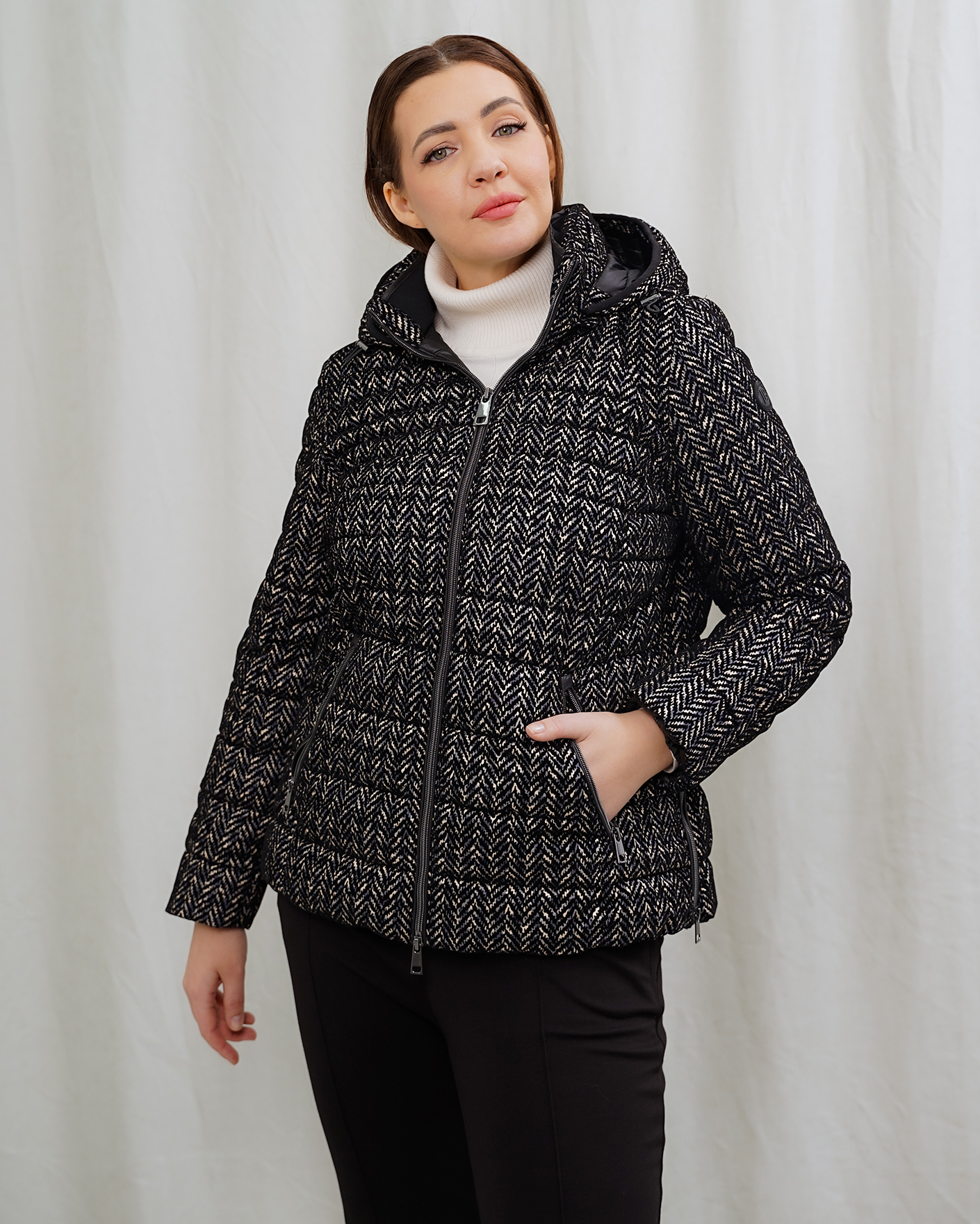 Утепленная куртка Barbara Lebek бело-черного цвета в горизонтальную стежку и рисунок елочка. Модель с воротником-стойка, регулируемым капюшоном,  застежка и боковые карманы на молнии. Куртка станет отличным спутником на прогулке.
