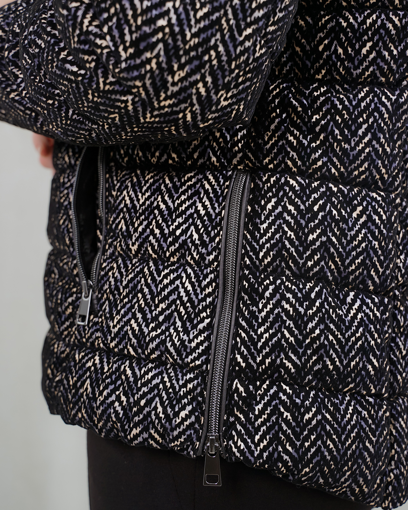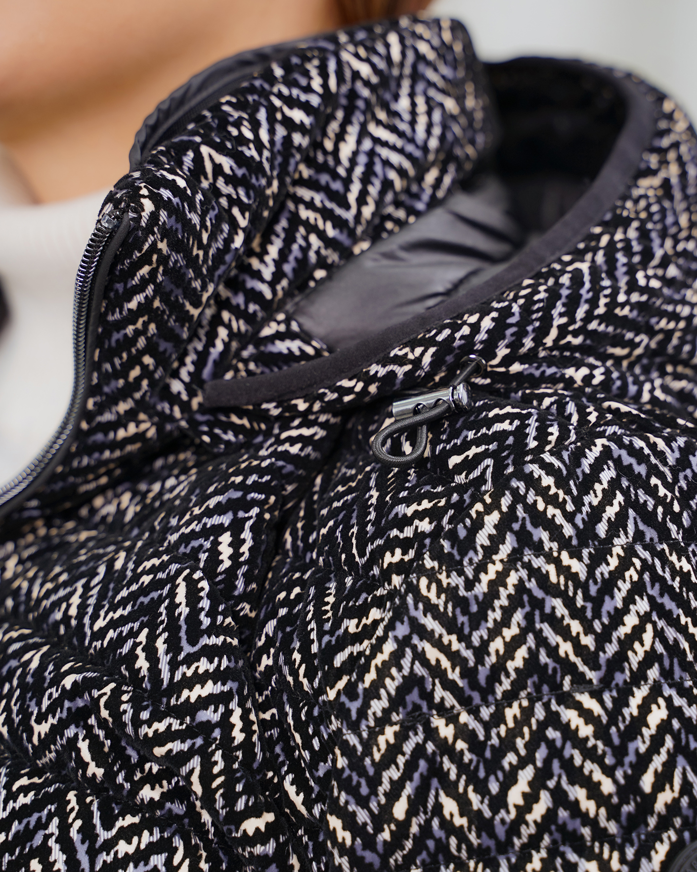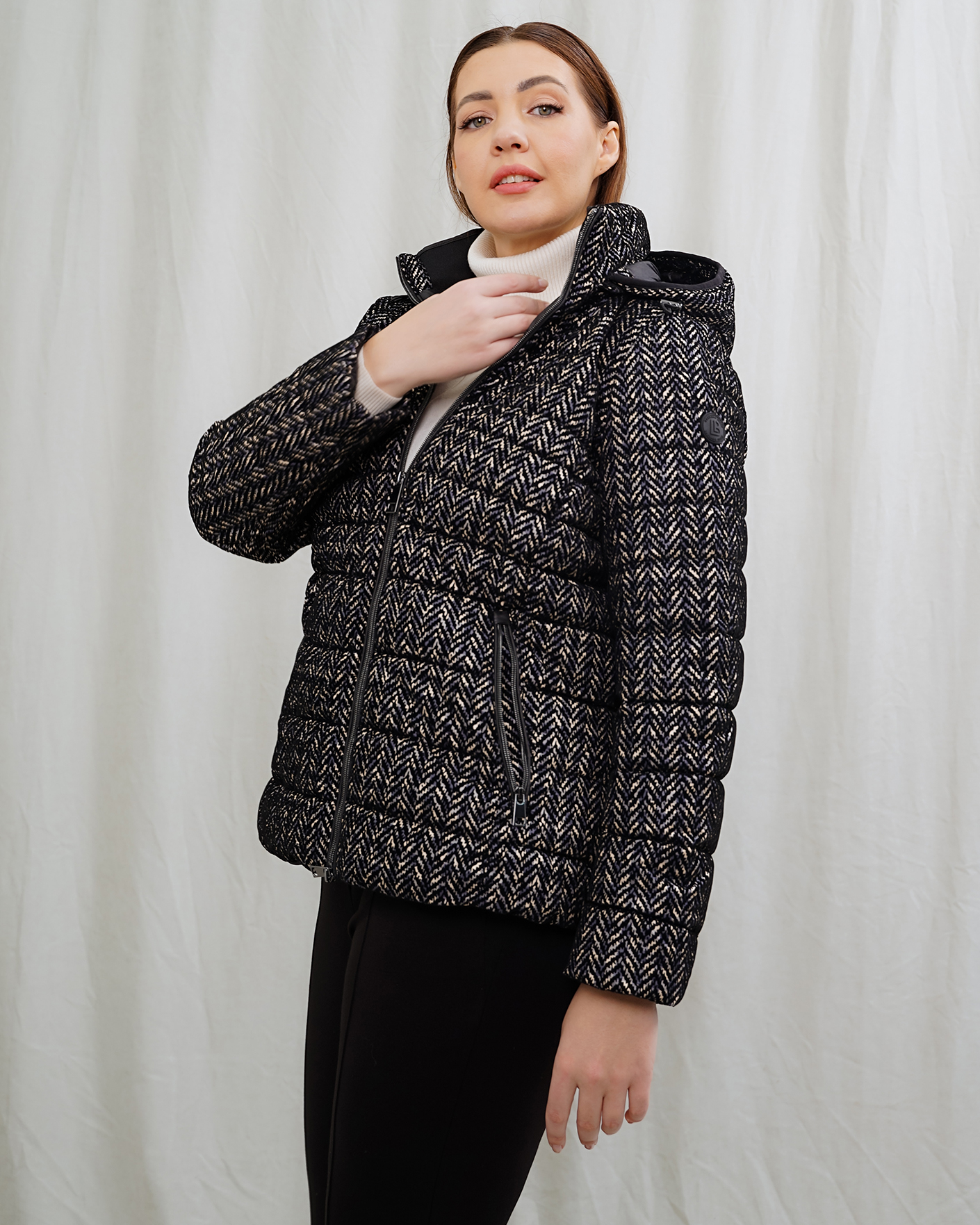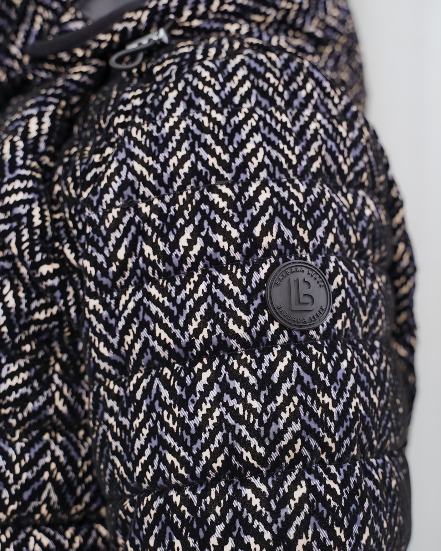 Утепленная куртка Barbara Lebek бело-черного цвета в горизонтальную стежку и рисунок елочка. Модель с воротником-стойка, регулируемым капюшоном,  застежка и боковые карманы на молнии. Куртка станет отличным спутником на прогулке.