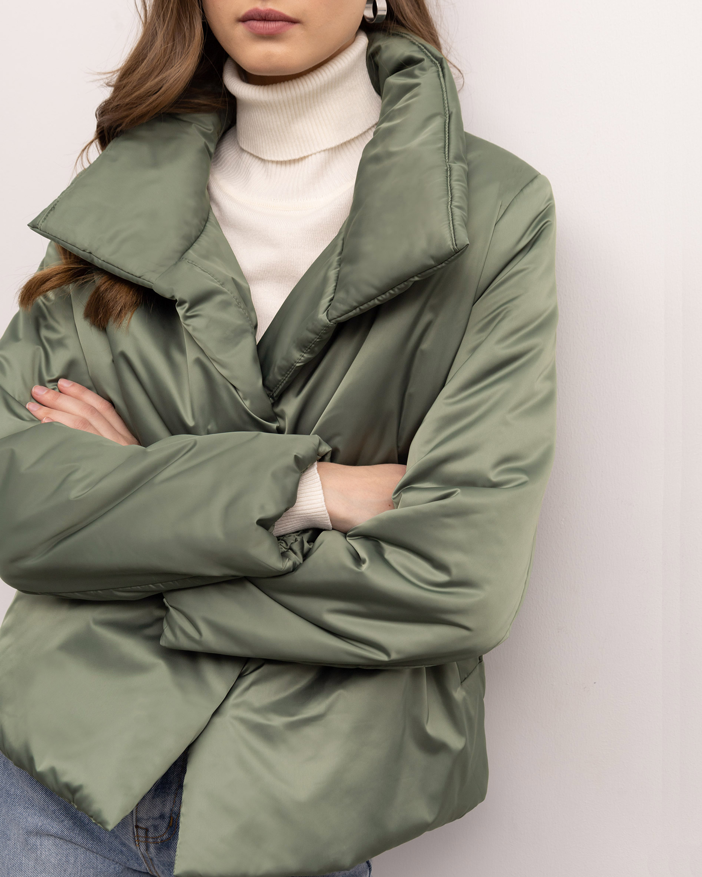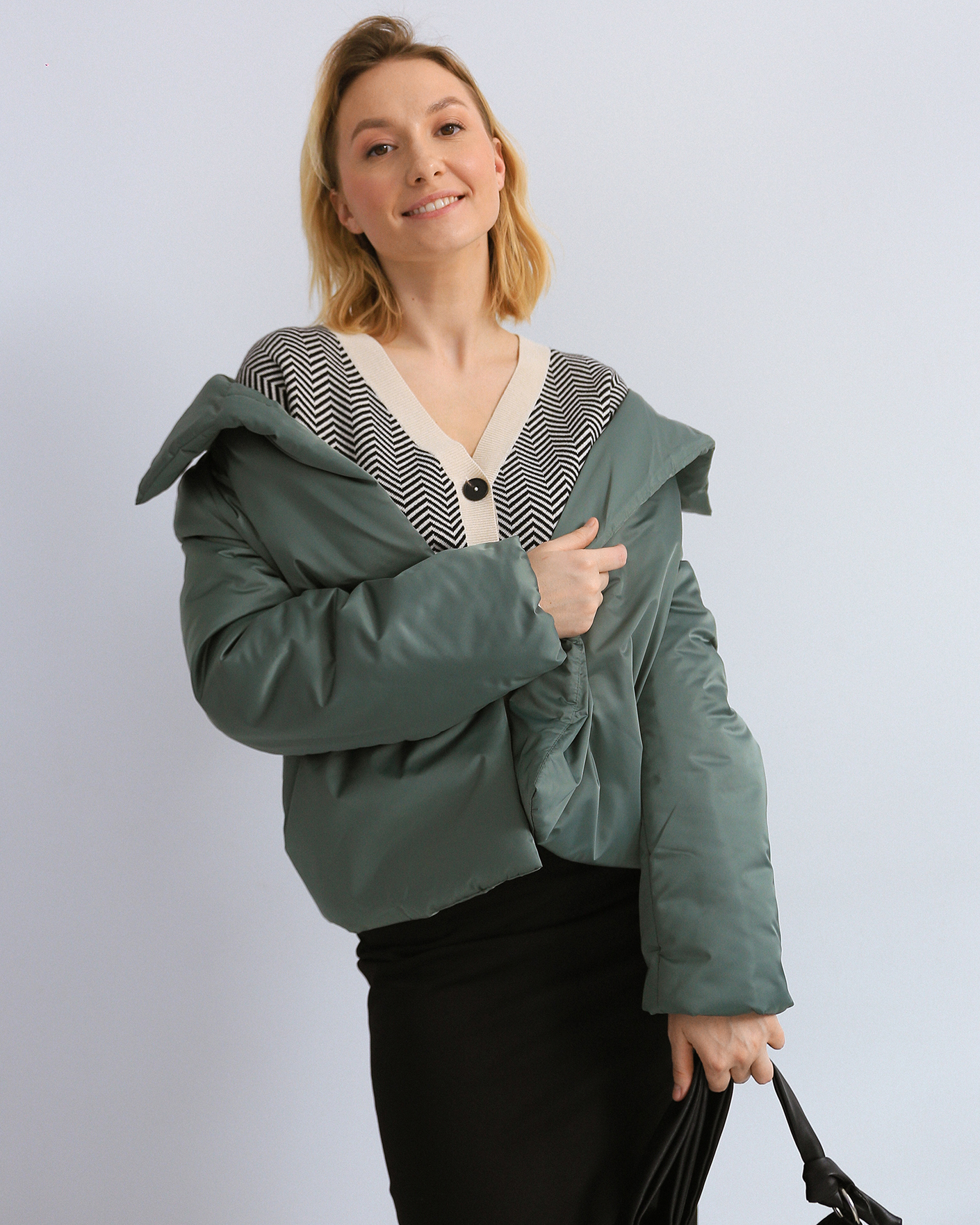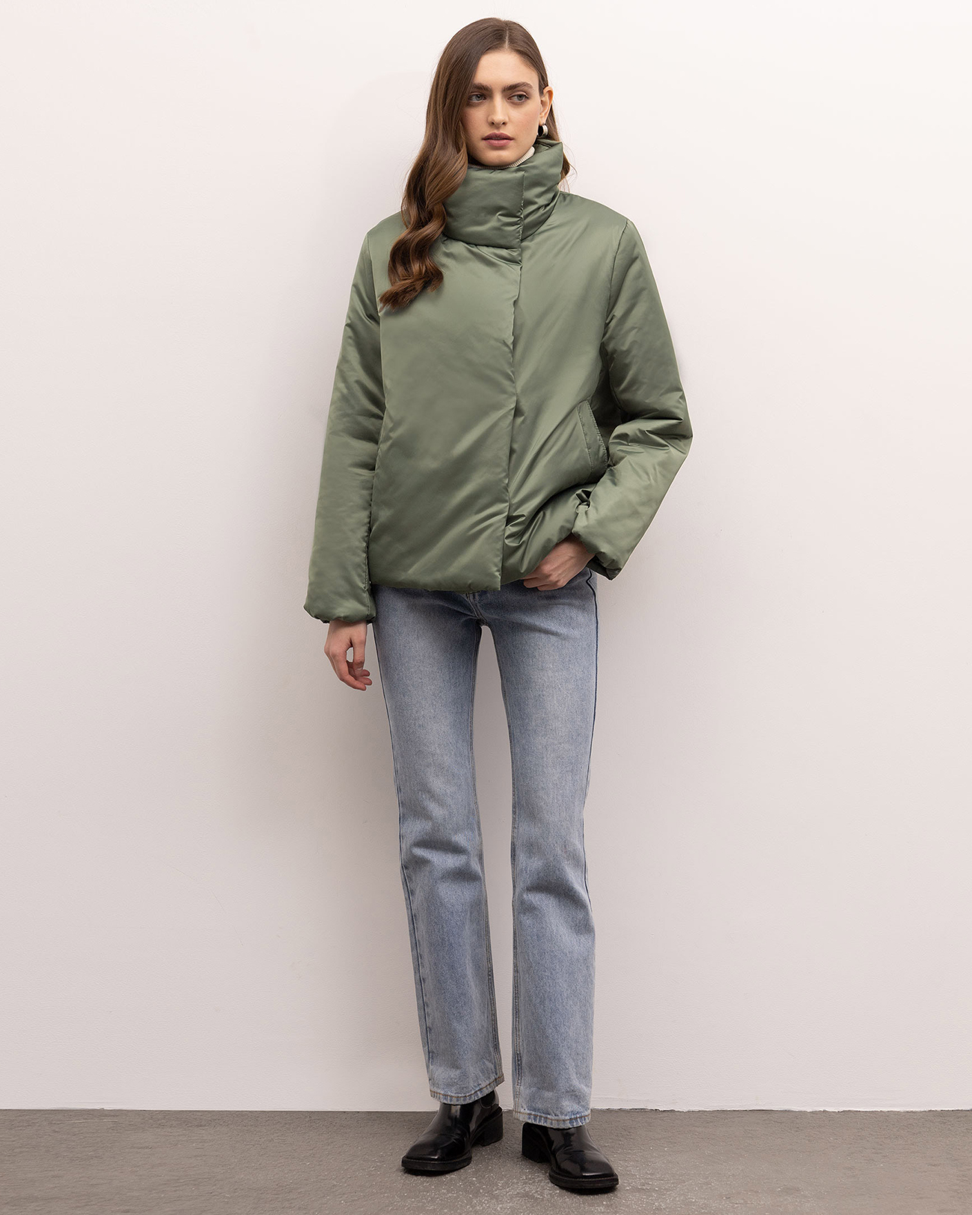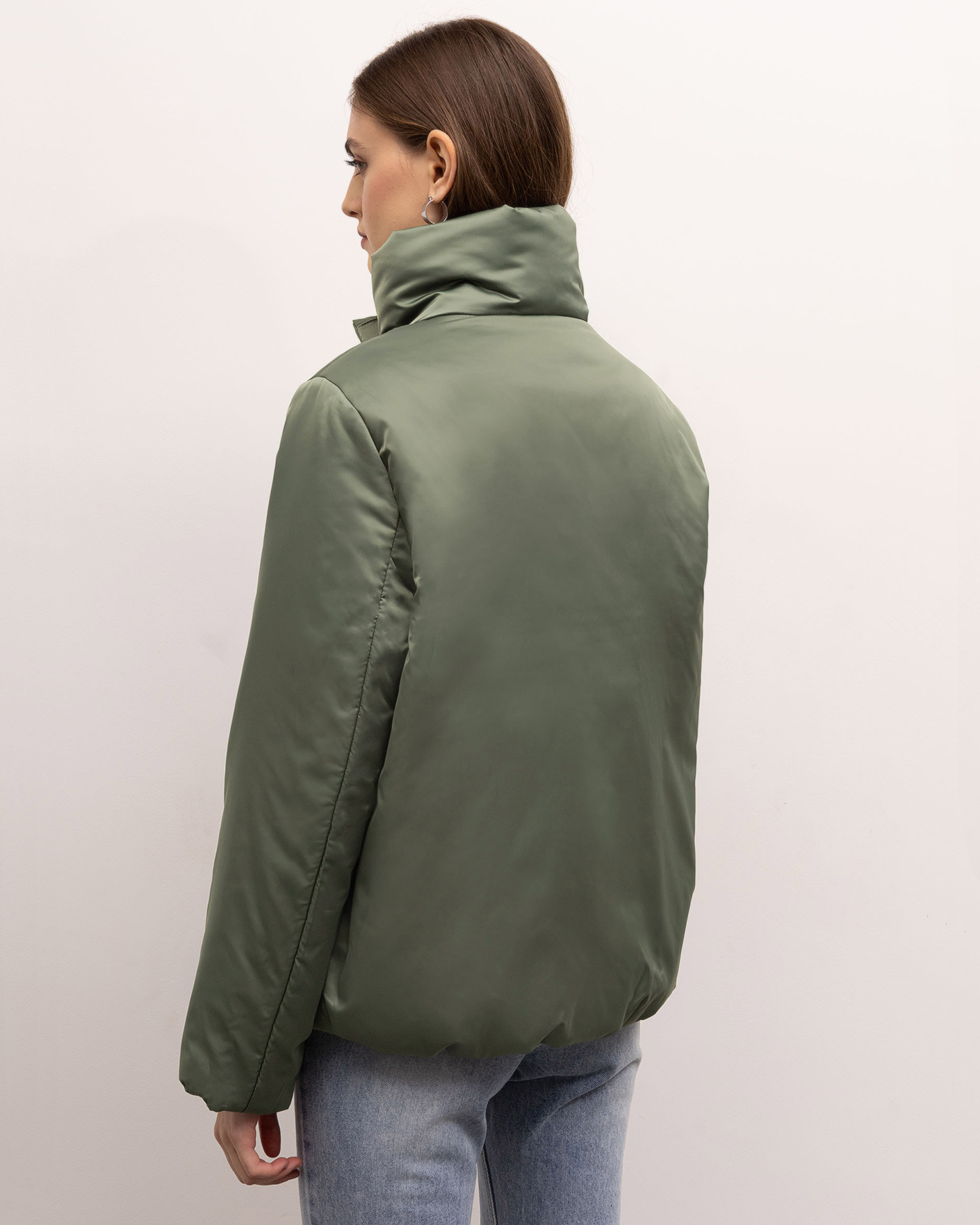 Утепленная легкая куртка Emka зеленого цвета с переливающим эффектом. Укороченная модель с воротником-стойка и застежкой на потайные клепки. Спущення линия плеча, врезные карманы по бокам. Универсальная куртка отлично дополнит повседневный образ.