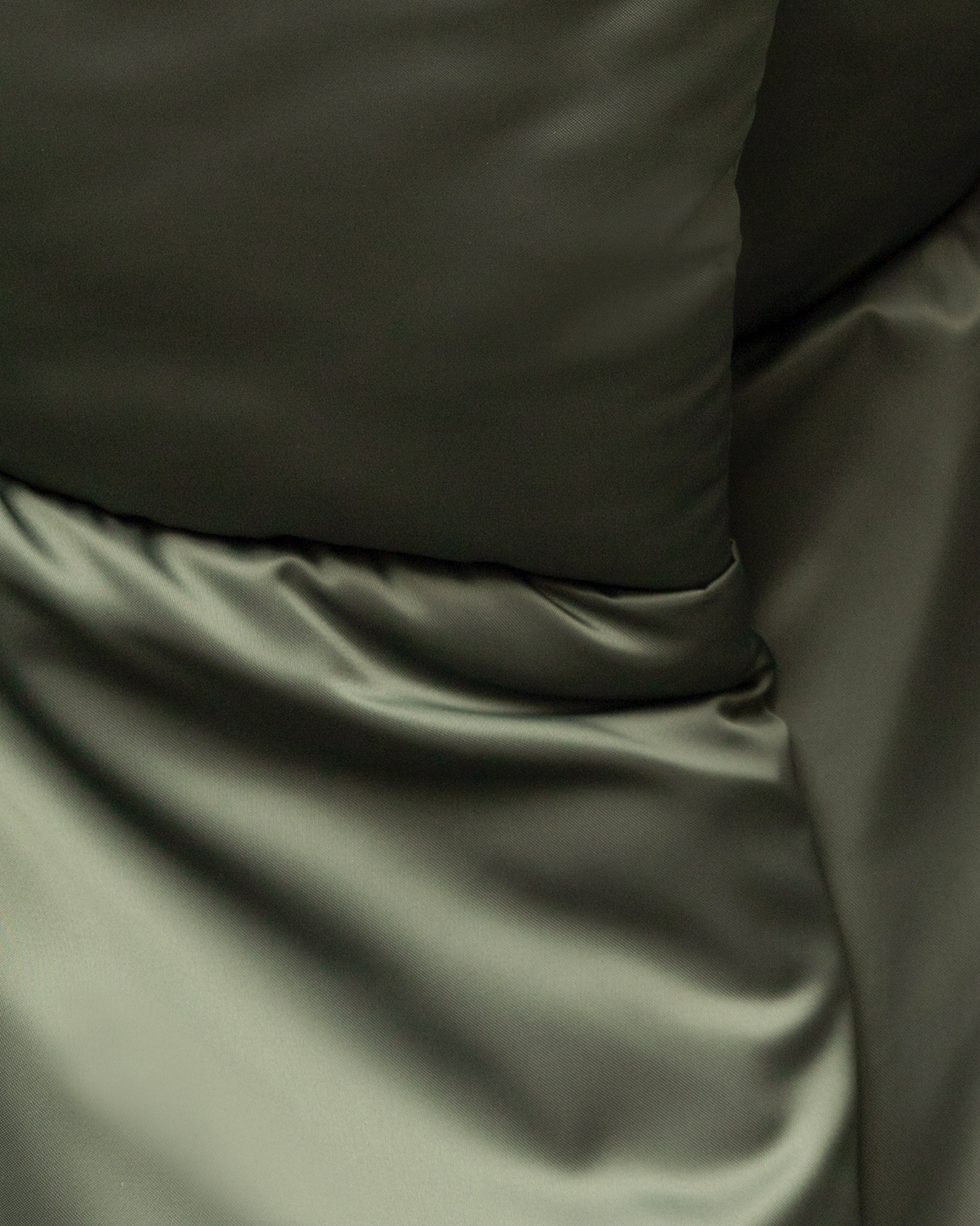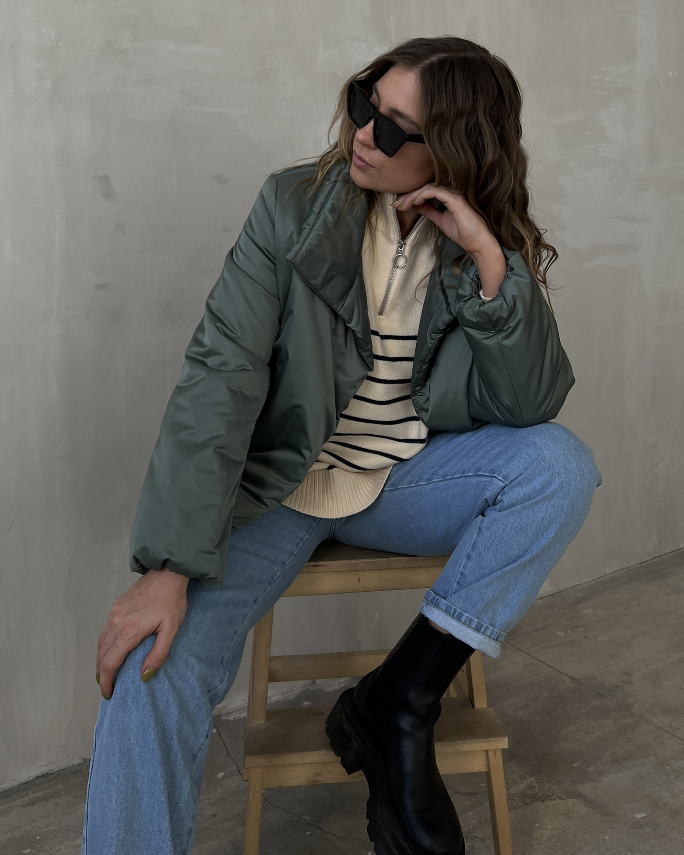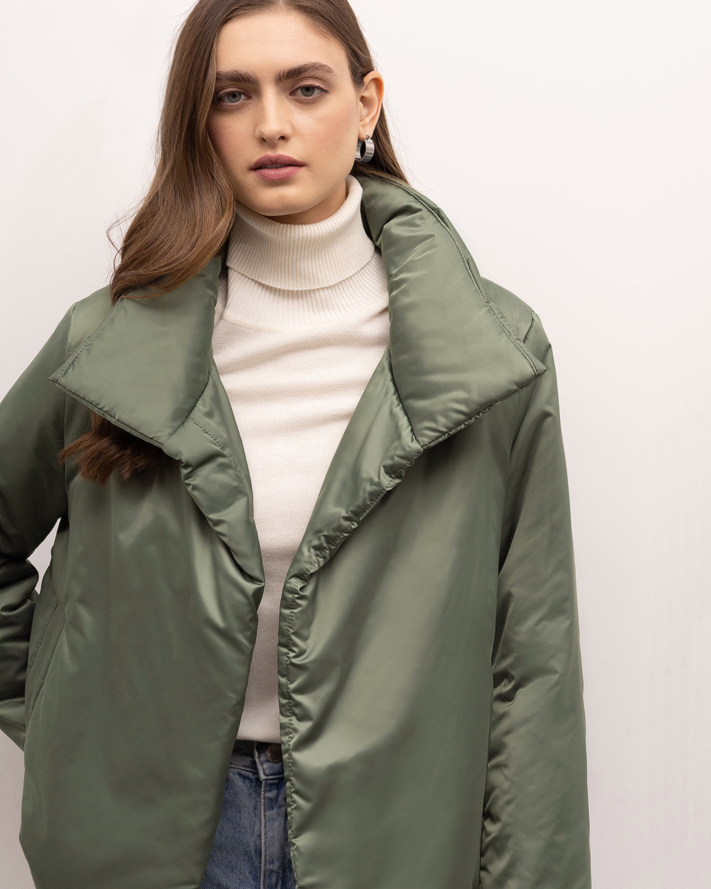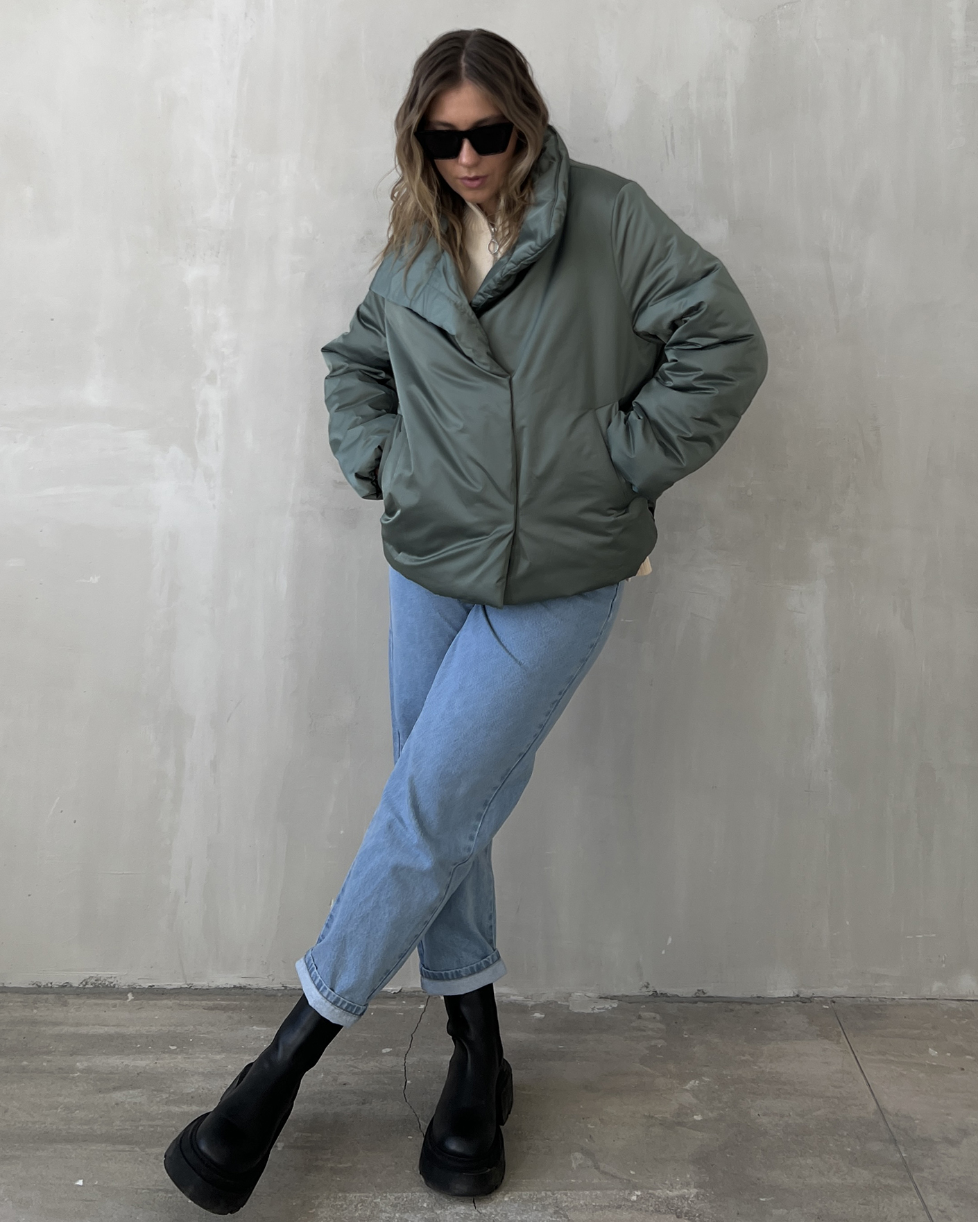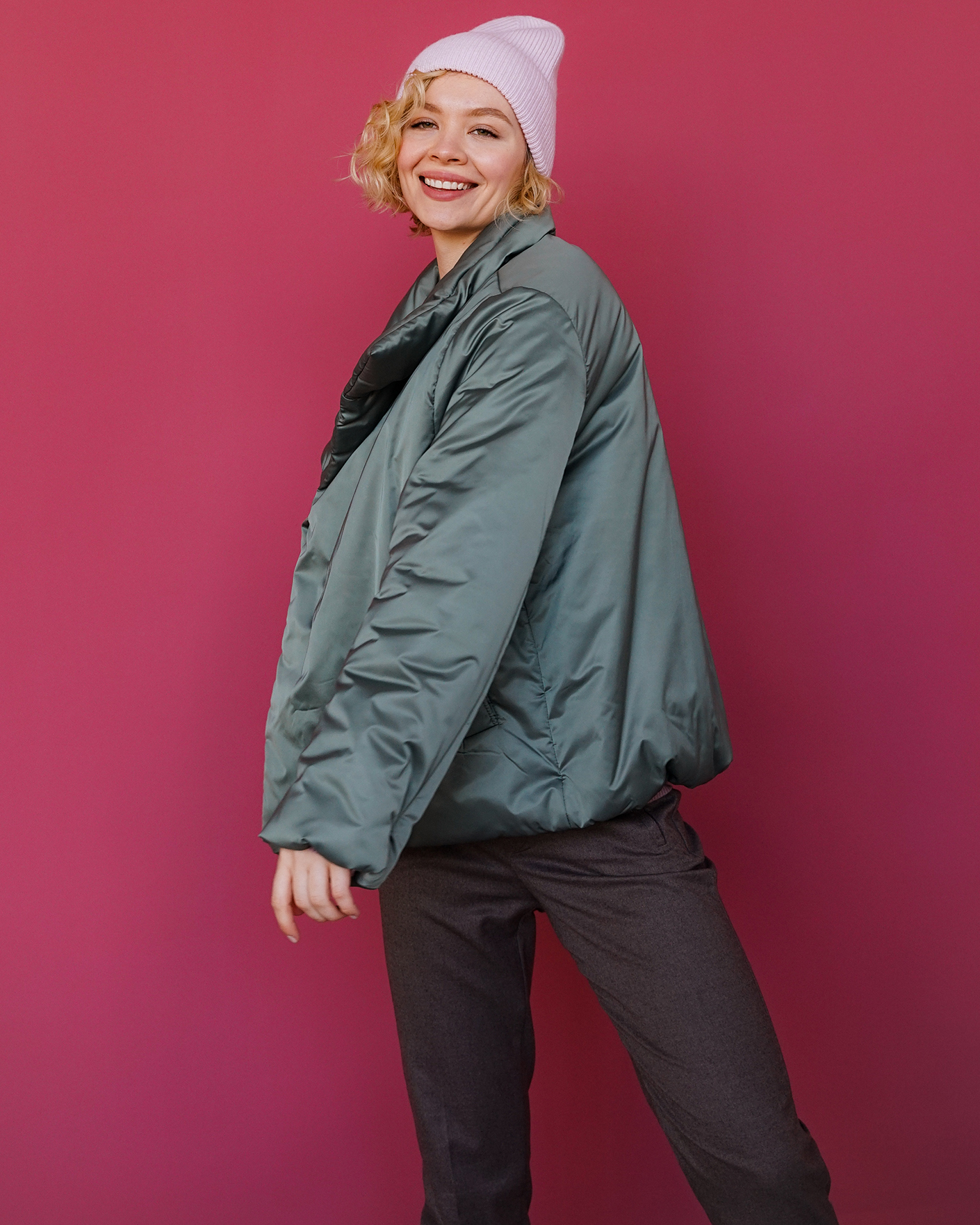 Утепленная легкая куртка Emka зеленого цвета с переливающим эффектом. Укороченная модель с воротником-стойка и застежкой на потайные клепки. Спущення линия плеча, врезные карманы по бокам. Универсальная куртка отлично дополнит повседневный образ.