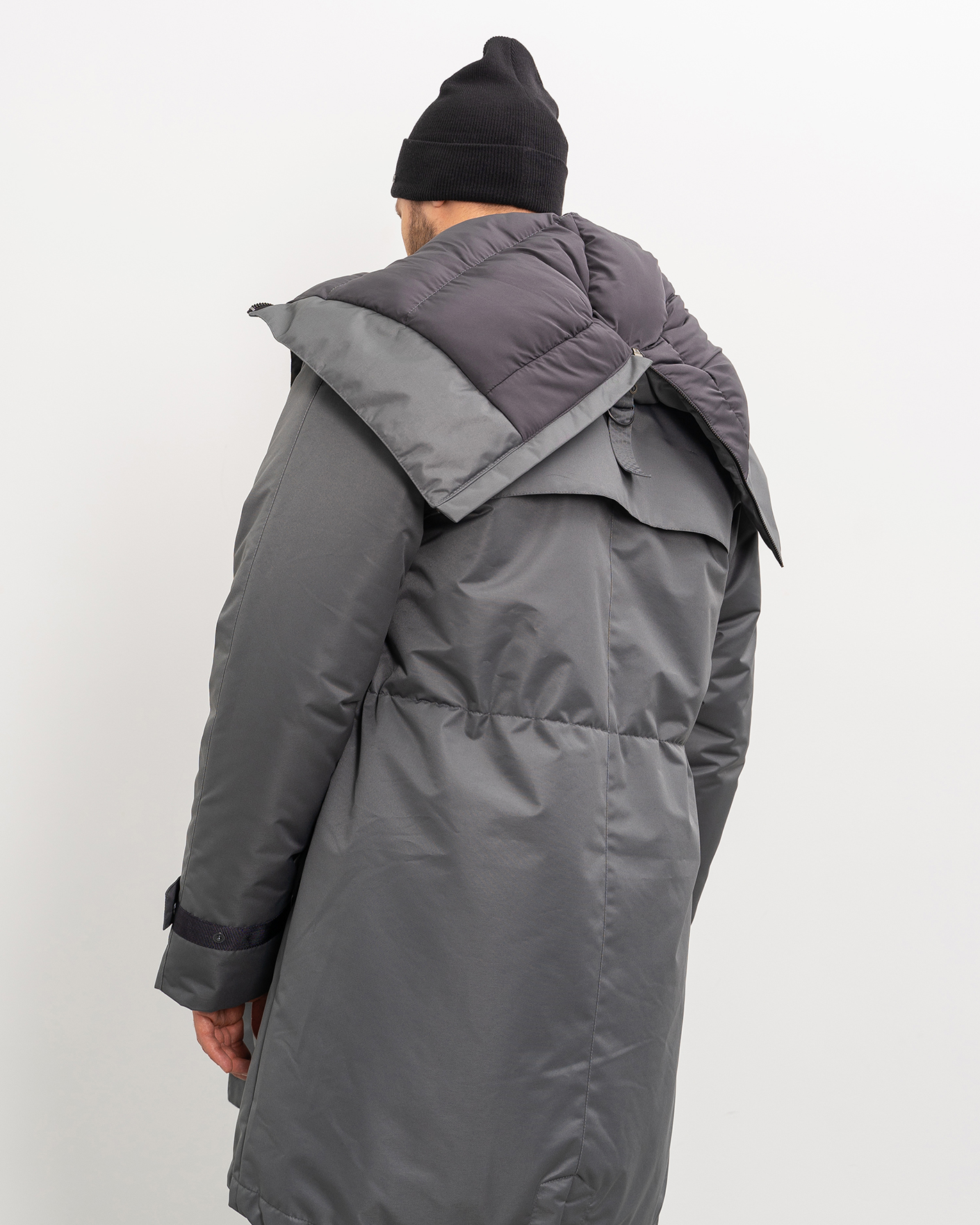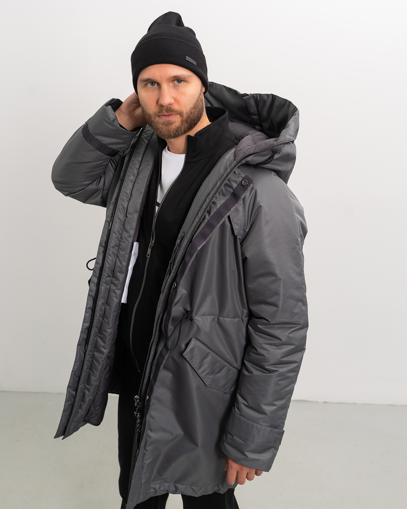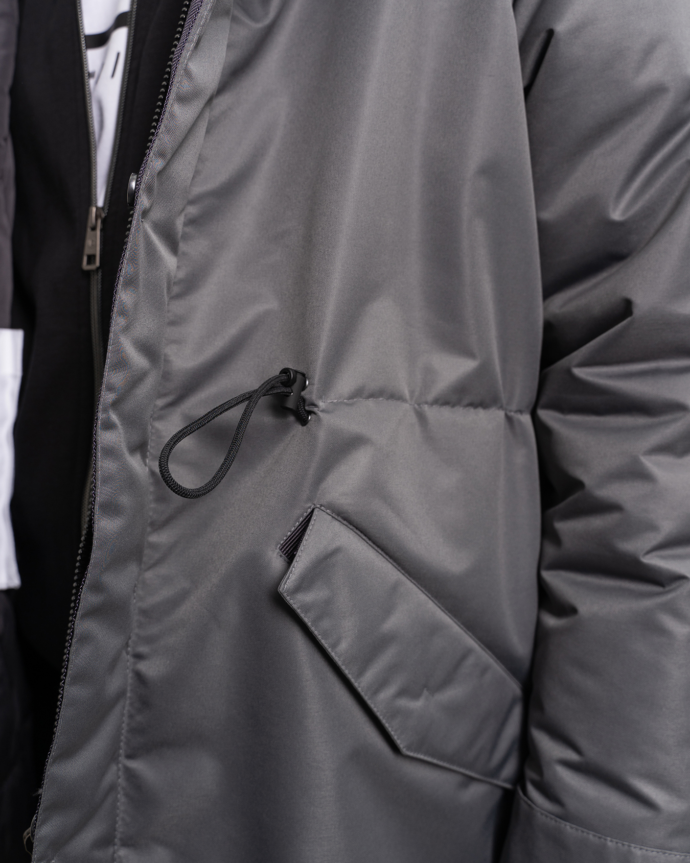 Утепленный пуховик-парка Novaya серого цвета. Модель с воротником-стойка, регулируемым капюшоном с молнией, застежка на молнию и планку на скрытые клепки, что обеспечивает максимальную защиту от холода. Регулируемые манжеты, линия пояса на кулиске, имеются карманы по бокам. Комфортный и теплый пуховик-парка станет идеальным спутником в холодное время года.