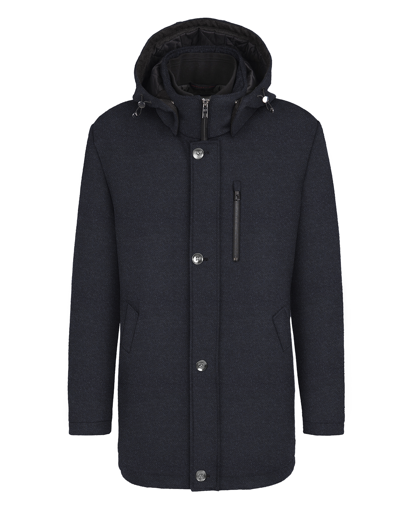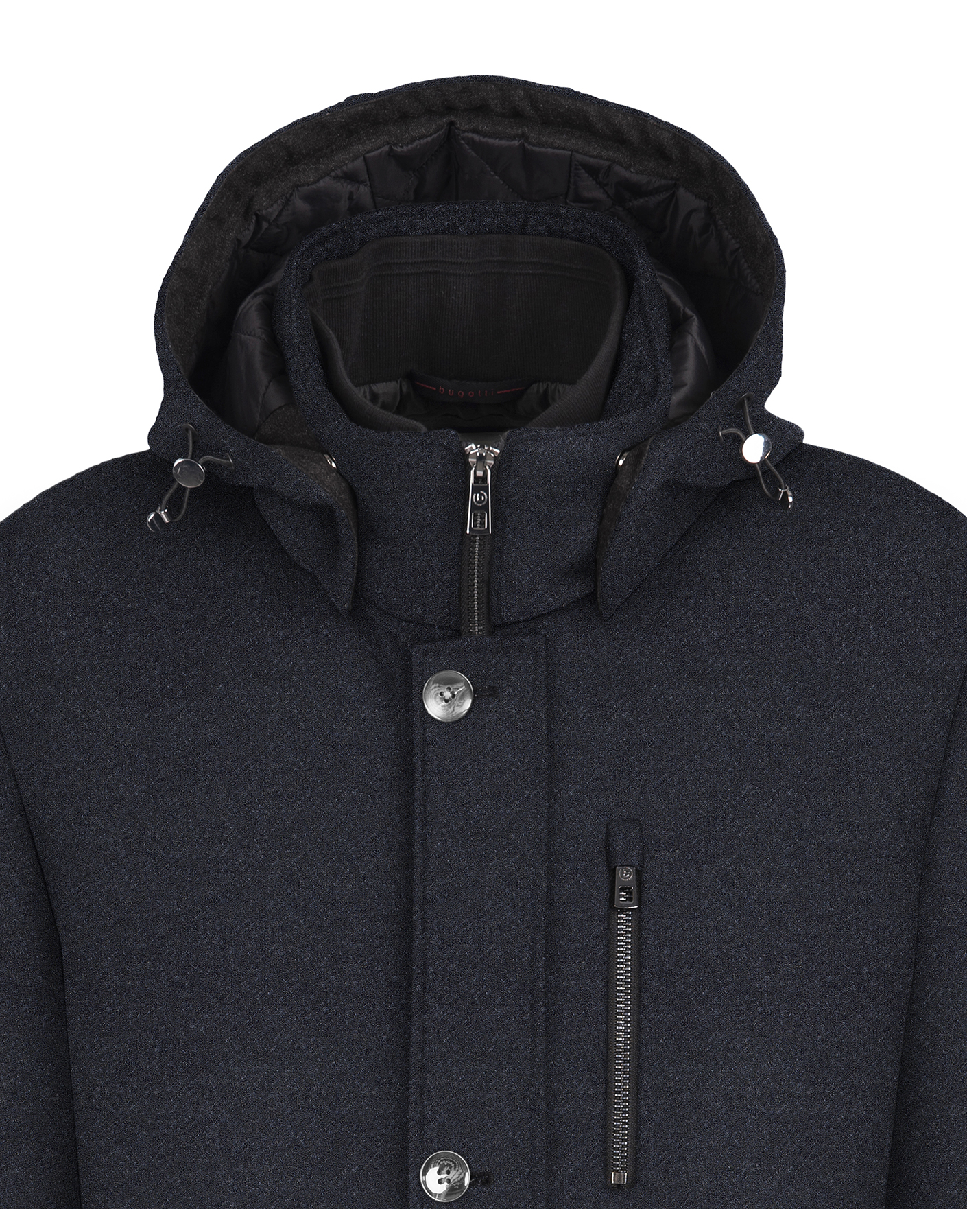 Теплое полупальто-парка Bugatti синего цвета в текстурный рисунок. Модель с воротником-стойка, съемным капюшоном, застежка на скрытую молнию и планку на крупные пуговицы. Имеются врезные карманы по бокам и нагрудный на молнии. Стильное полупальто-парка отлично впишется в ваш гардероб.