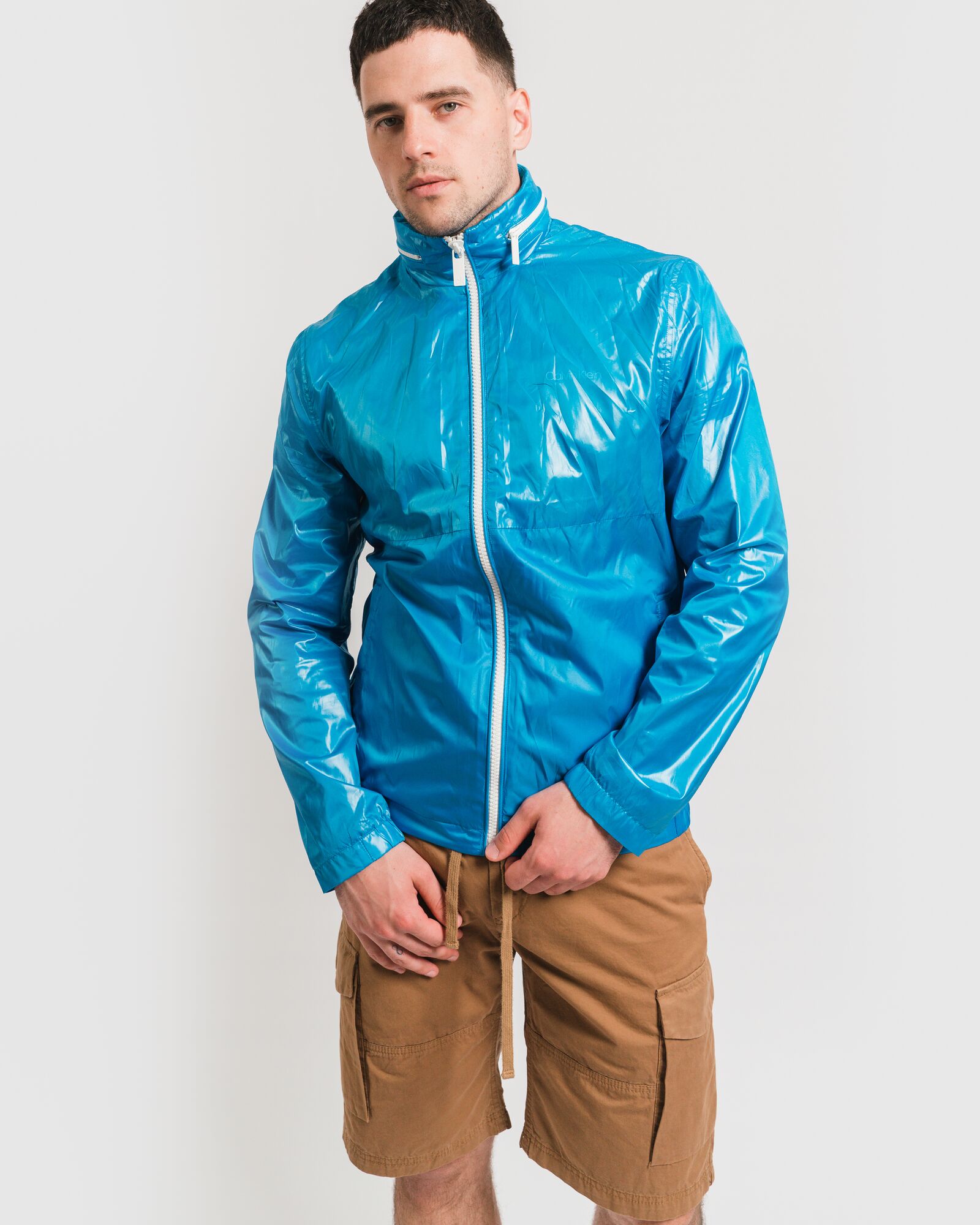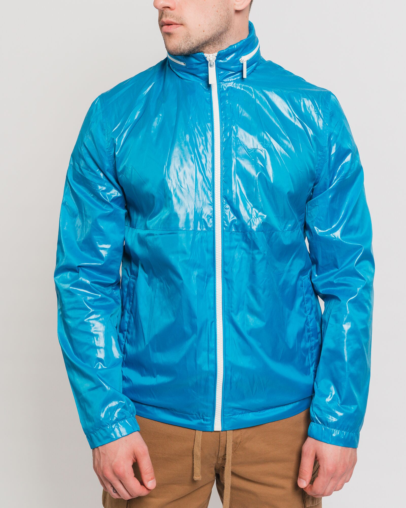 Ярко-голубая ветровка на замке. Воротник-стойка с белым замком вокруг шеи. Ветровка станет отличным дополнением Вашему летнему гардеробу в дождливую погоду.
