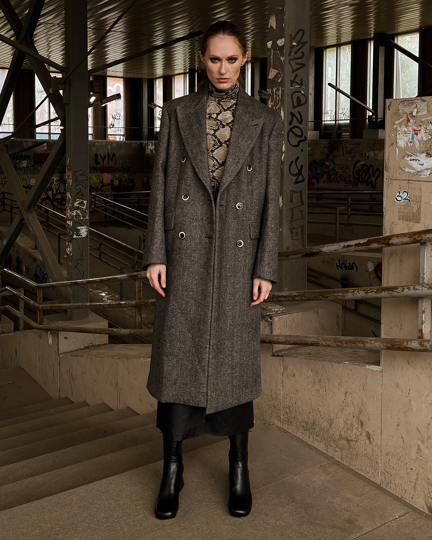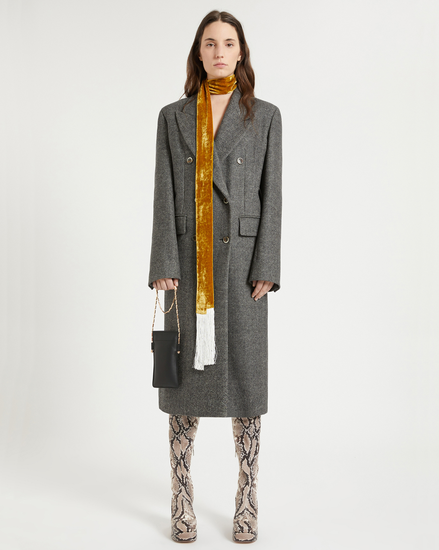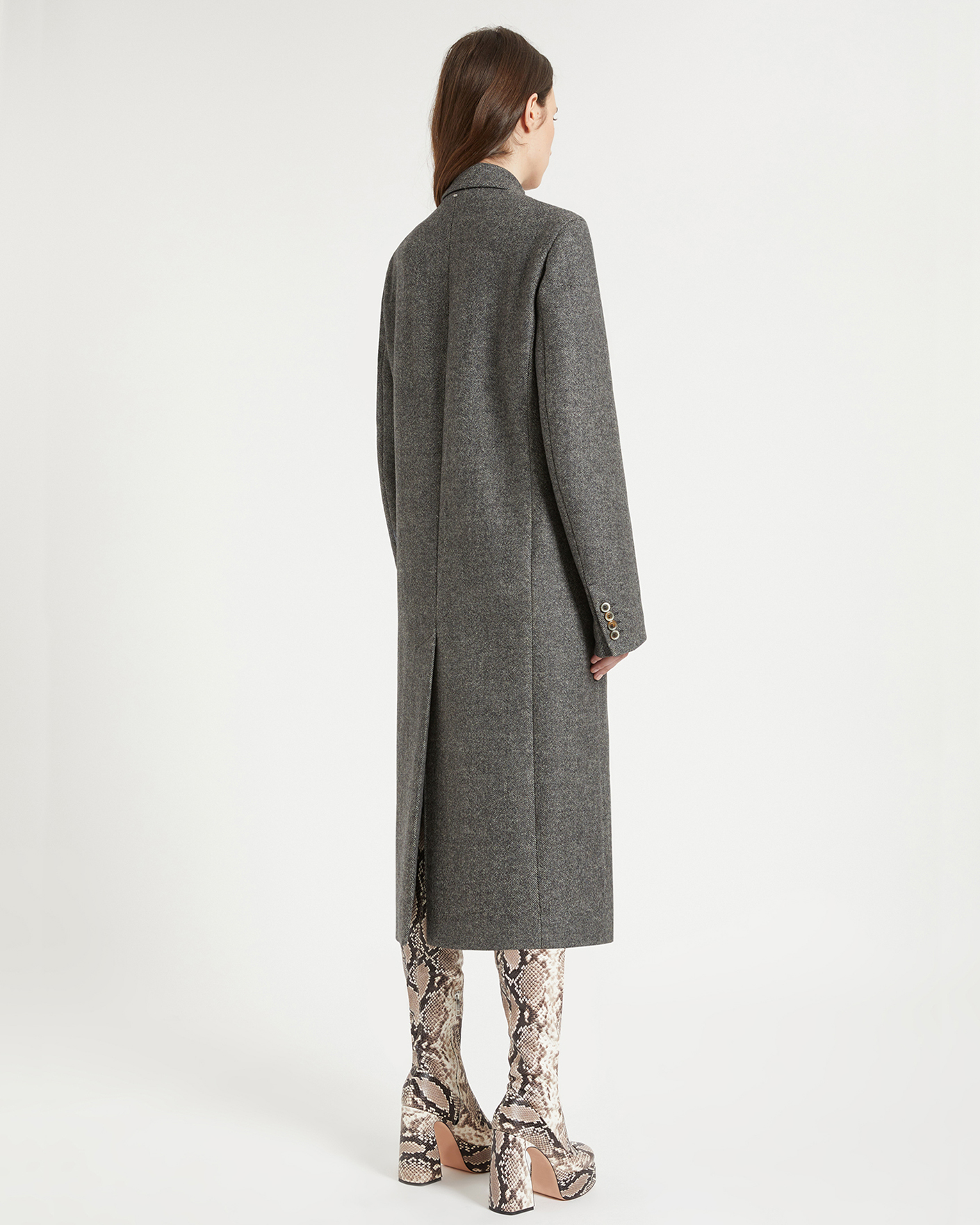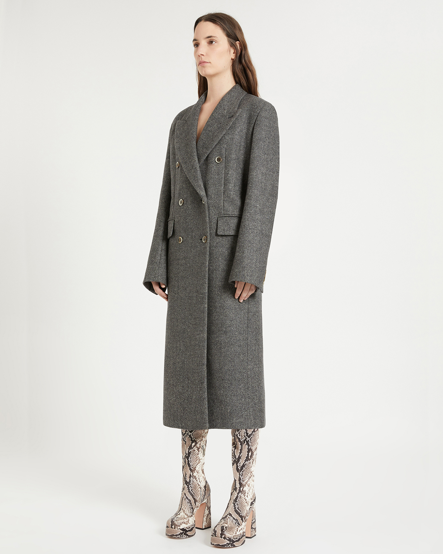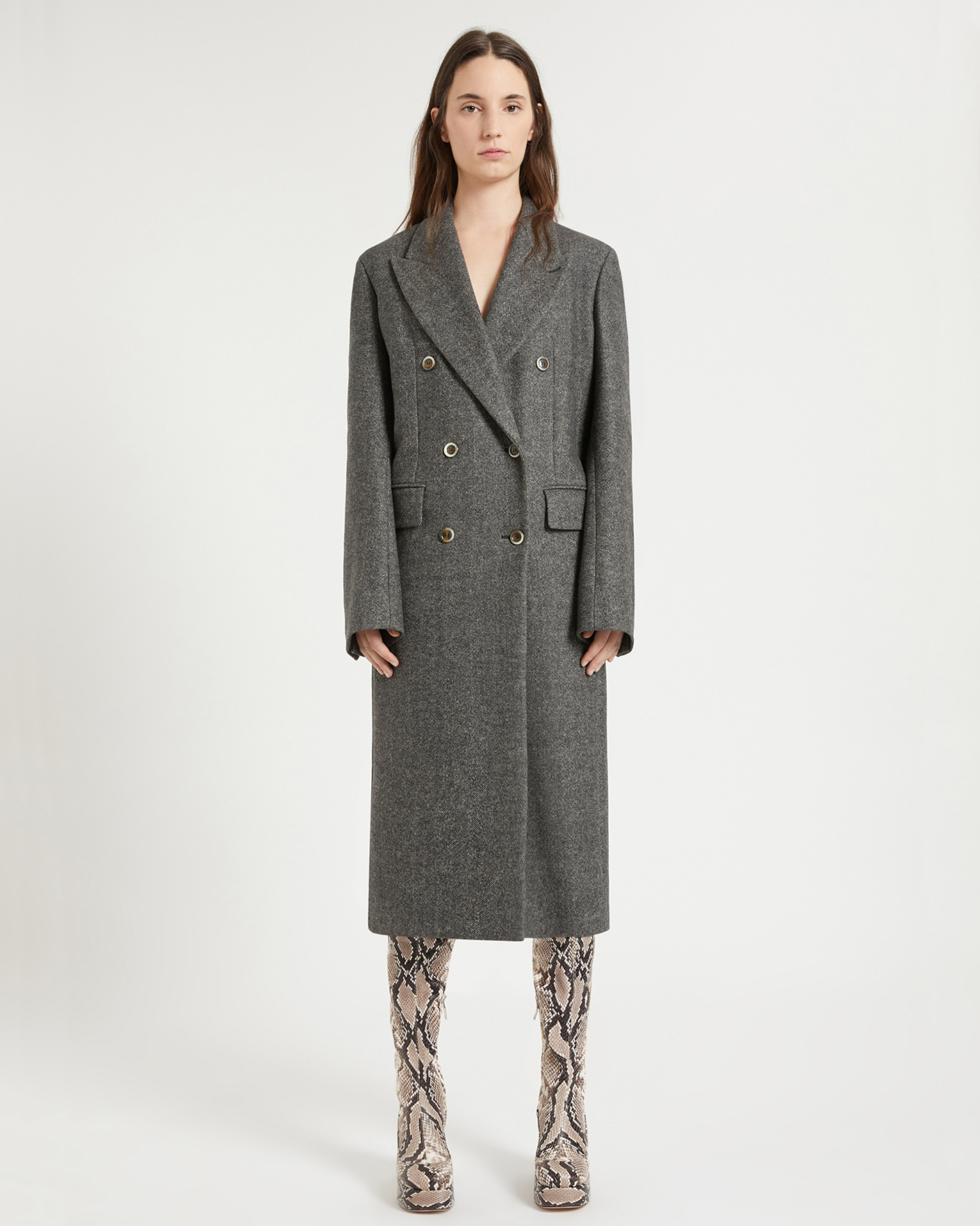Двубортное пальто Sportmax серого цвета с рисунком «елочка». Модель из двусторонней шерстяной ткани, имеет прямой крой бойфренд, лацканы и боковые карманы с клапаном. Стильное, универсальное и теплое пальто станет фаворитом вашего верхнего гардероба.