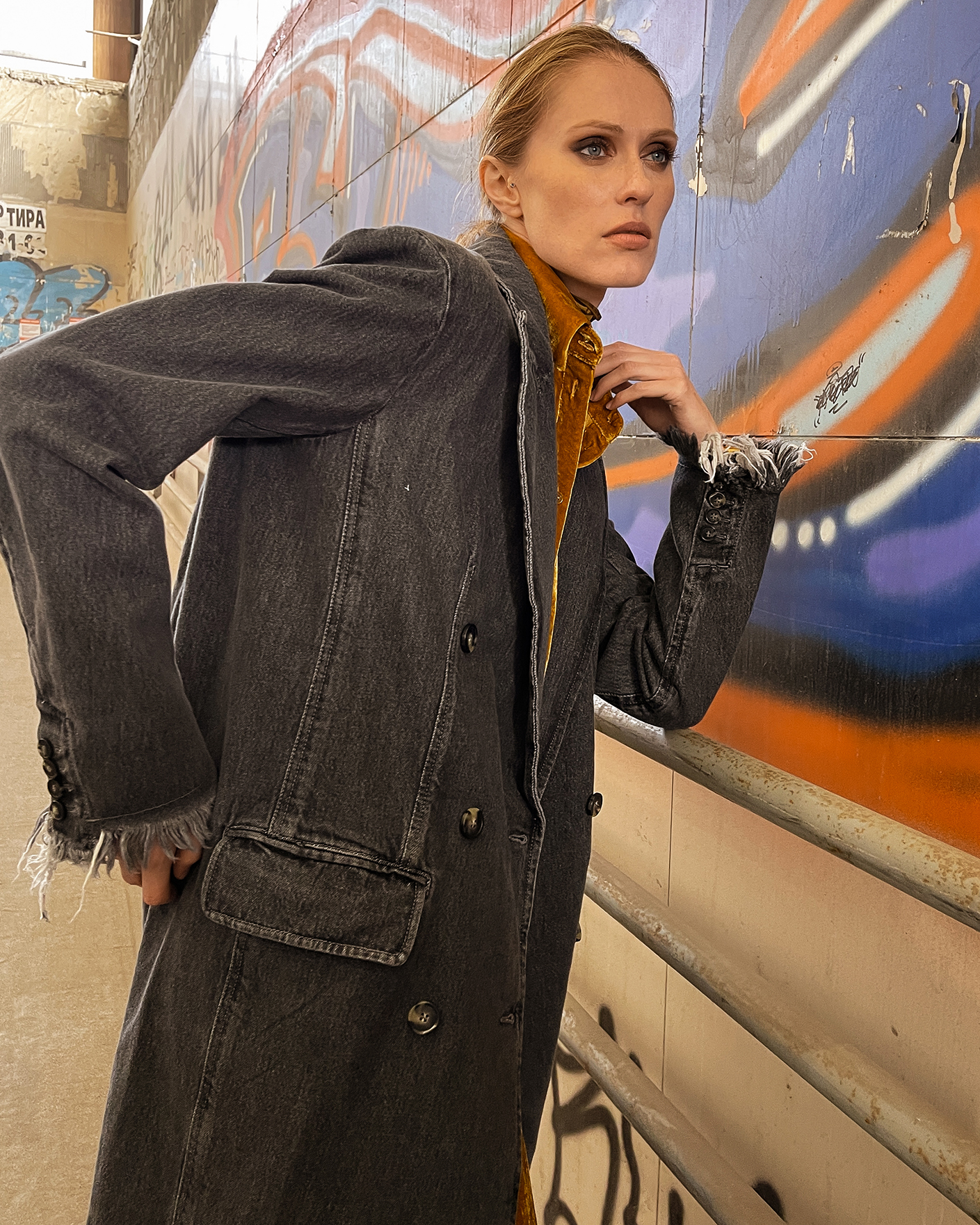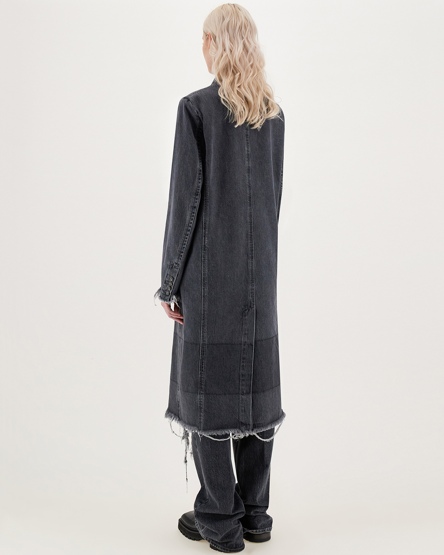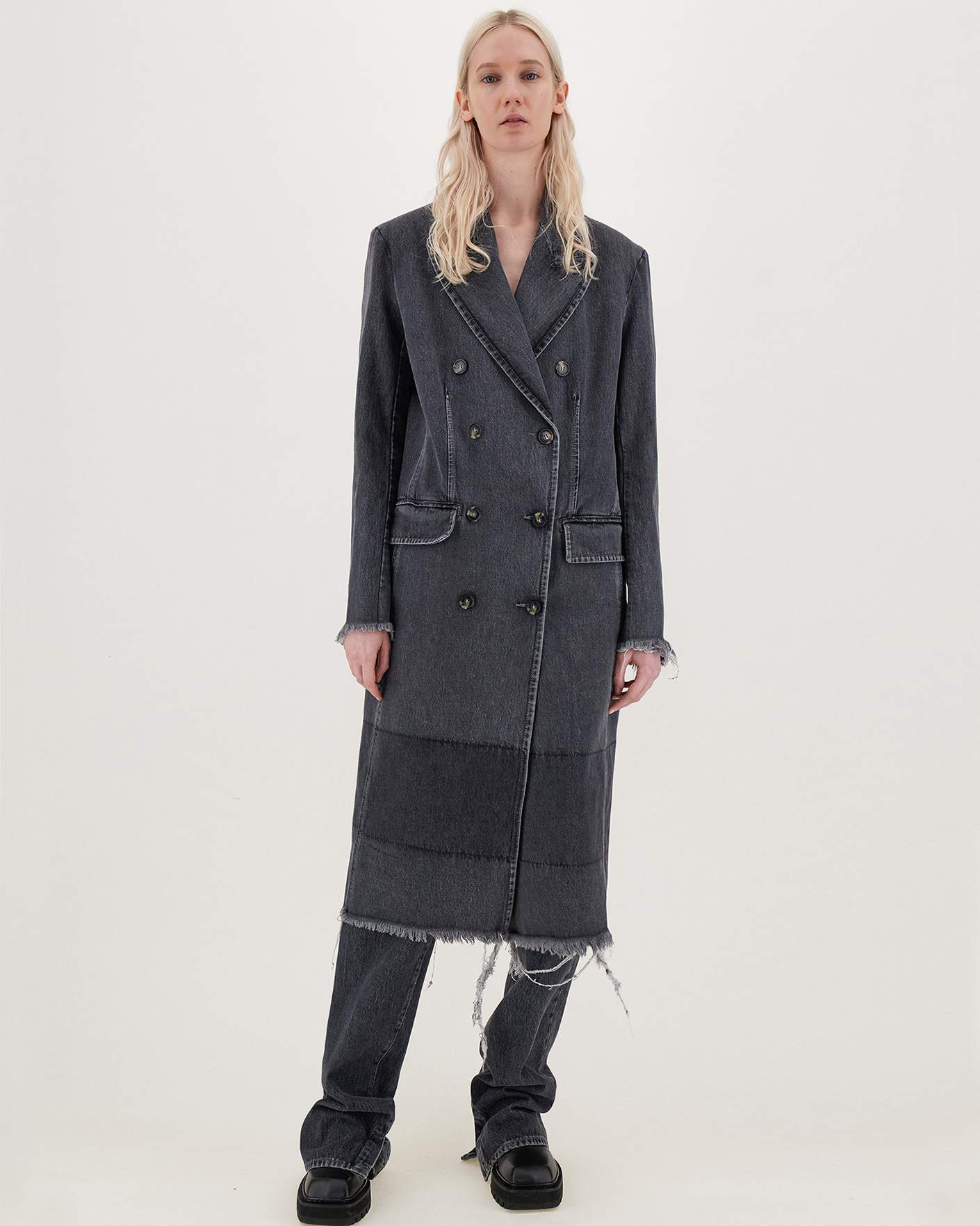 Двубортное, джинсовое пальто Sportmax серого цвета из 100% хлопка. Модель с лацканами, в стиле бойфренда, имеет карманы с клапаном по бокам. Низ и края манжет декорированы бахромой. Стильное, супермодное пальто станет уникальной вещью вашего гардероба.