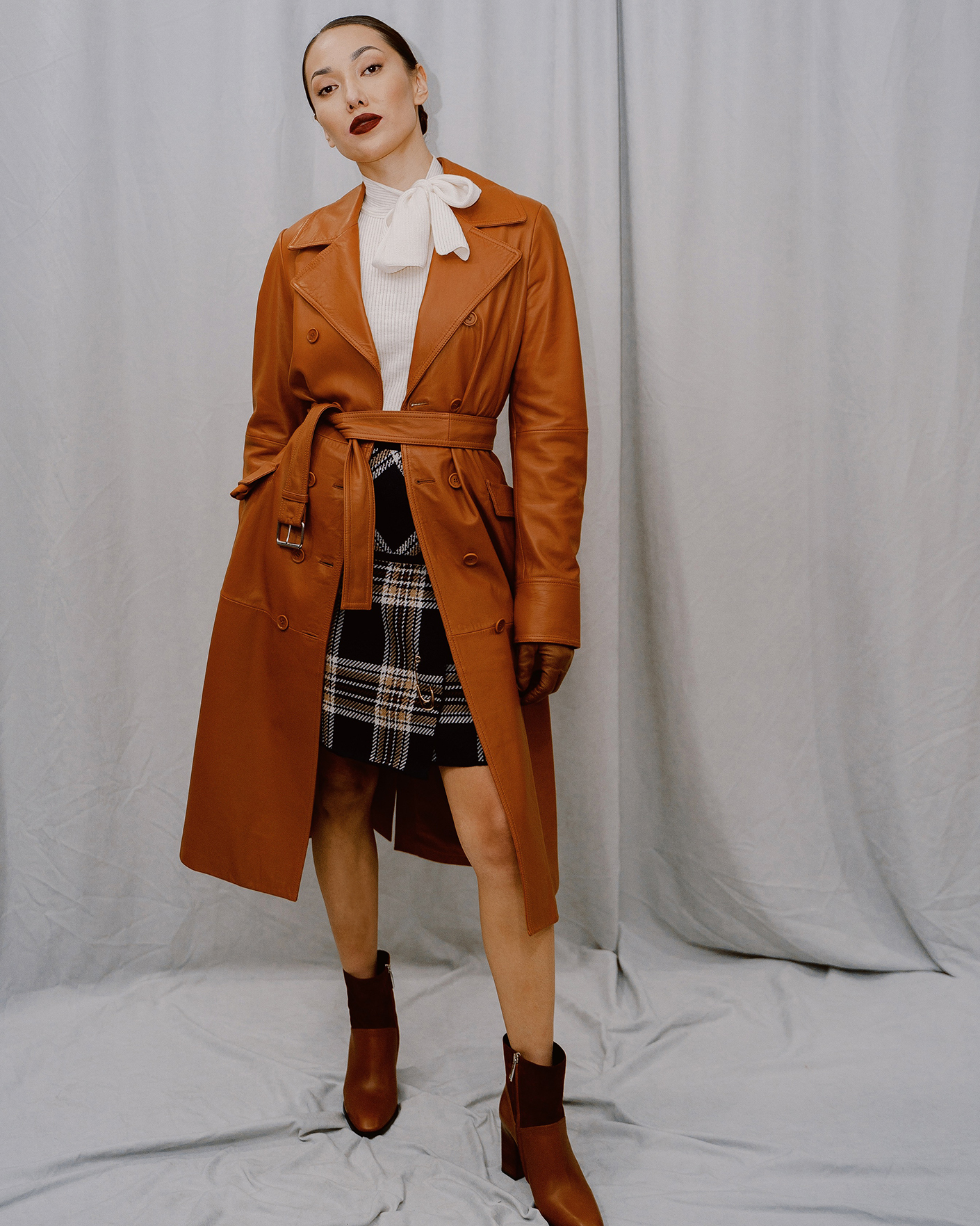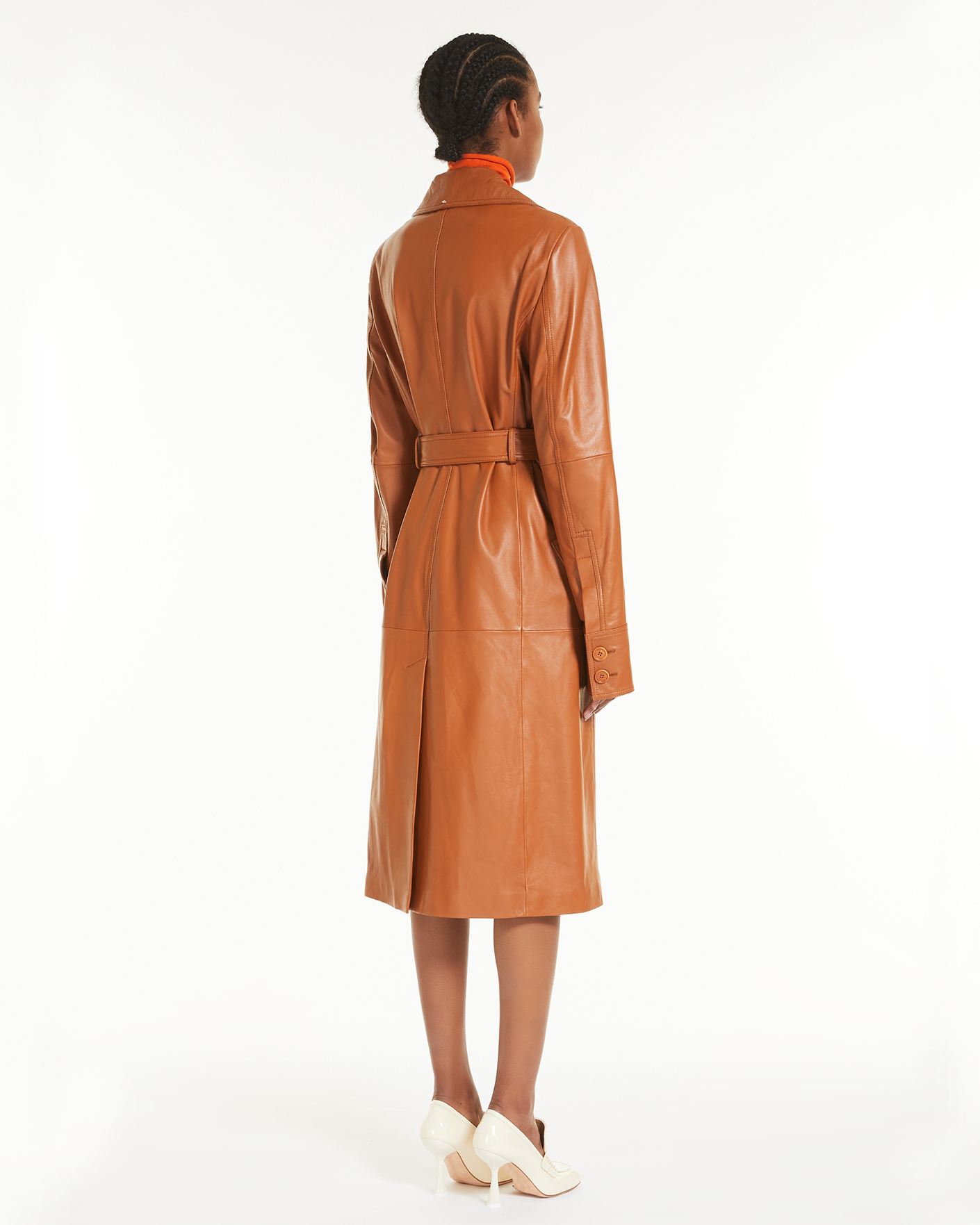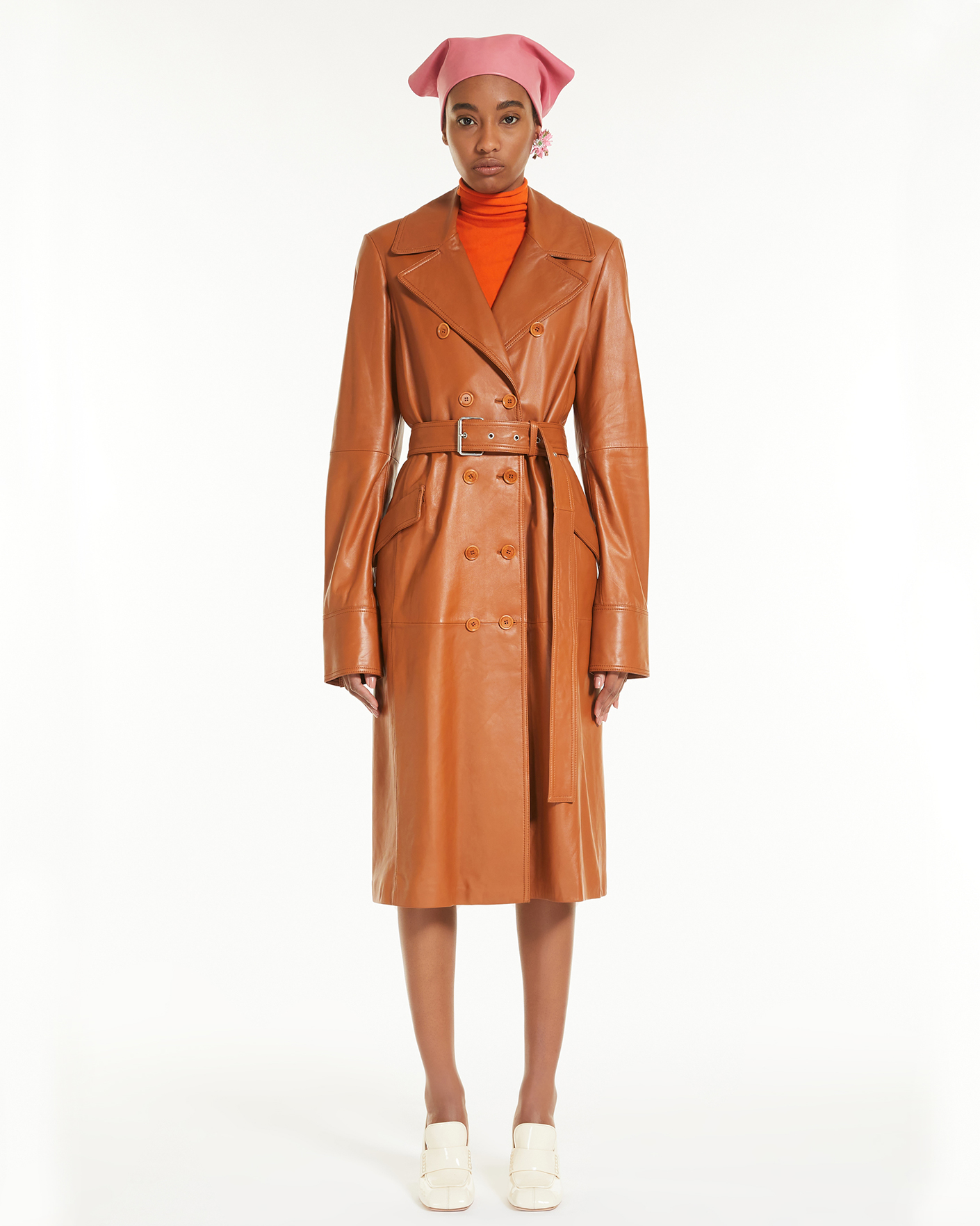 Стильный плащ-тренчкот Sportmax орехового цвета выполнен из 100% кожи. Двубортная модель с широкими лацканами, на пуговицах в тон. Имеются врезные карманы с клапанами по бокам. Стильный плащ-тренчкот станет фаворитом вашего верхнего гардероба.