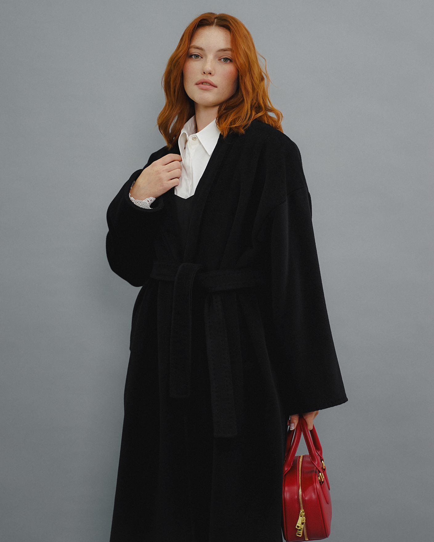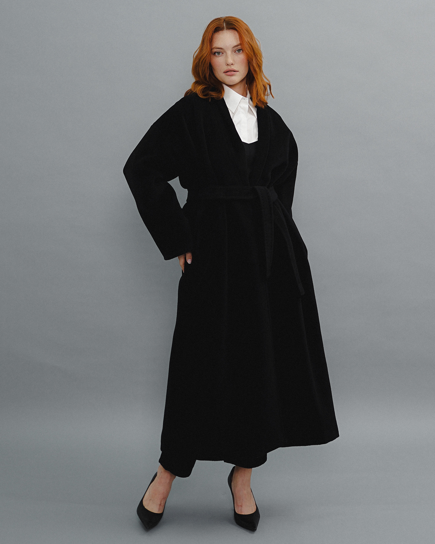Универсальное пальто-халат Marella черного цвета выполнено из 100% шерсти. Модель прямого кроя, однобортная застежка, врезные карманы по бокам, вставной пояс в тон. Спущенняа линия плеча создает более расслабленный образ. Пальто-халат на каждый день окутает теплыми объятиями.