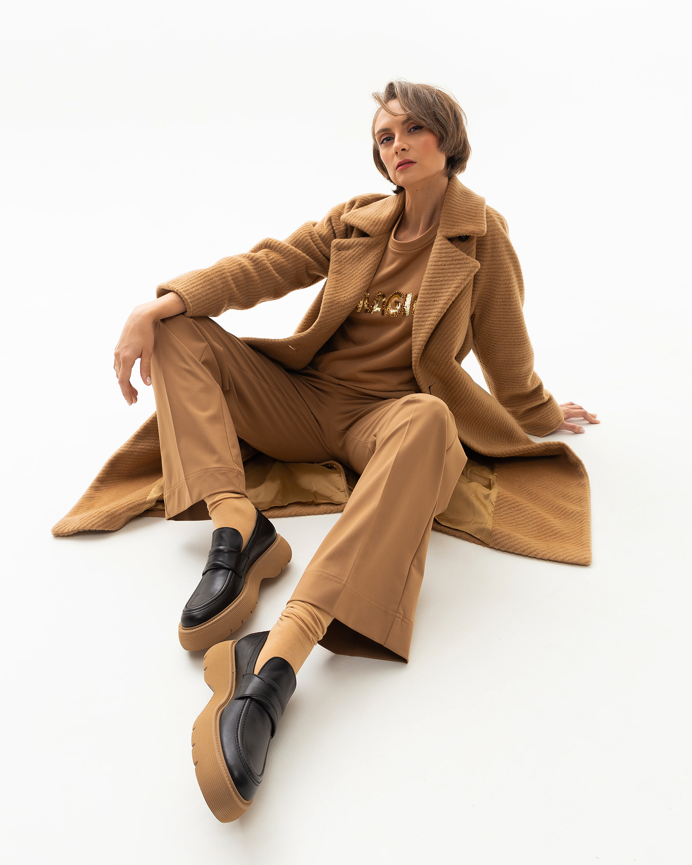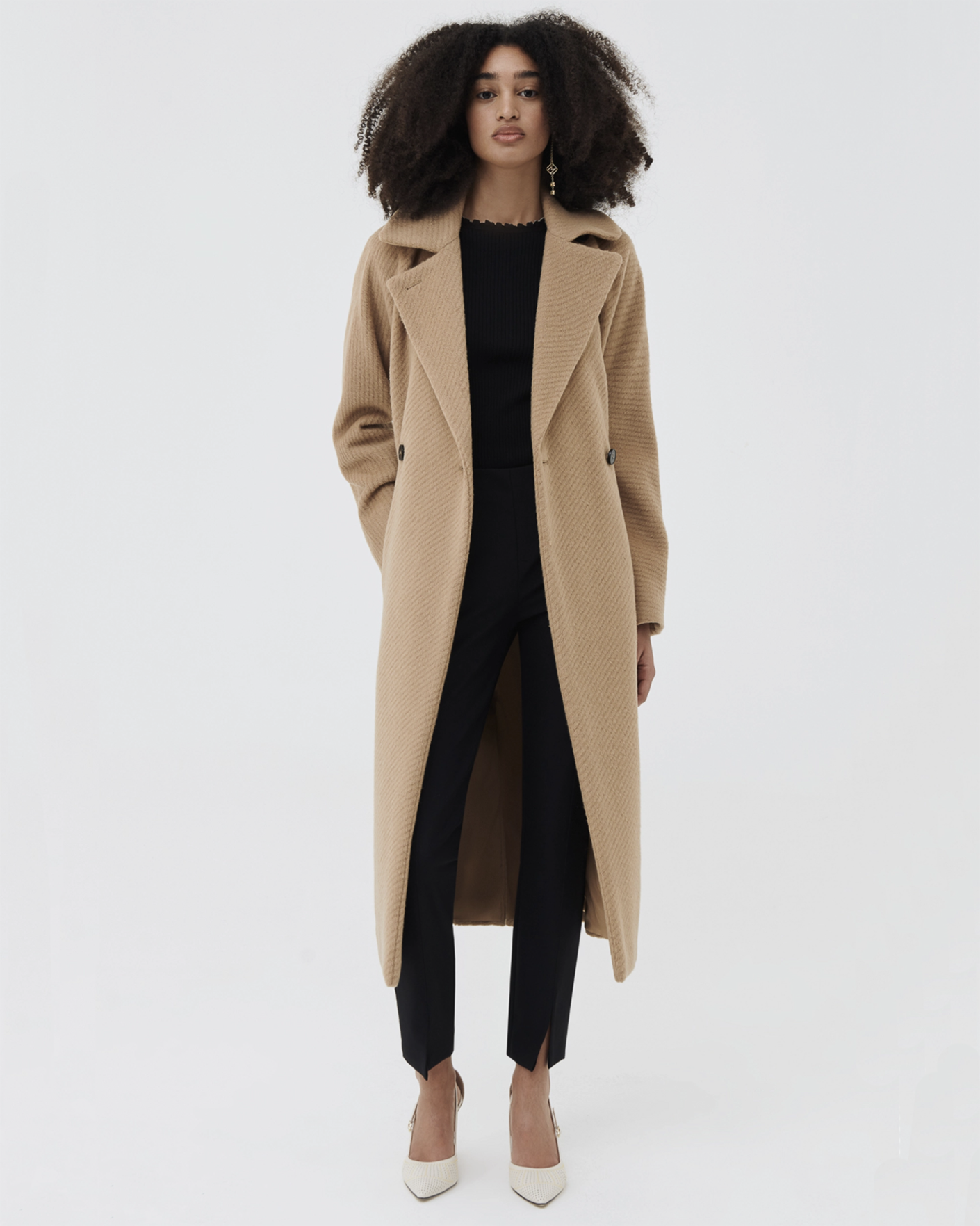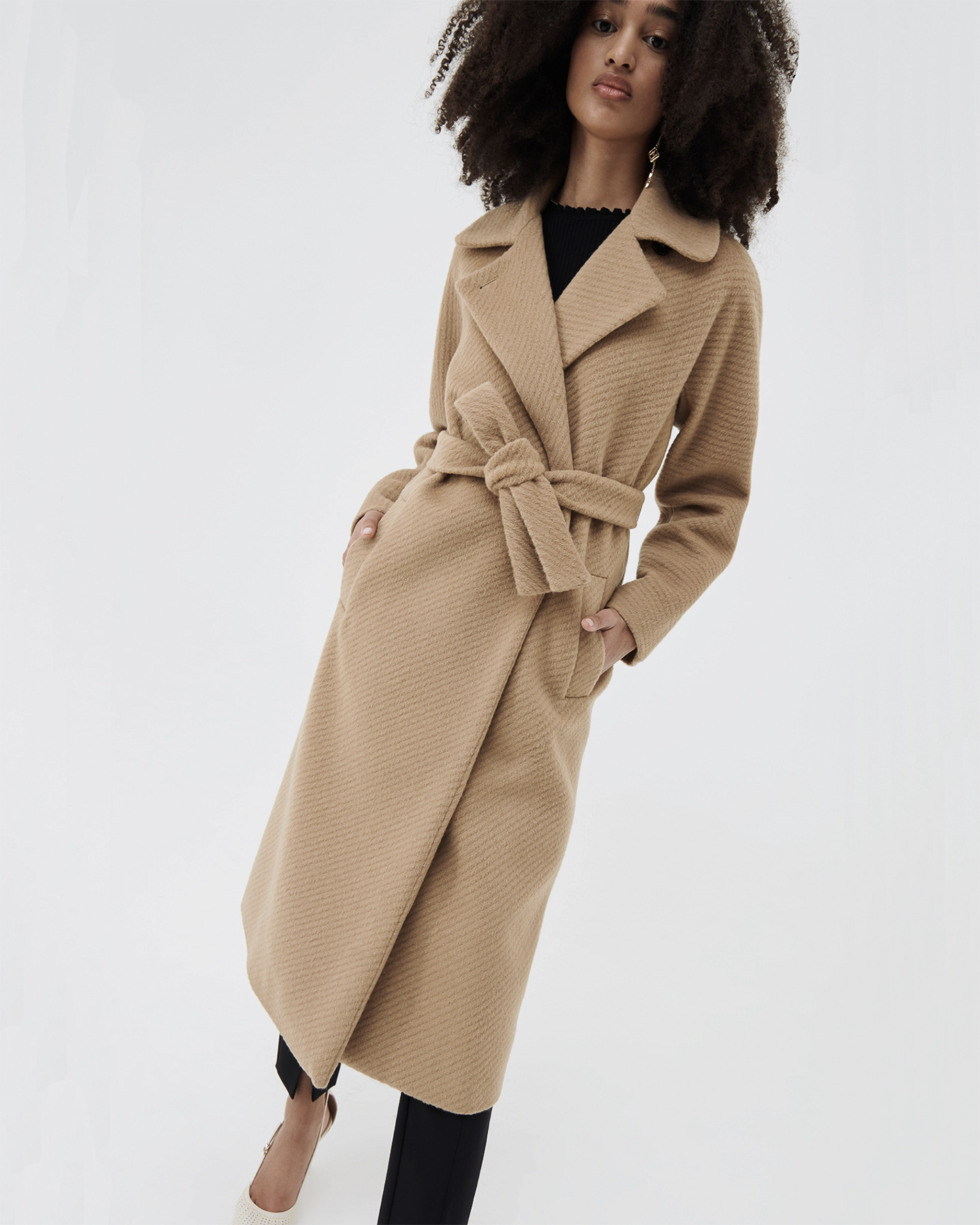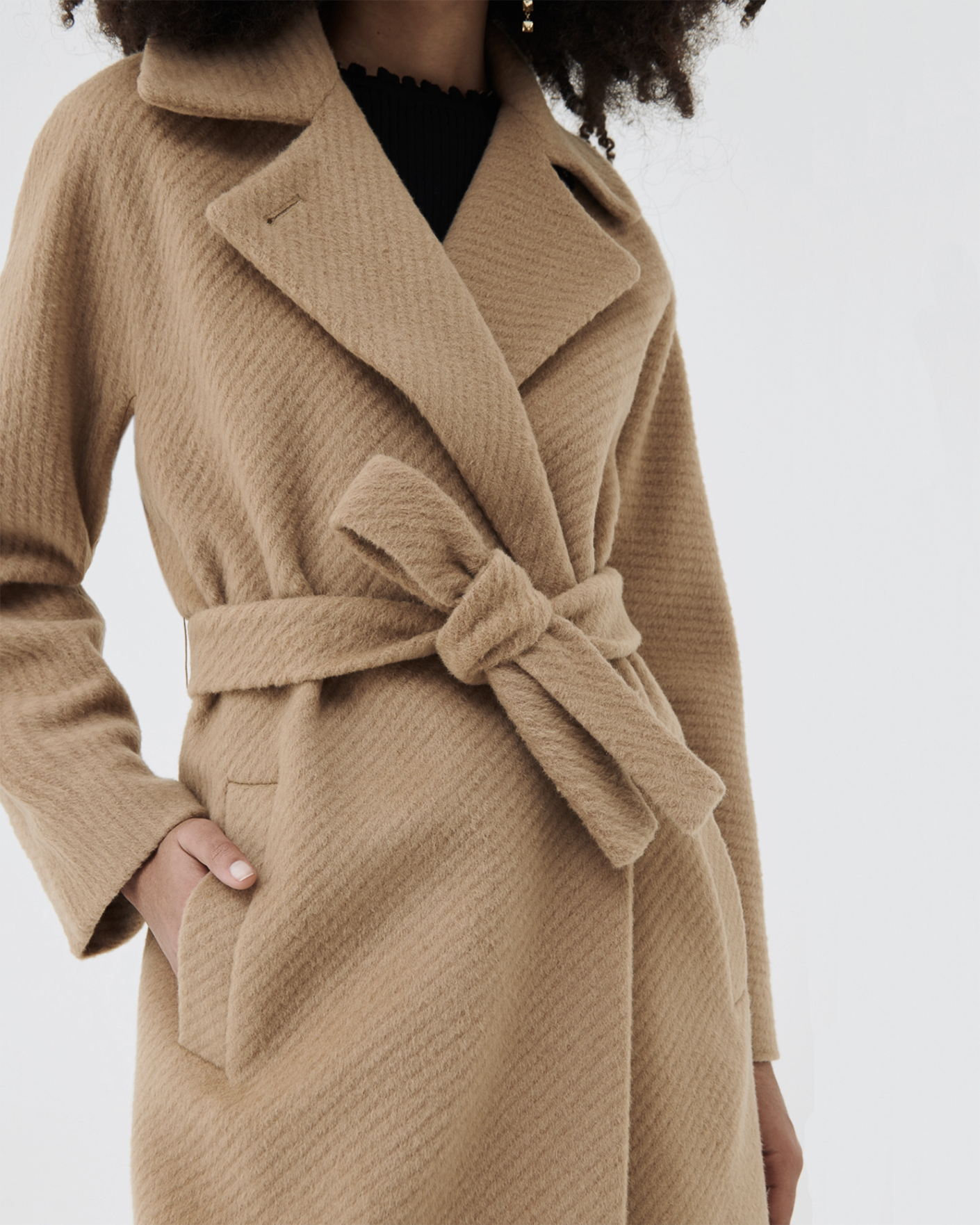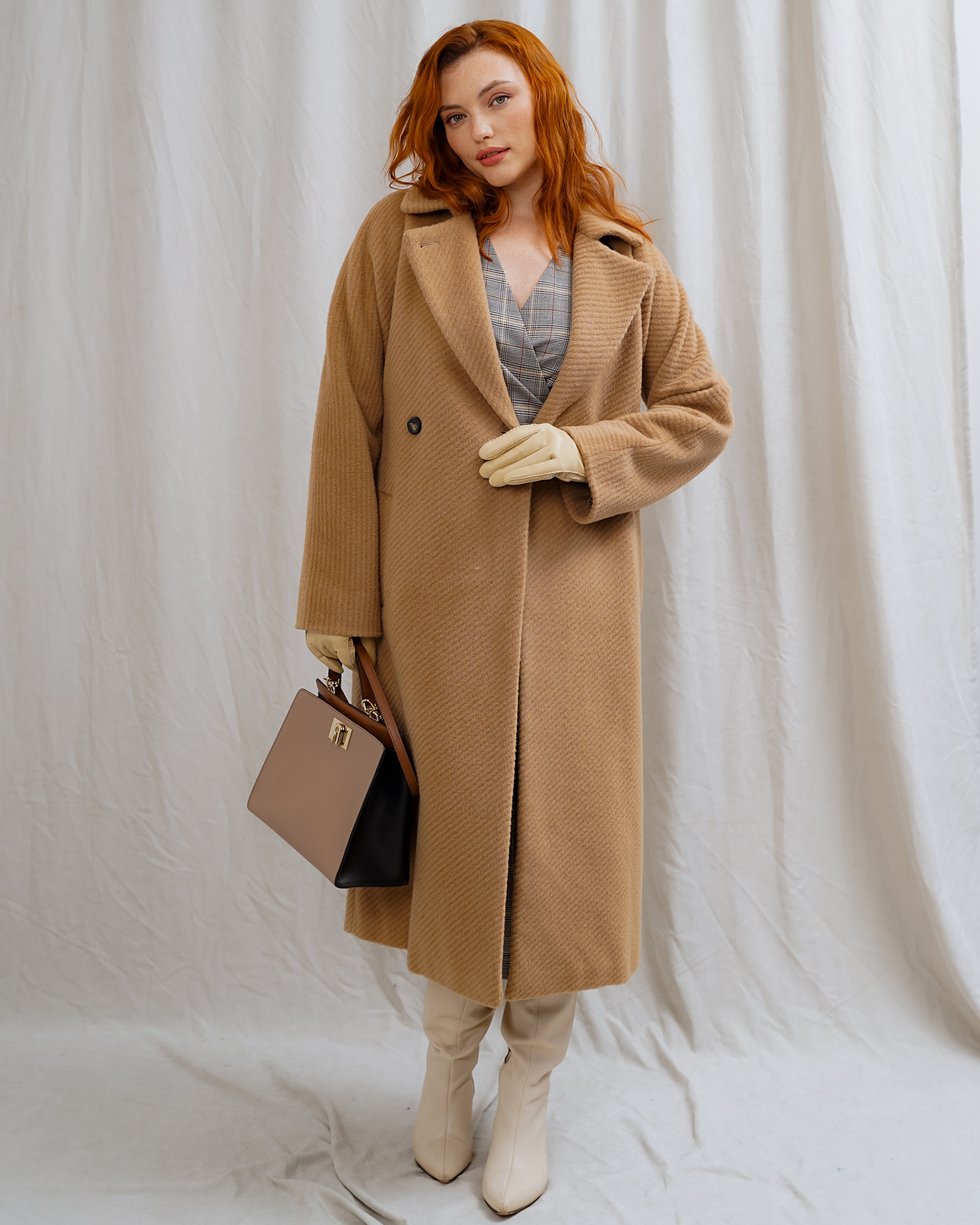 Мохеровое двубортное пальто-кокон Marella бежевого цвета в диагональный рисунок. Шерстяная модель с широкими лацканами, застежка на две пуговицы, имеются врезные карманы по бокам. Линию талии можно подчеркнуть с помощью пояса в тон. Пальто - идеальный вариант на каждый день.