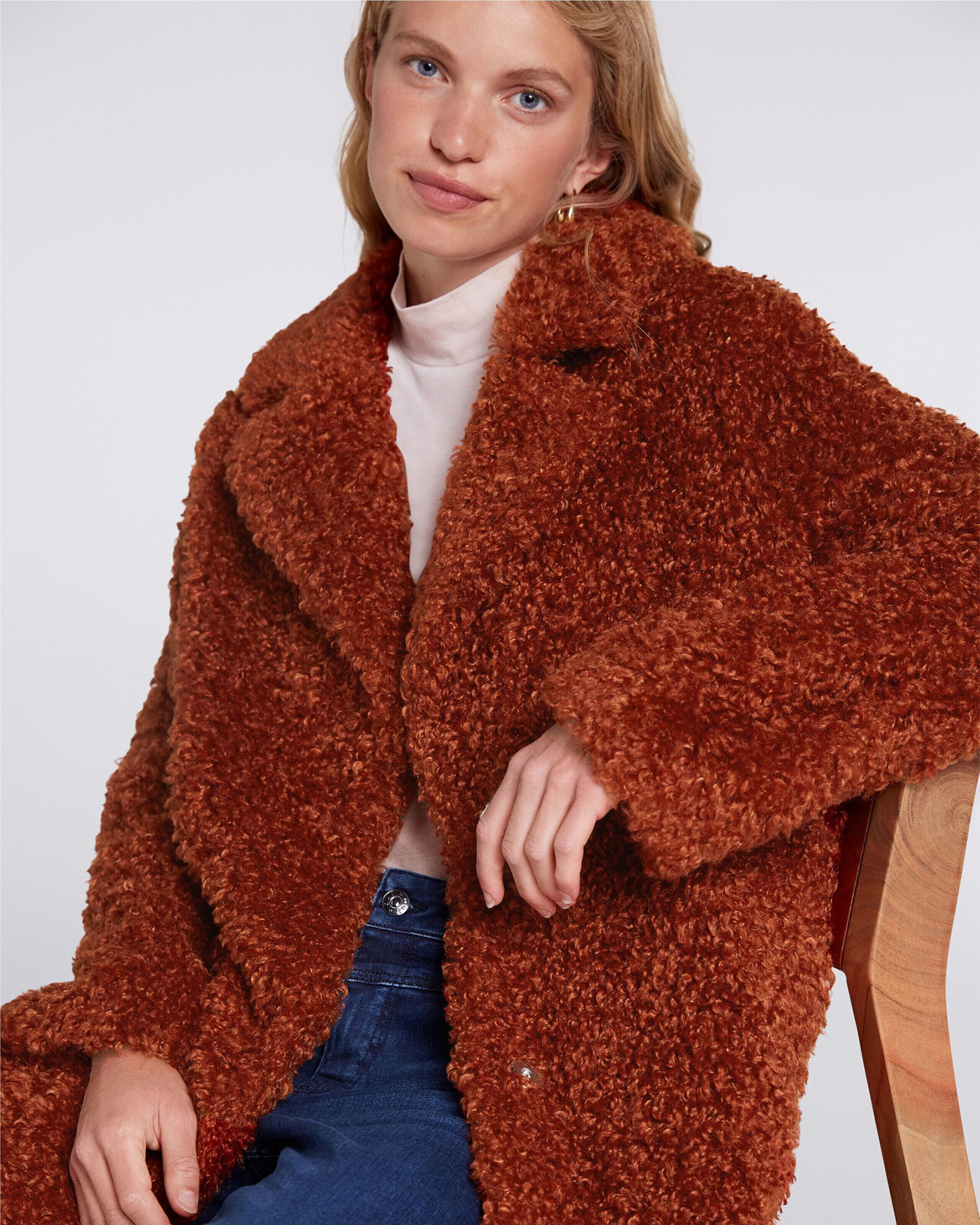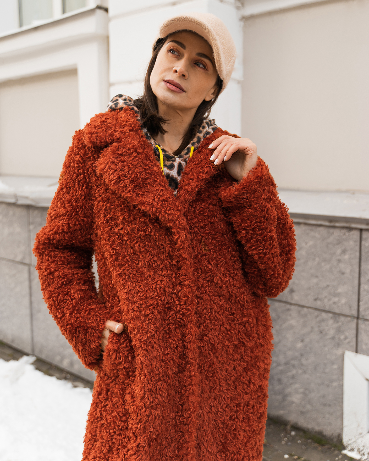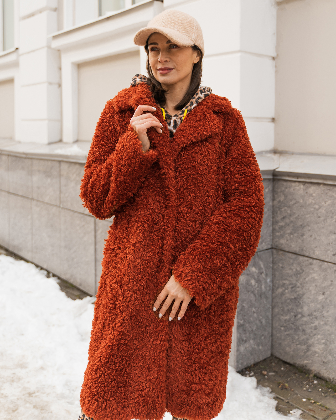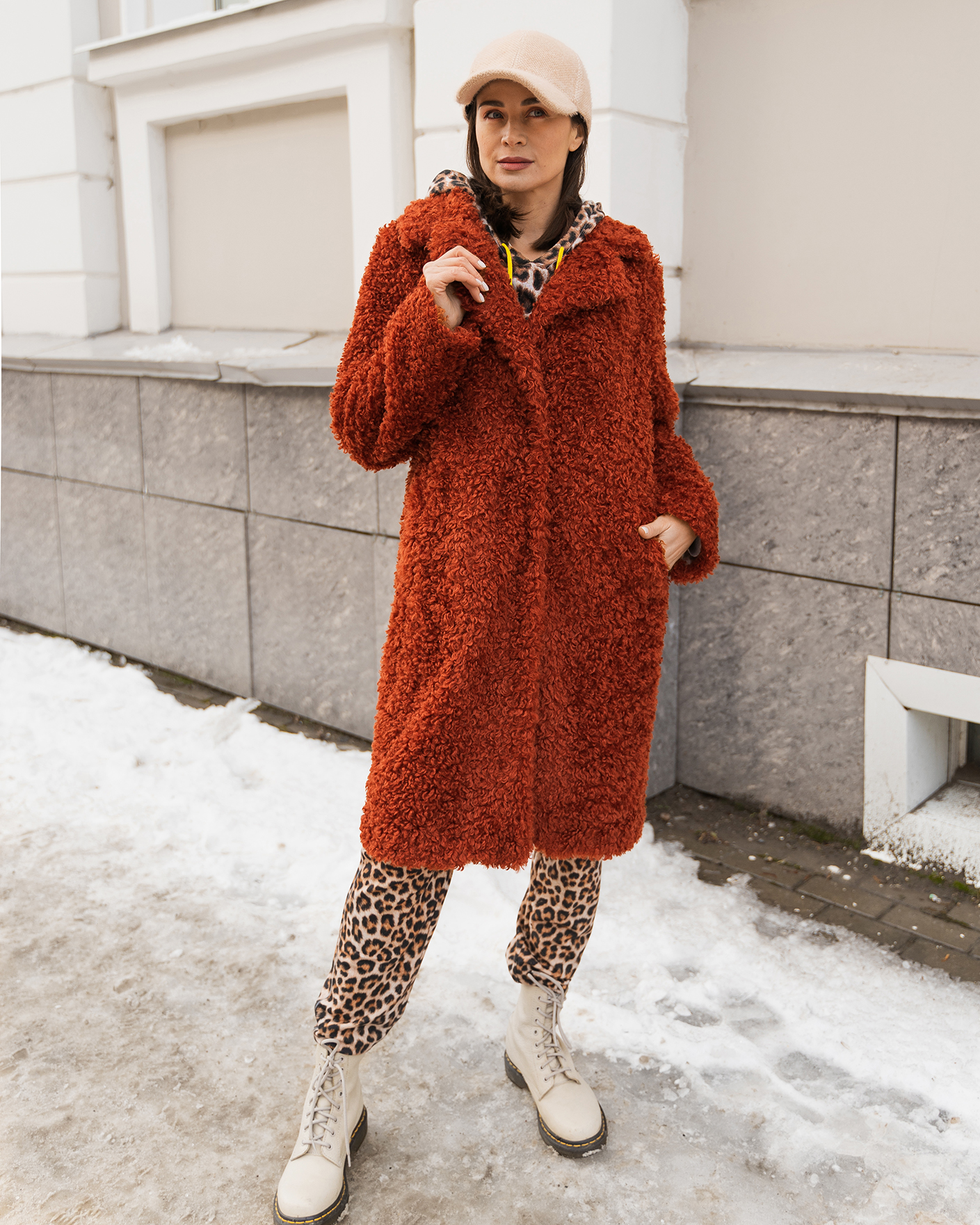 Яркое пальто OUI кирпичного цвета в меховую текстуру. Модель с лацканами, застежкой на пуговицу, имеются врезные карманы по бокам. Стильное пальто станет фаворитом вашего гардероба.