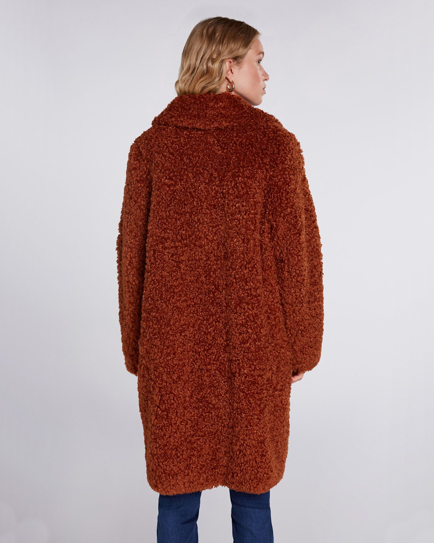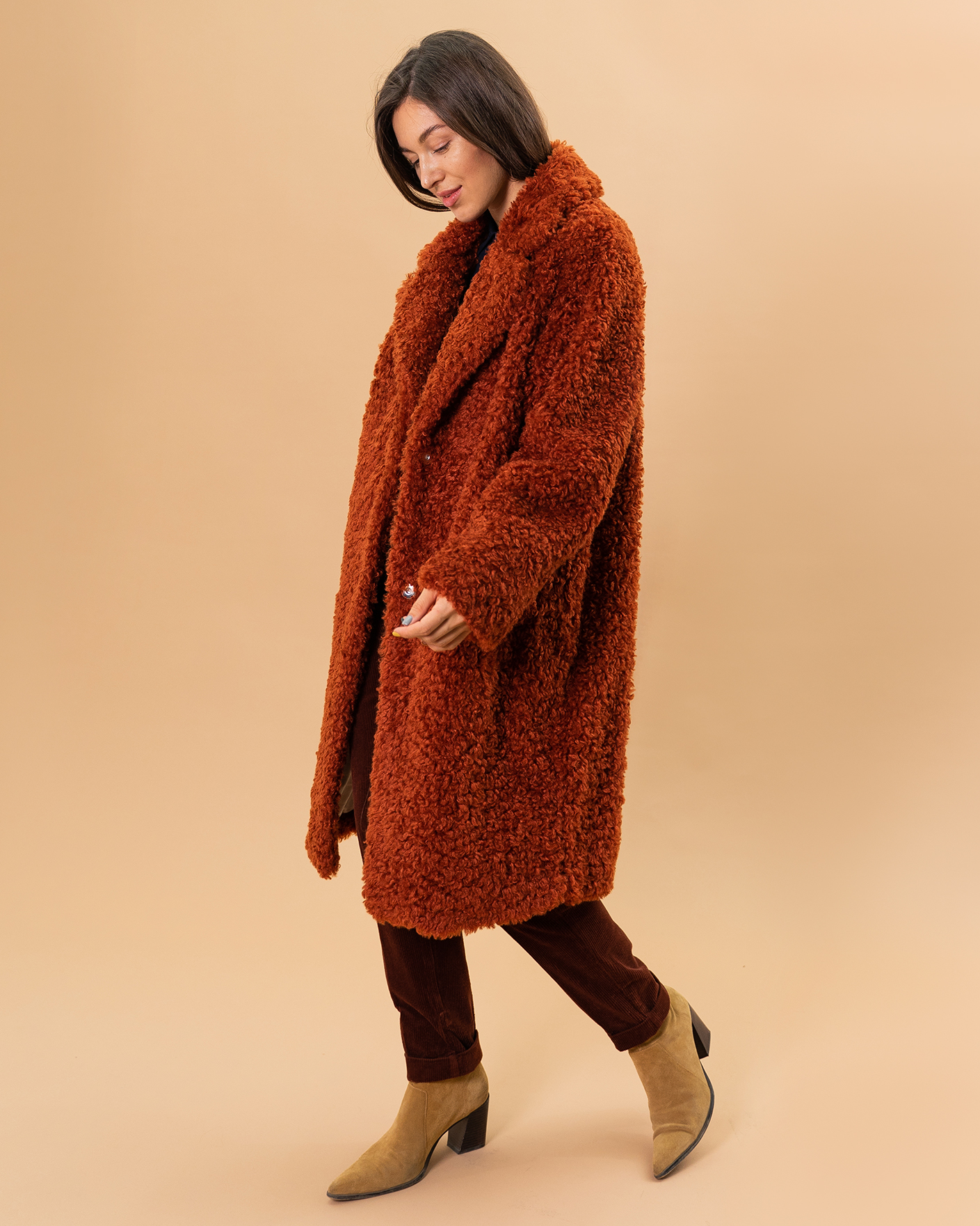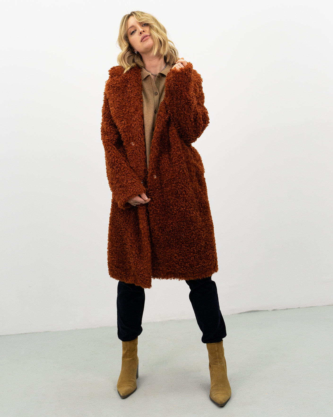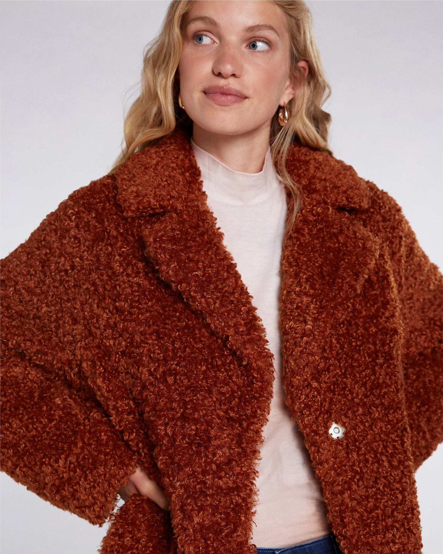 Яркое пальто OUI кирпичного цвета в меховую текстуру. Модель с лацканами, застежкой на пуговицу, имеются врезные карманы по бокам. Стильное пальто станет фаворитом вашего гардероба.