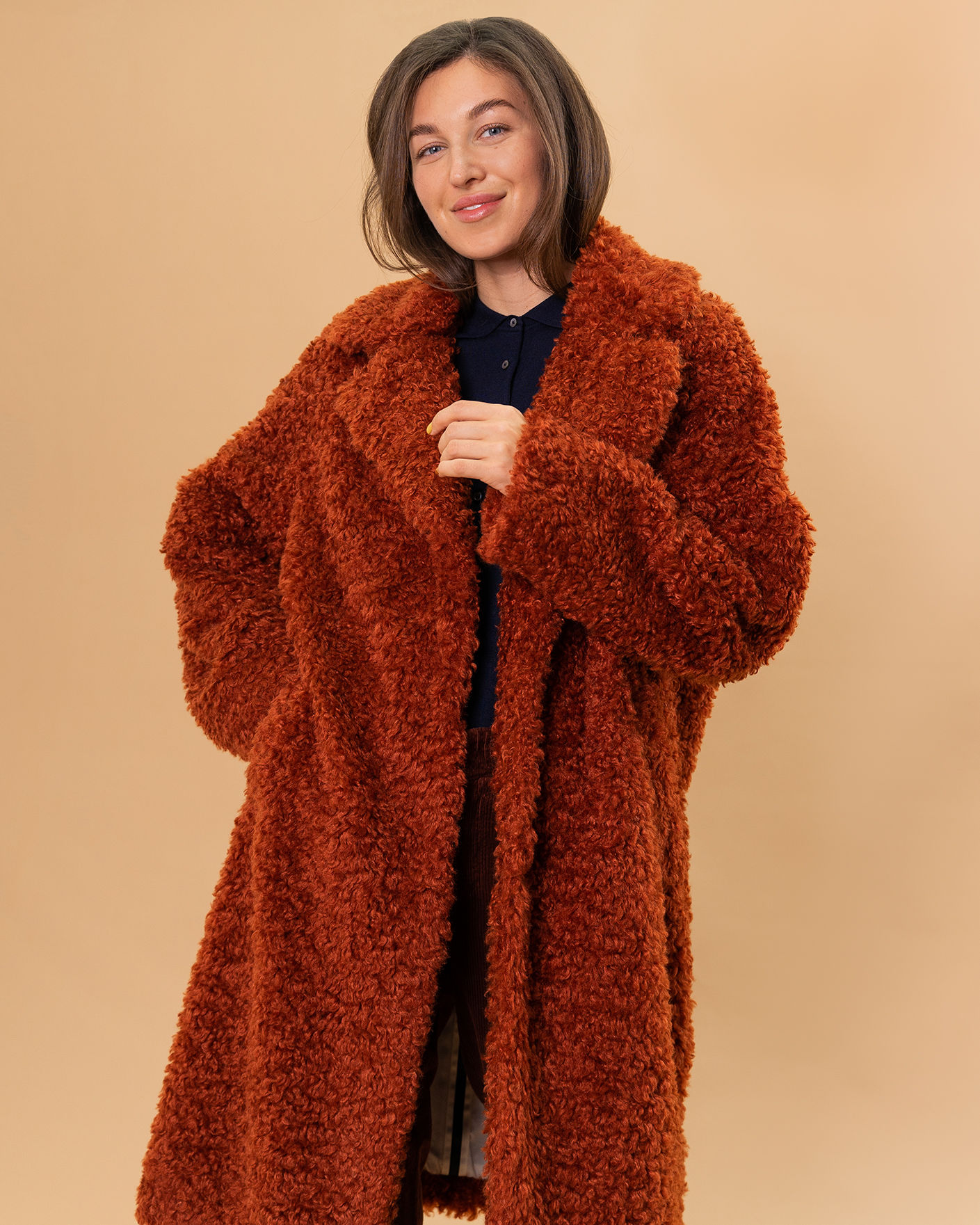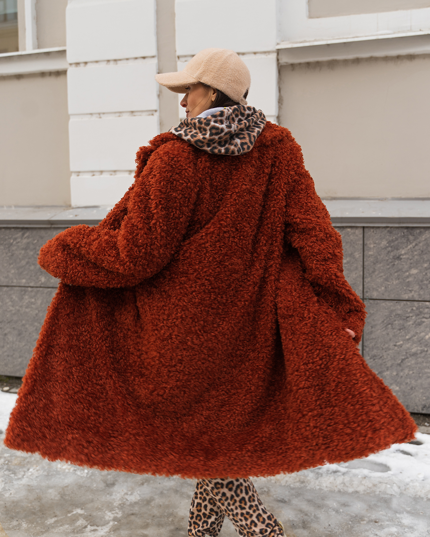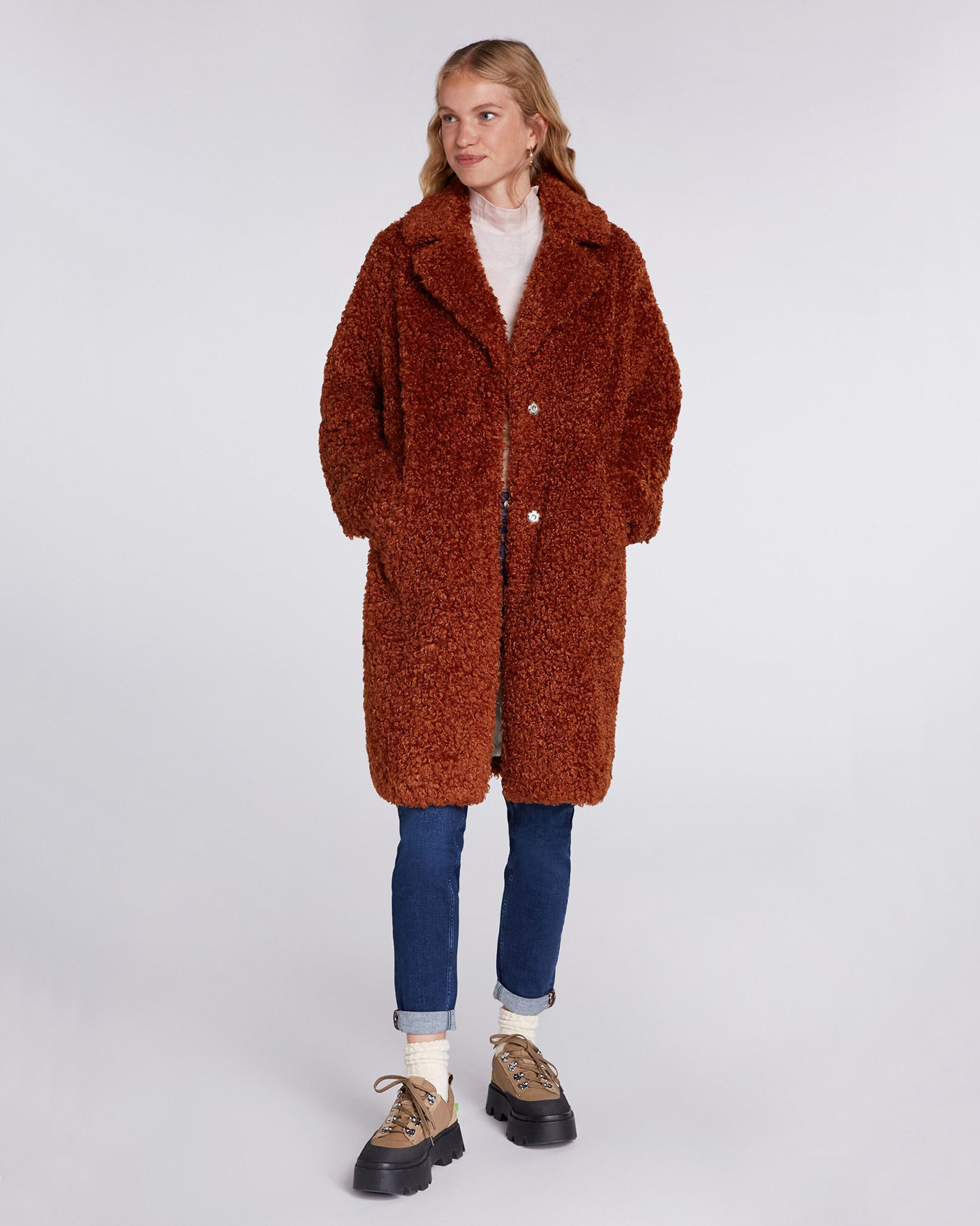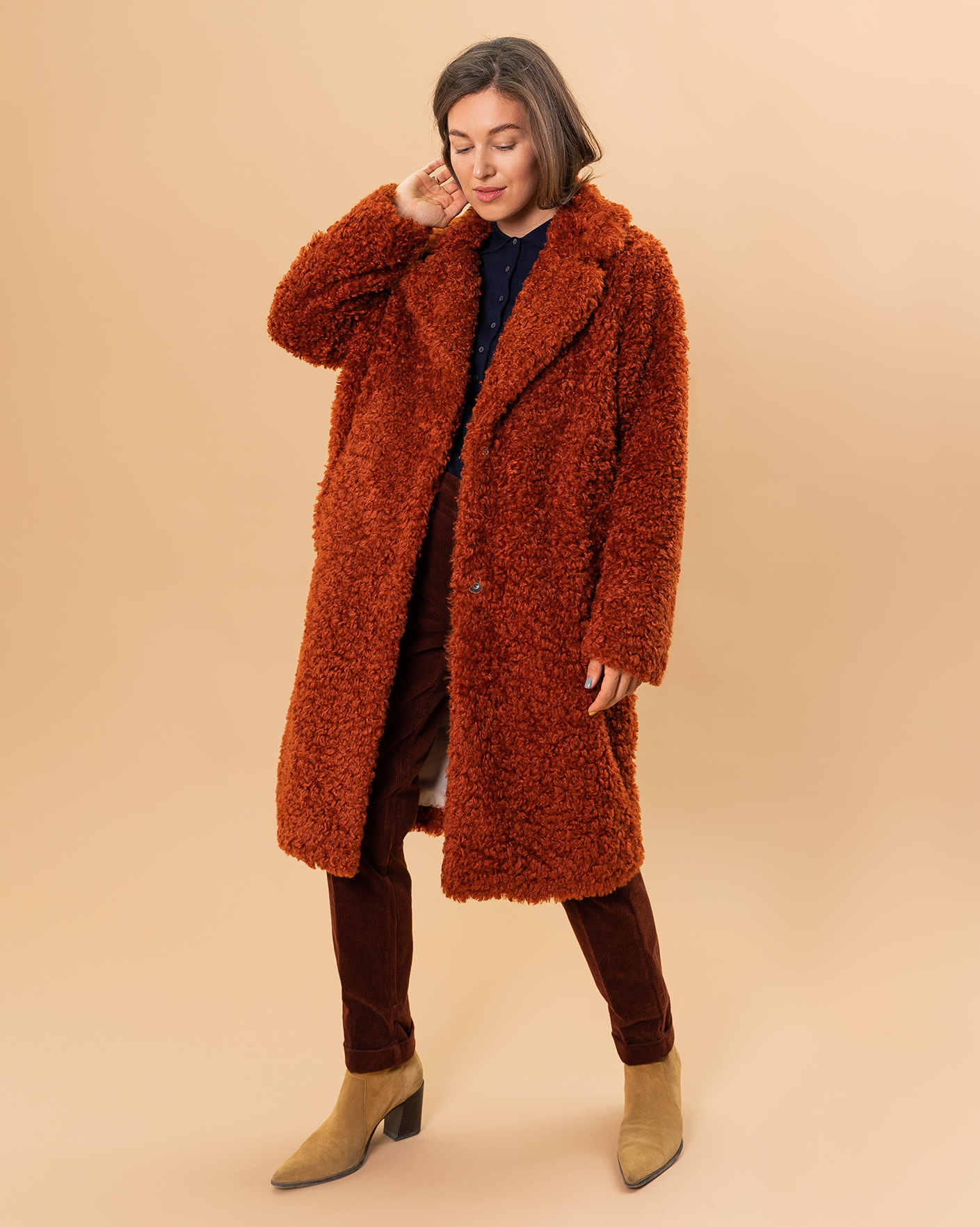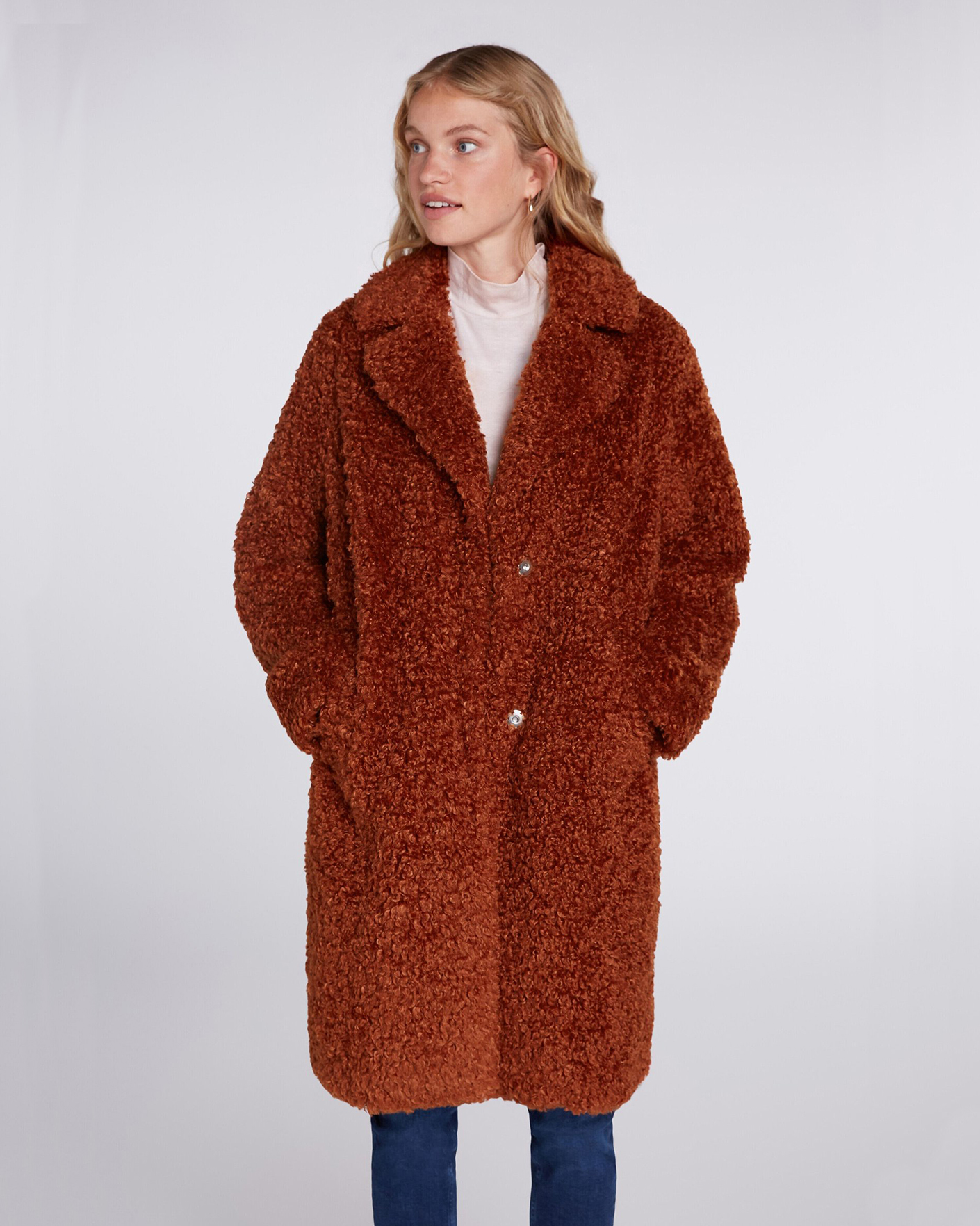Яркое пальто OUI кирпичного цвета в меховую текстуру. Модель с лацканами, застежкой на пуговицу, имеются врезные карманы по бокам. Стильное пальто станет фаворитом вашего гардероба.