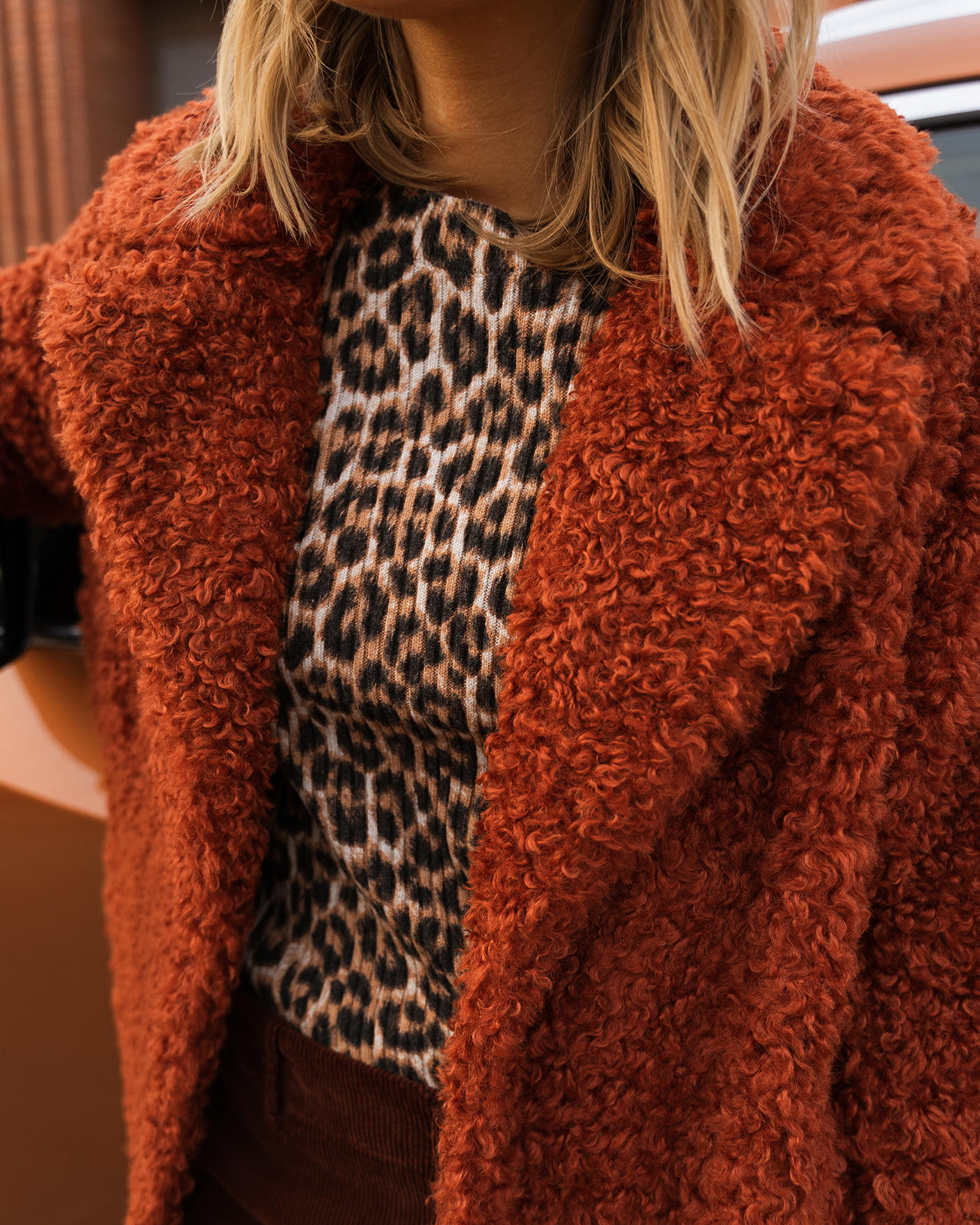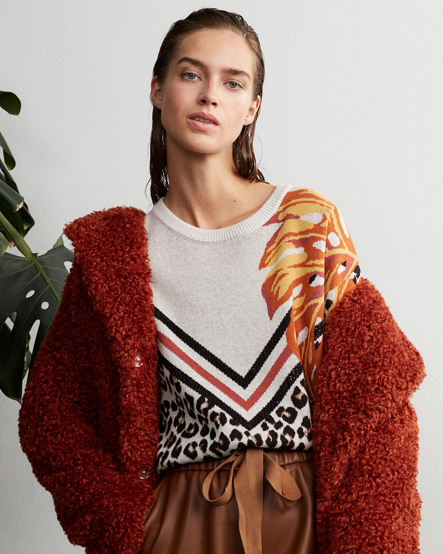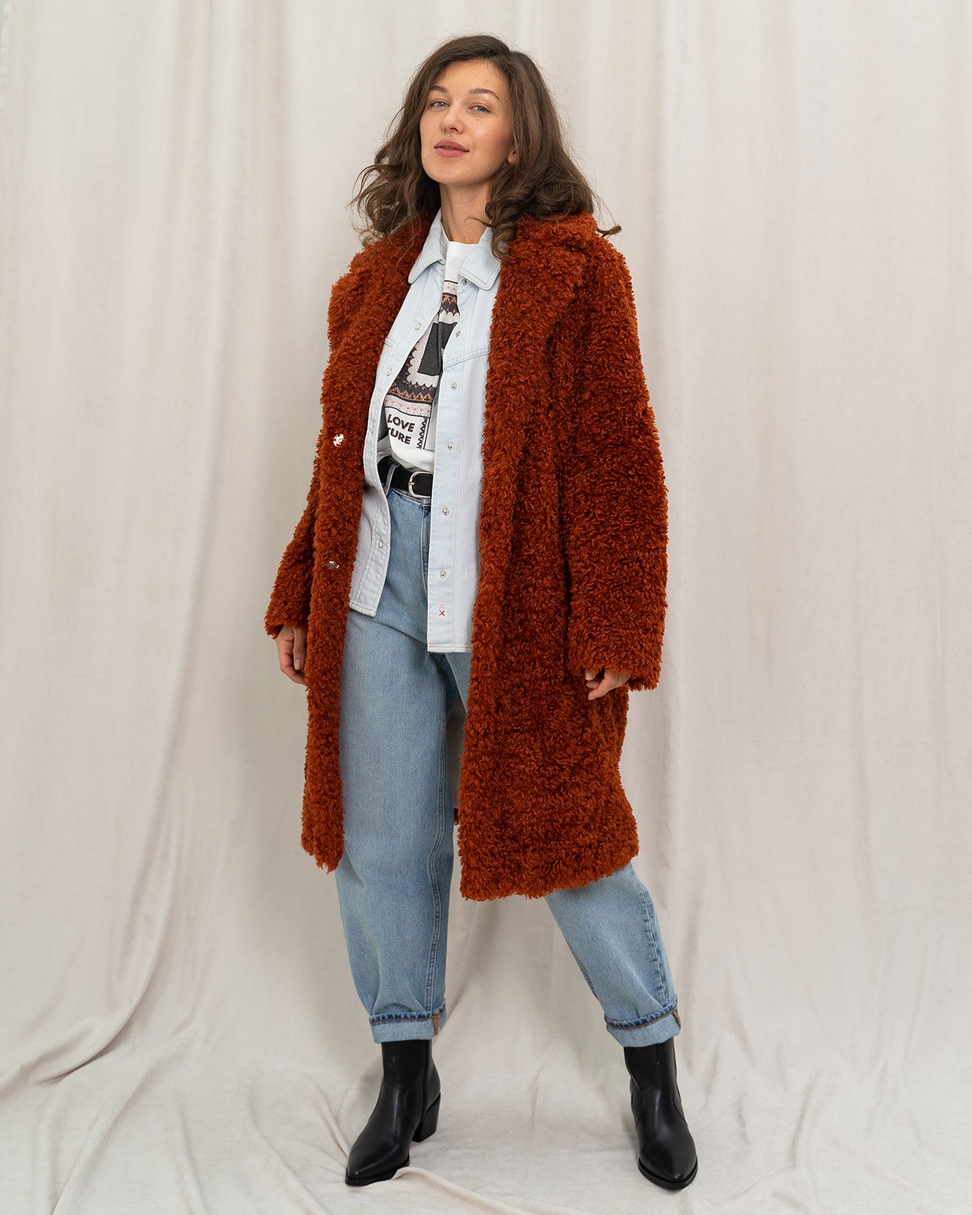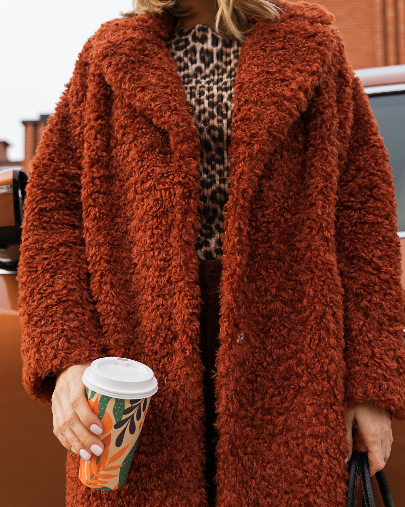 Яркое пальто OUI кирпичного цвета в меховую текстуру. Модель с лацканами, застежкой на пуговицу, имеются врезные карманы по бокам. Стильное пальто станет фаворитом вашего гардероба.