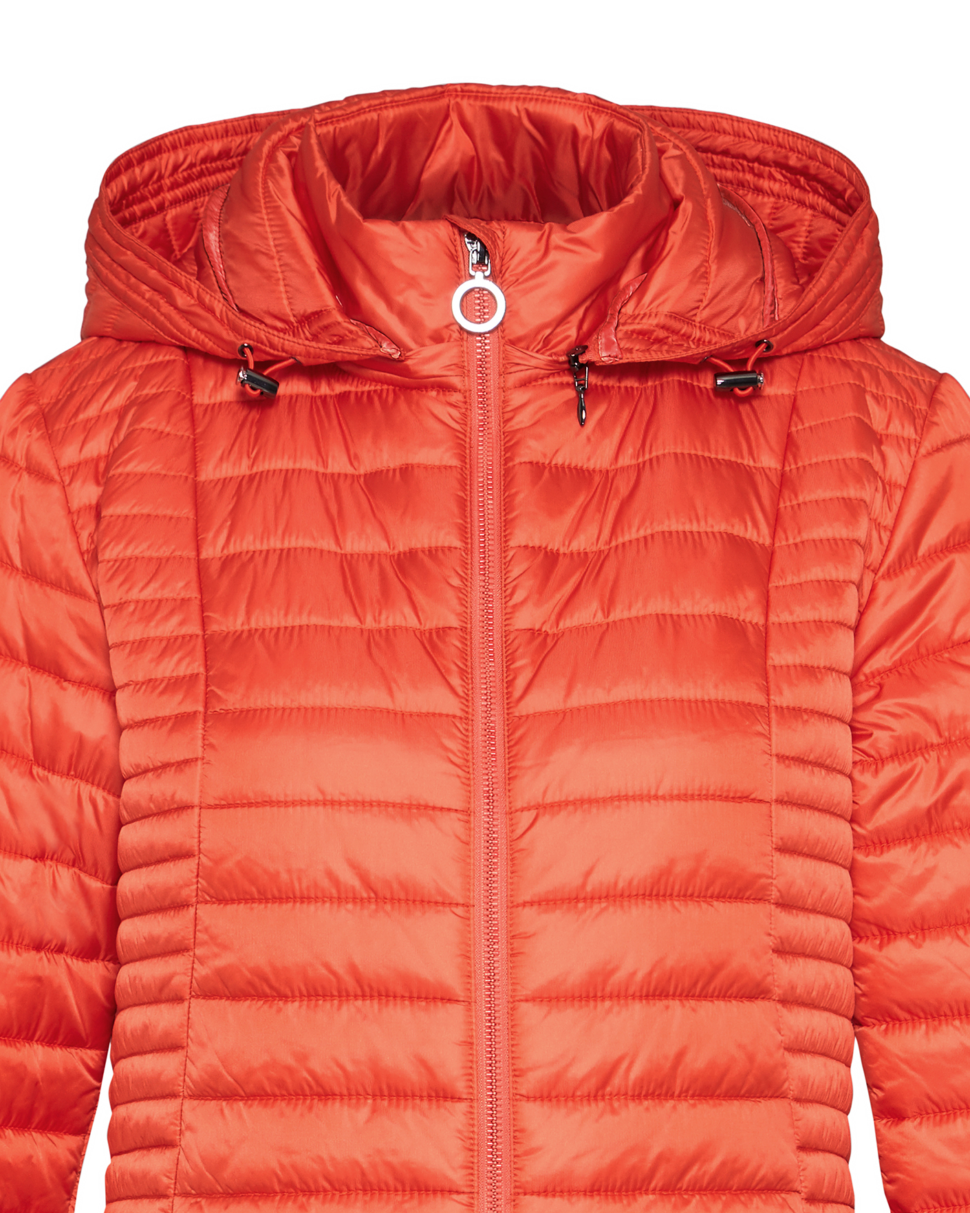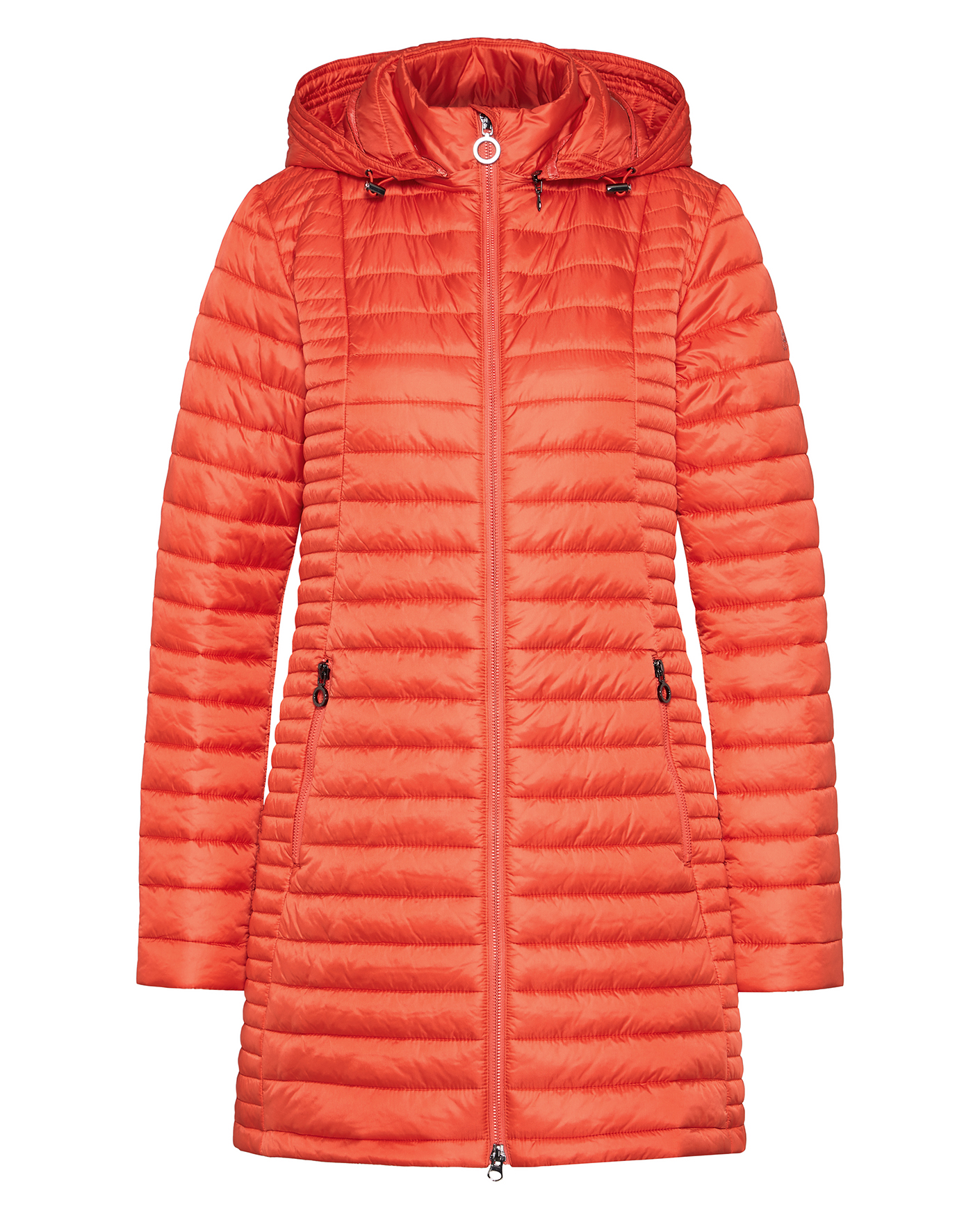 Утепленное пальто Bugatti красно-оренжевого цвета в горизонтальную стежку. Удлиненная модель с воротником-стойка, съемным регулируемым капюшоном, застежка и боковые карманы на молнии. Пальто - универсальаня вещь в прохладную погоду.