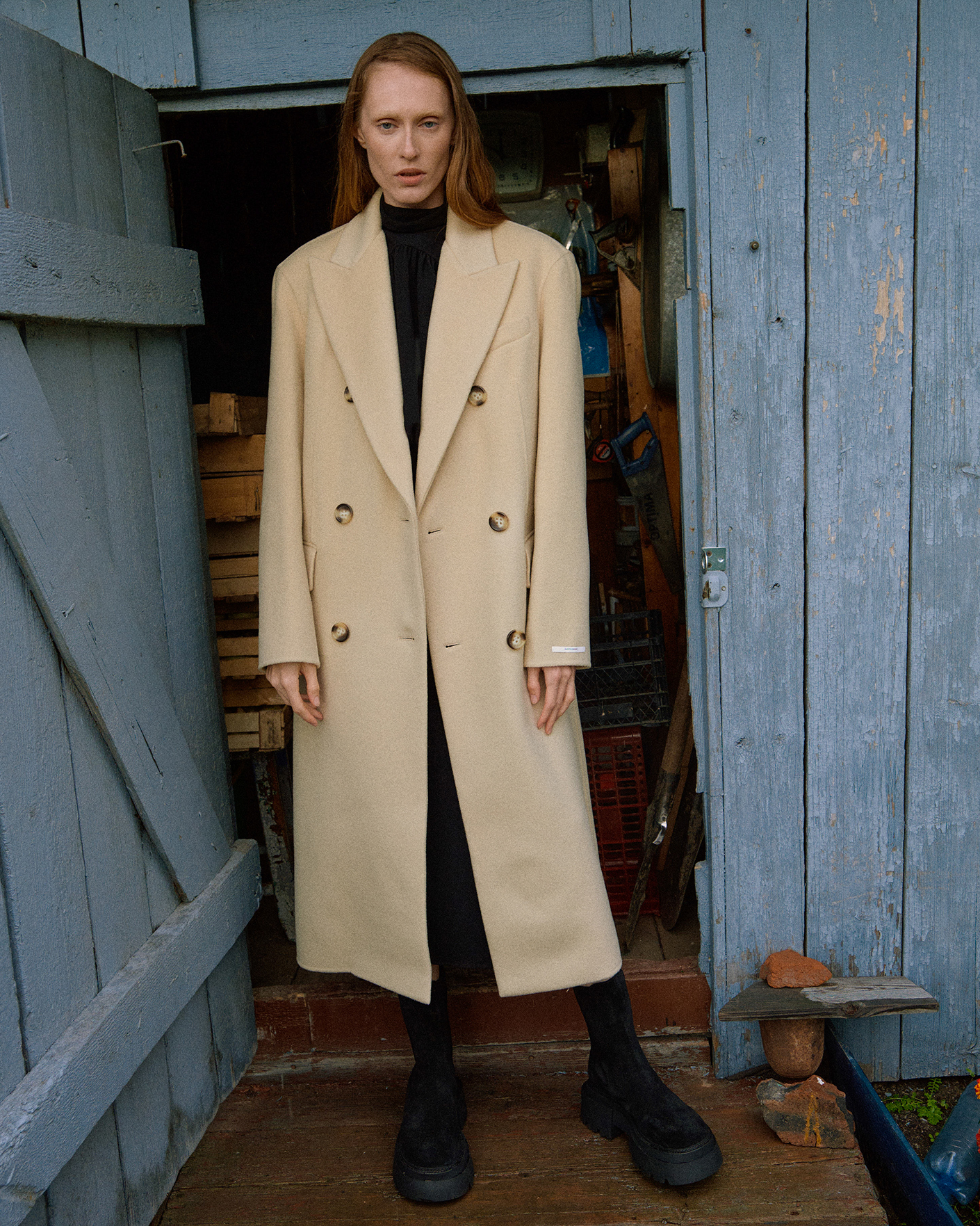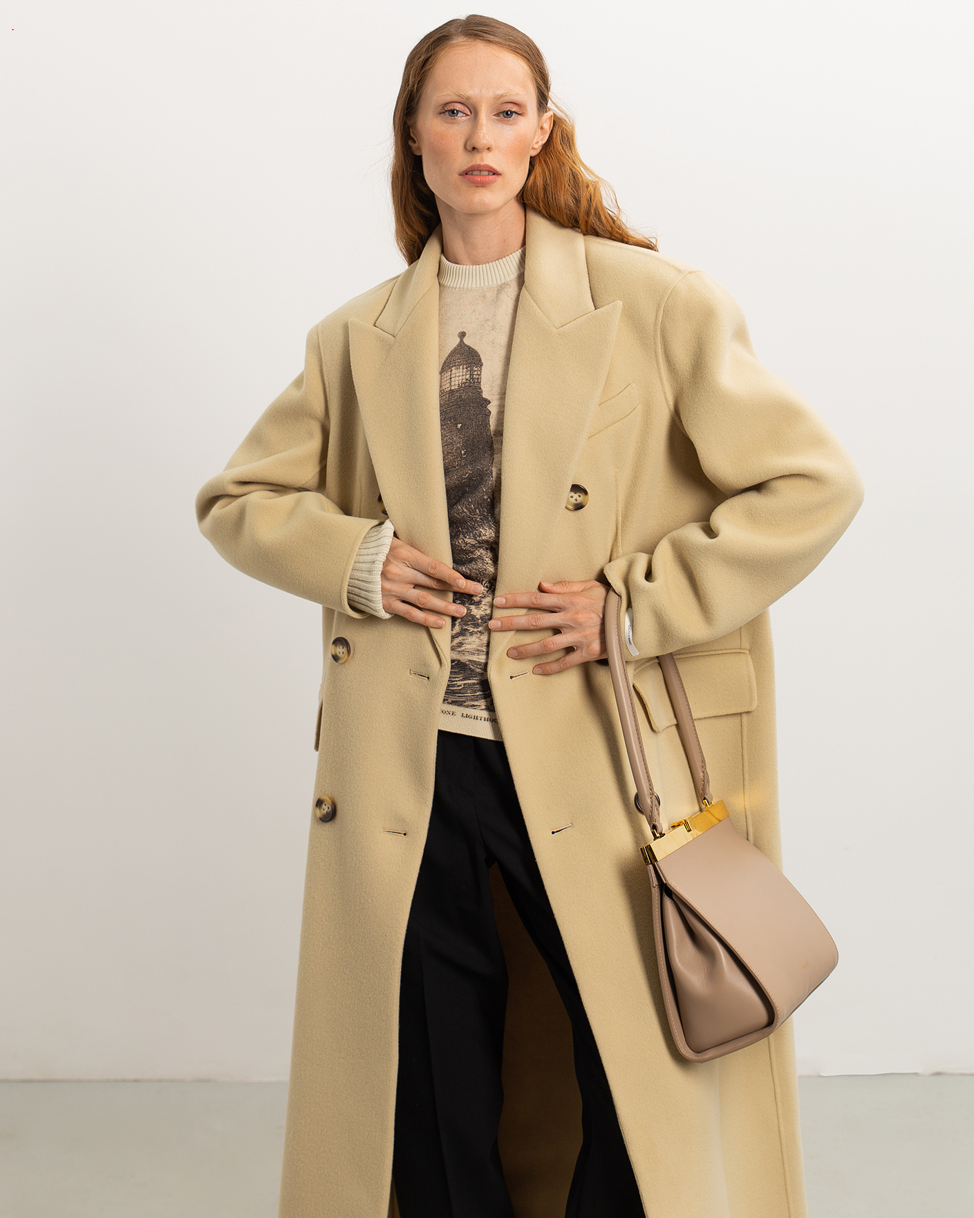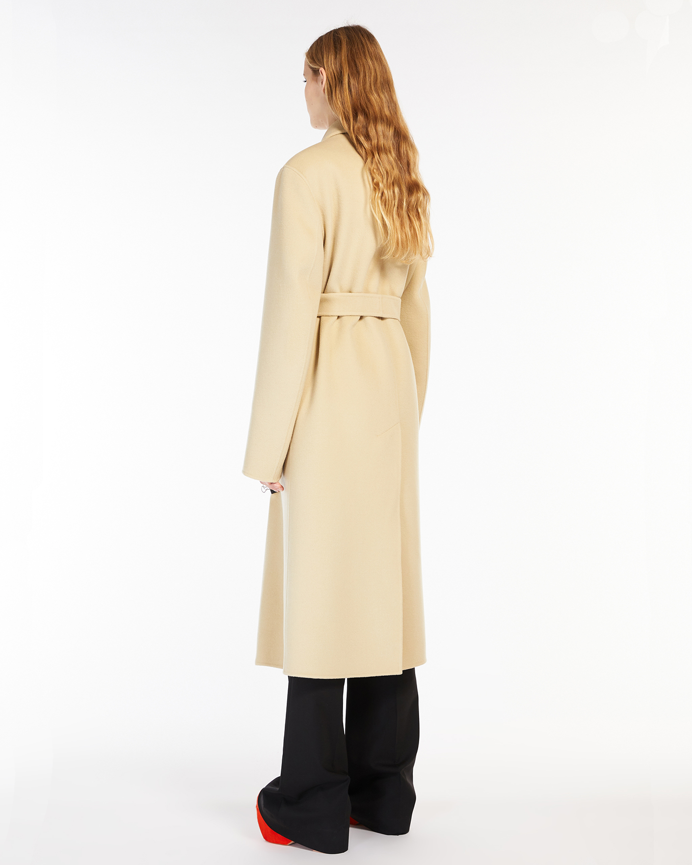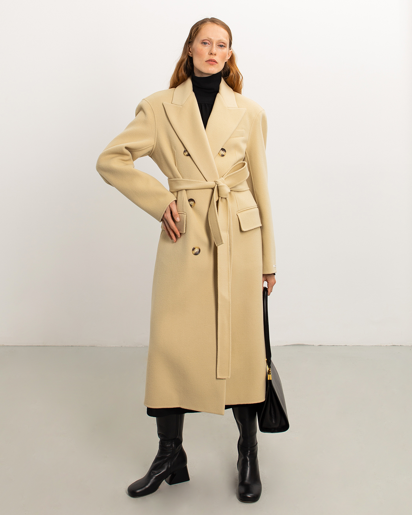 Двубортное пальто Sportmax светло-бежевого цвета выполнено из 100% шерсти. Модель с широкими заостренными лацканами, на крупных контрастных пуговиах, а также со вставным поясом в тон. Имеются врезные карманы с клапанами по бокам. Стильное пальто станет незаменимой вещью вашего верхнего гардероба.