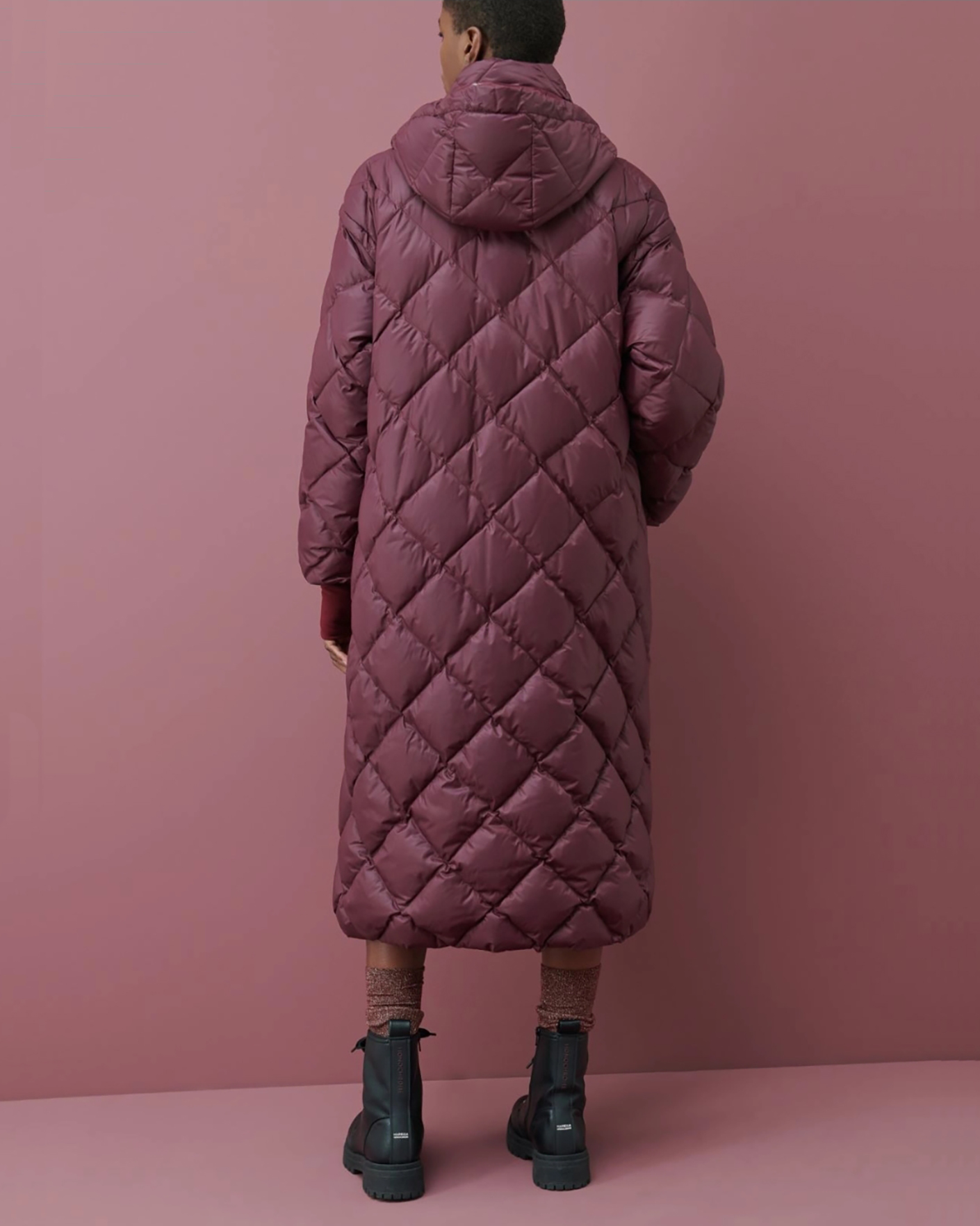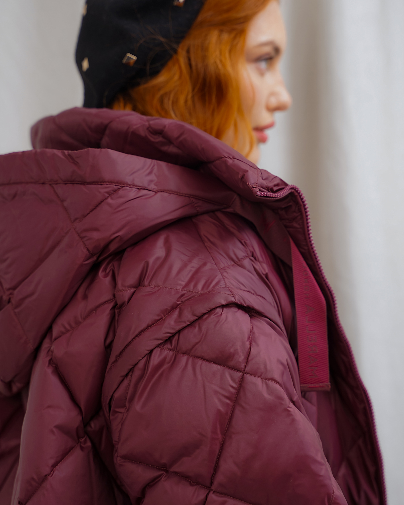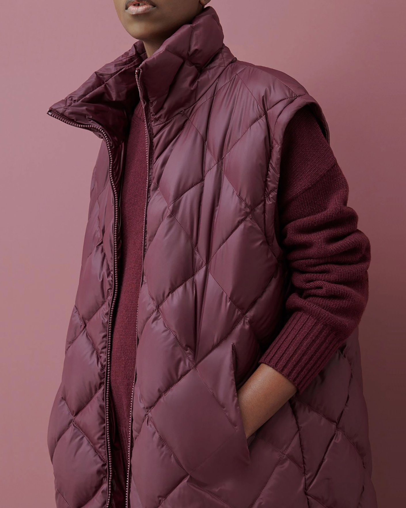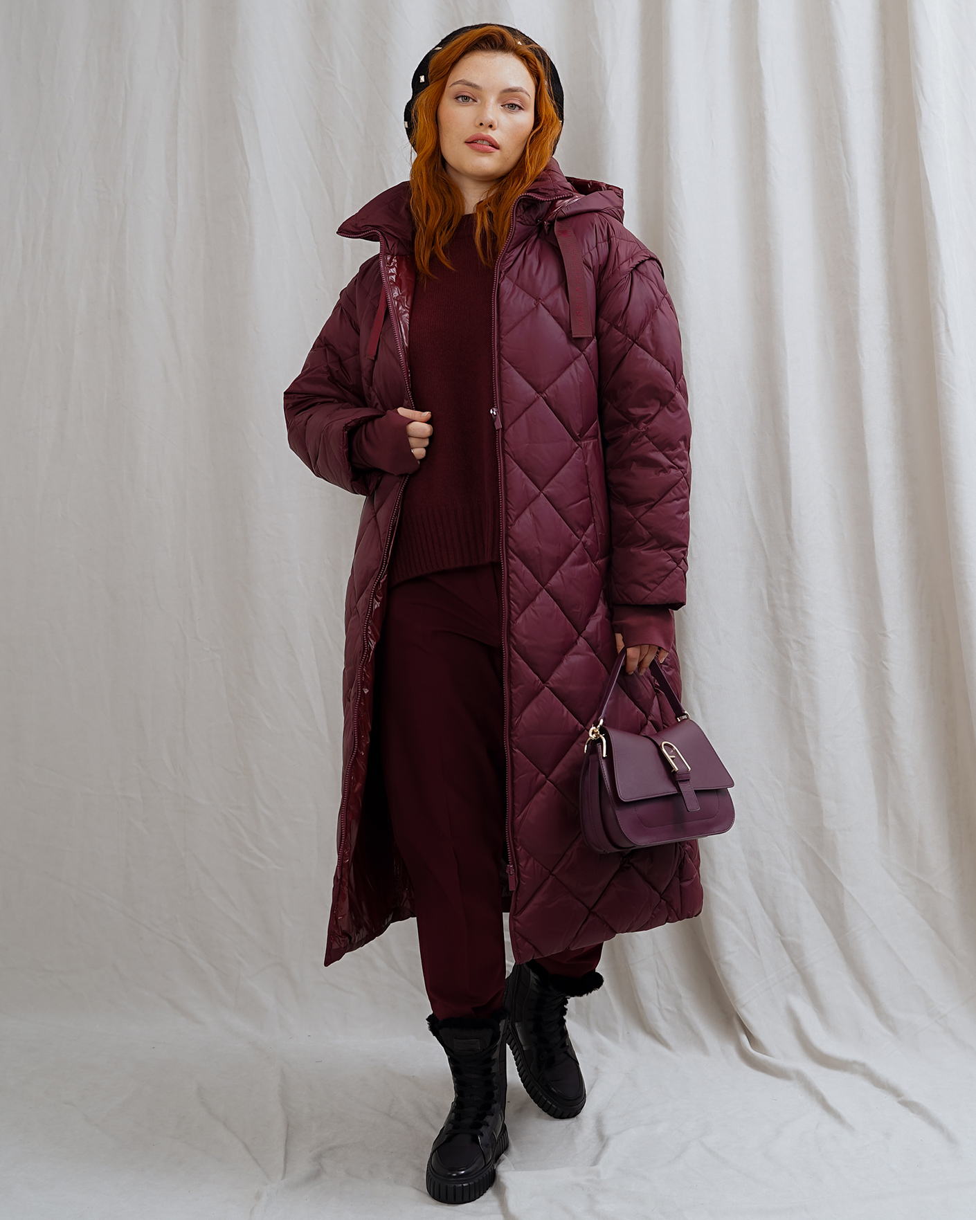 Теплое пальто-жилет Marella вишневого цвета в ромбическую стежку. Модель длины миди, воротник-стойка с регулируемым капюшоном, застежка на молнию. Съемные рукава с манжетами на ребристой резинке. Пальто-жилет станет фаворитом вашего гардероба.