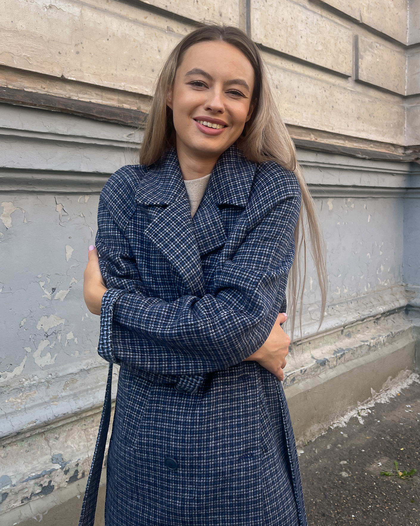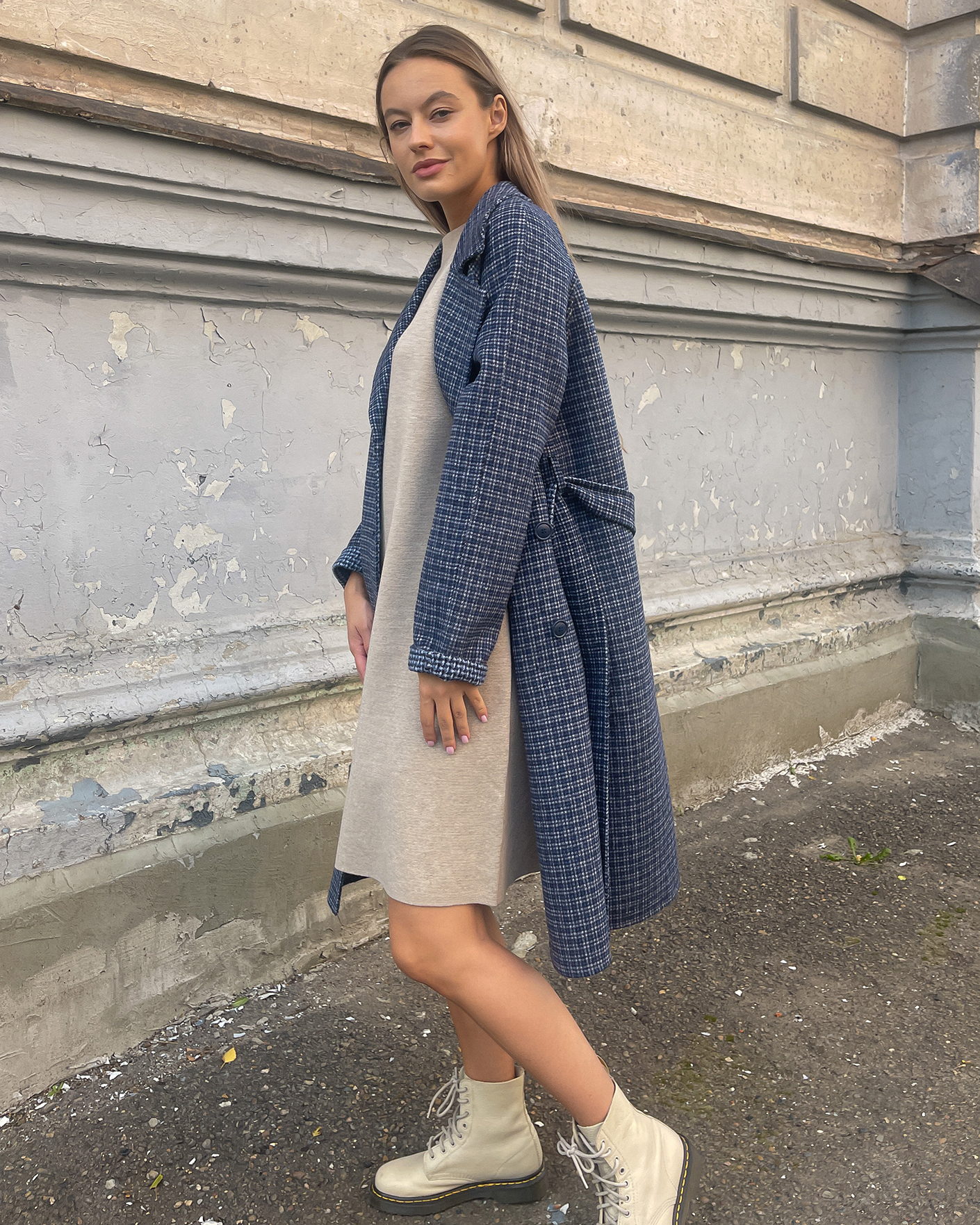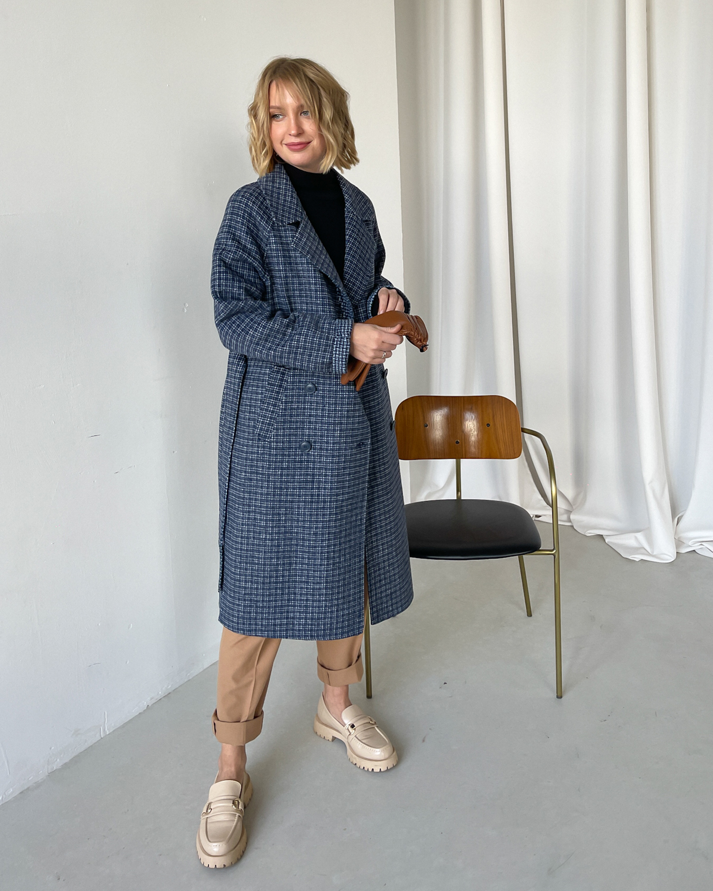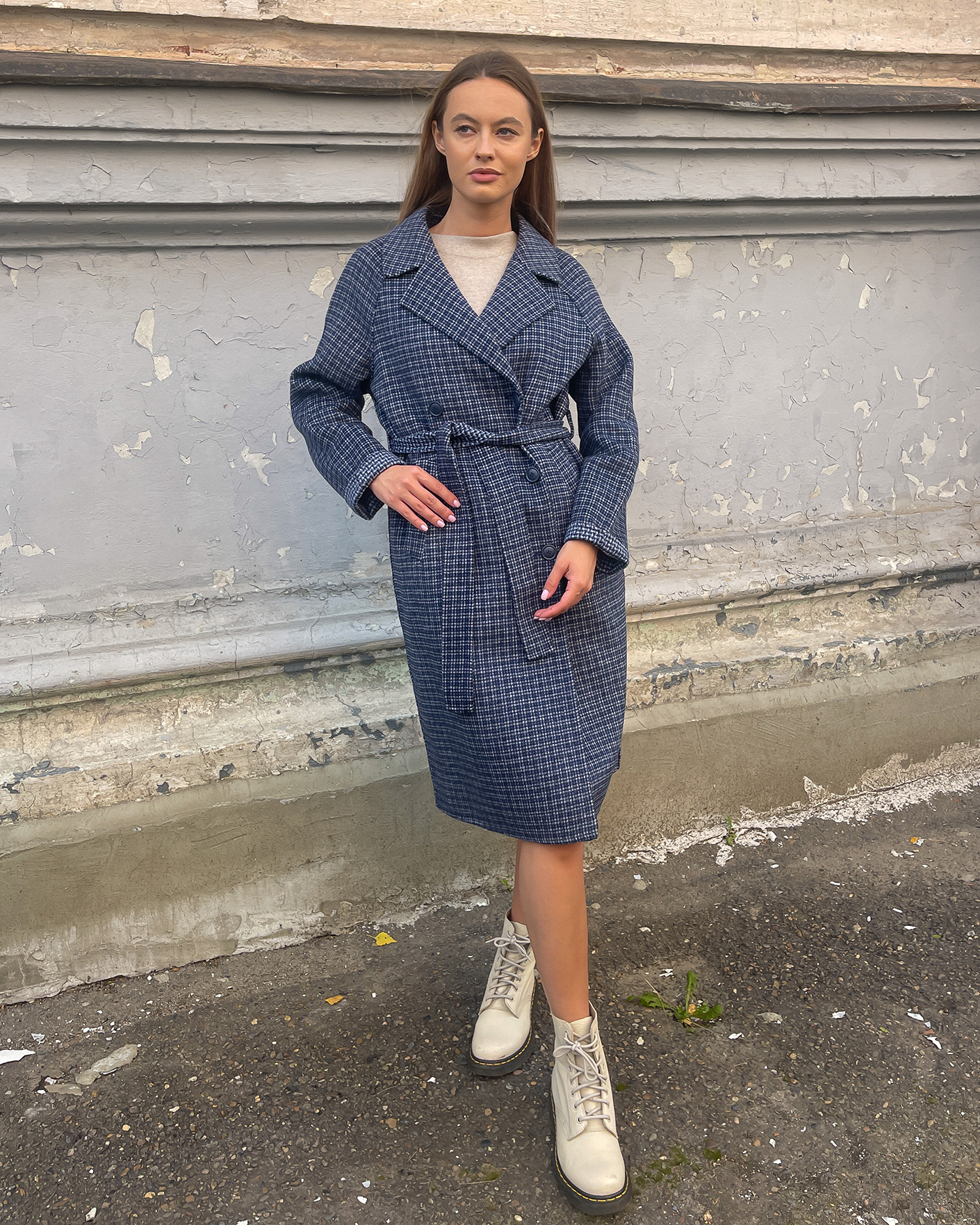 Двубортное пальто-кокон UNQ серо-синего цвета в мелкую клетку. Модель длины по колено, с лацканами, застежкой на пуговицы, имеются врезные карманы по бокам. Линию талии можно подчеркнуть вставным поясом в тон. Пальто - незаменимая вещь вашего гардероба.