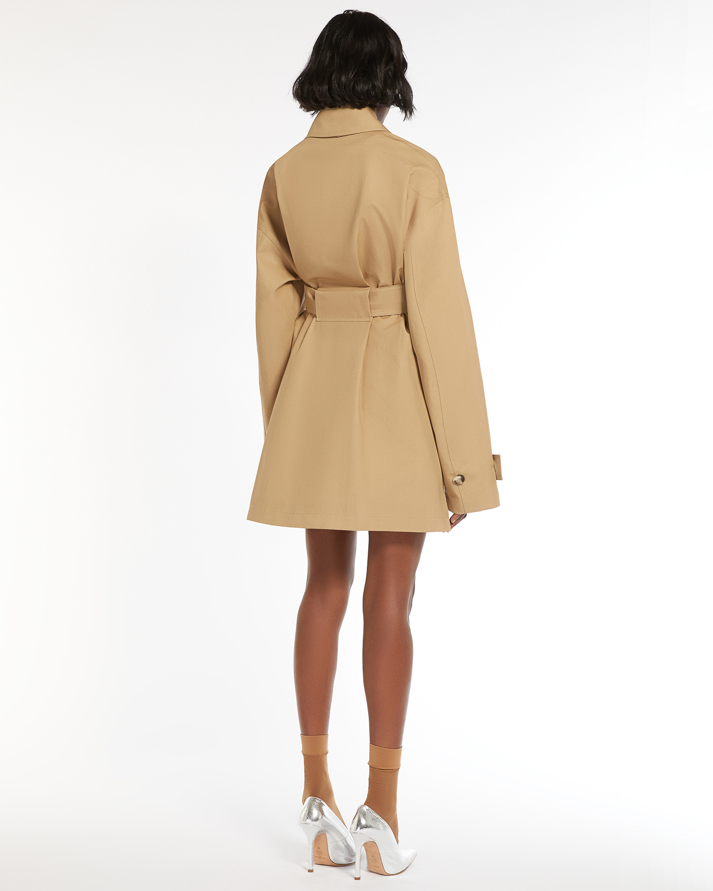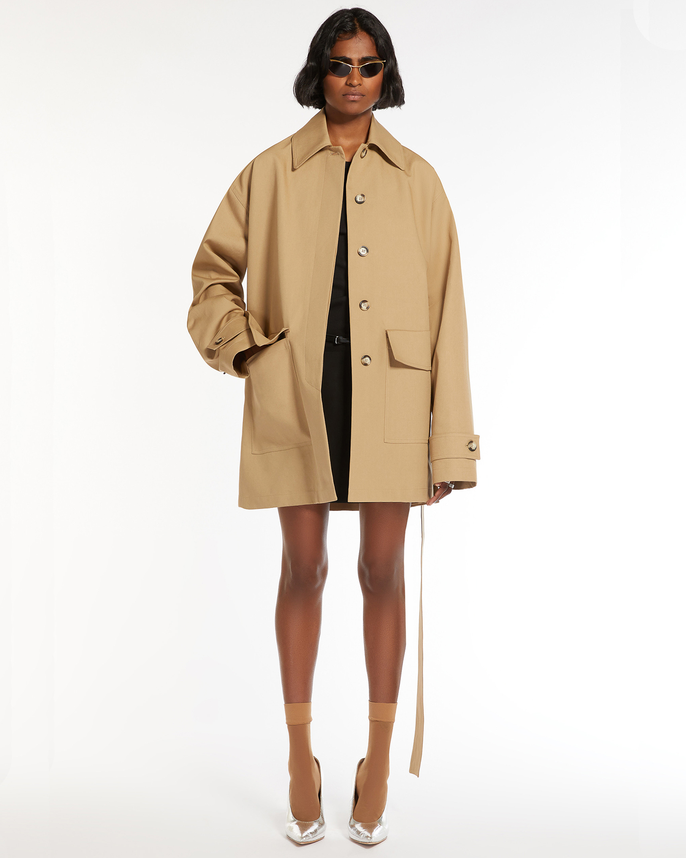 Универсальный плащ Sportmax бежевого цвета. Модель из 100% хлопка, широкий отложной воротник, застежка наскрытые пуговицы, имеются накладные карманы с клапанами по бокам. Линию талии можно подчеркнуть съемным поясом в тон. Идеальный плащ станет фаовритом вашего верхнего гардероба.