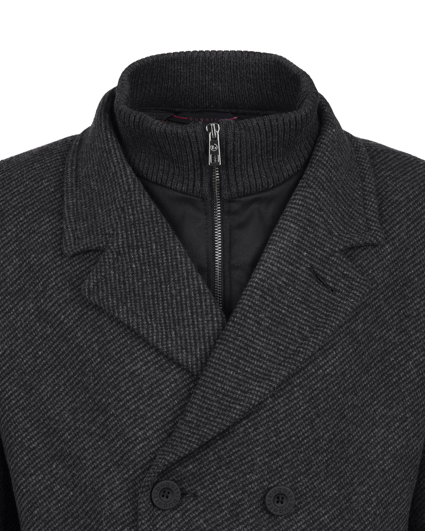 Двубортное пальто-бушлат Bugatti черного цвета в строчный диагональный рисунок. Модель с отложным воротом, застежкой на пуговицы, а также с внутренним утеплением на молнии и с воротникомм-стойка. Стильное пальто станет фаворитом вашего повседневного гардероба.