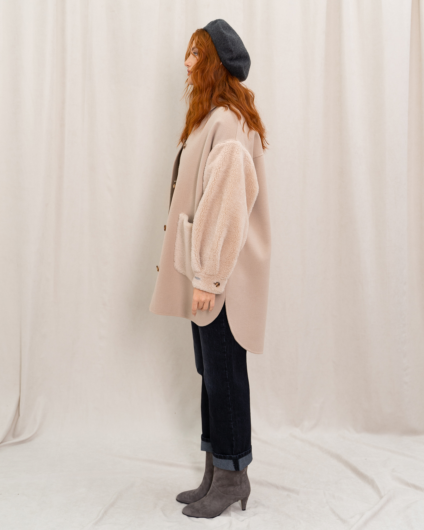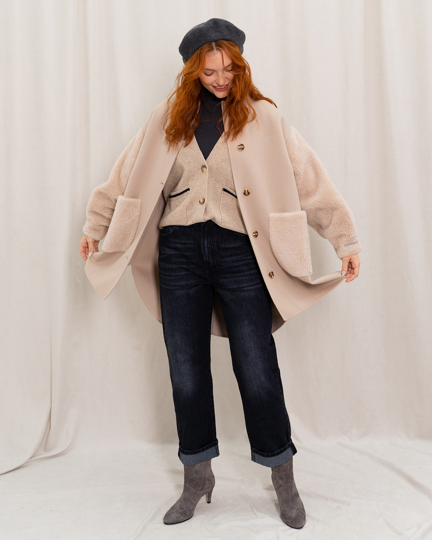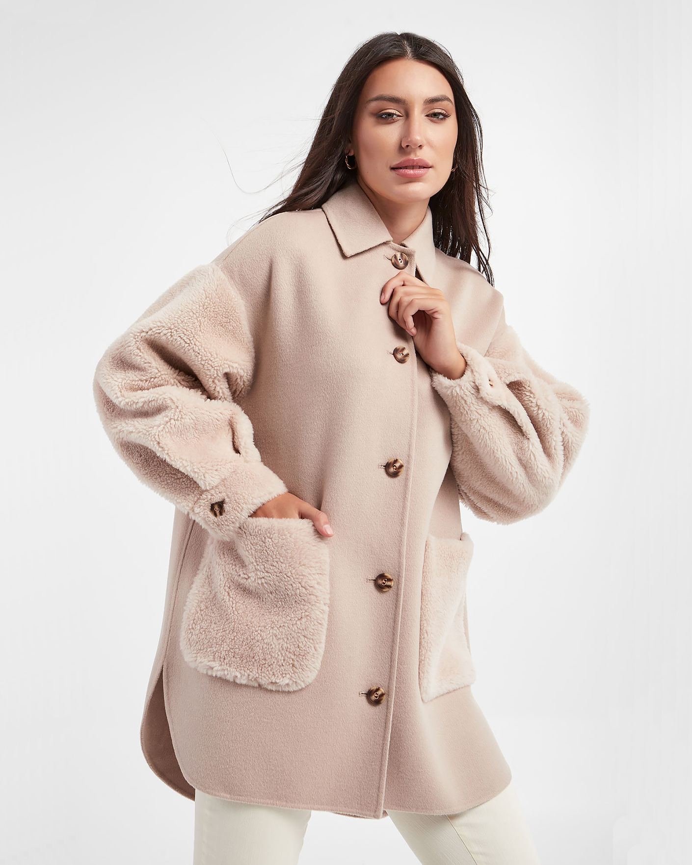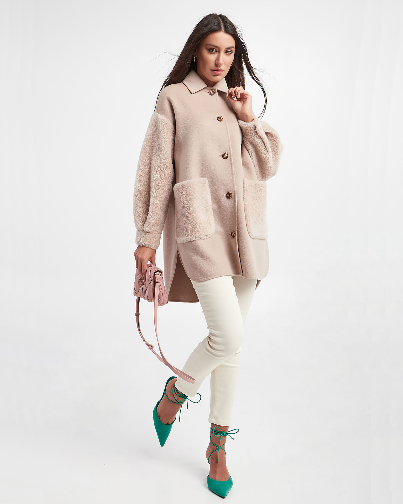 Полупальто Marella бежевого цвета. Модель с имитацией меха на рукавах и накладных карманах по бокам. Отложнйо воротник, застежка на крупные пуговицы. Имеются закругленные боковые разрезы. Пальто станет незаменимой вещью на каждый день.