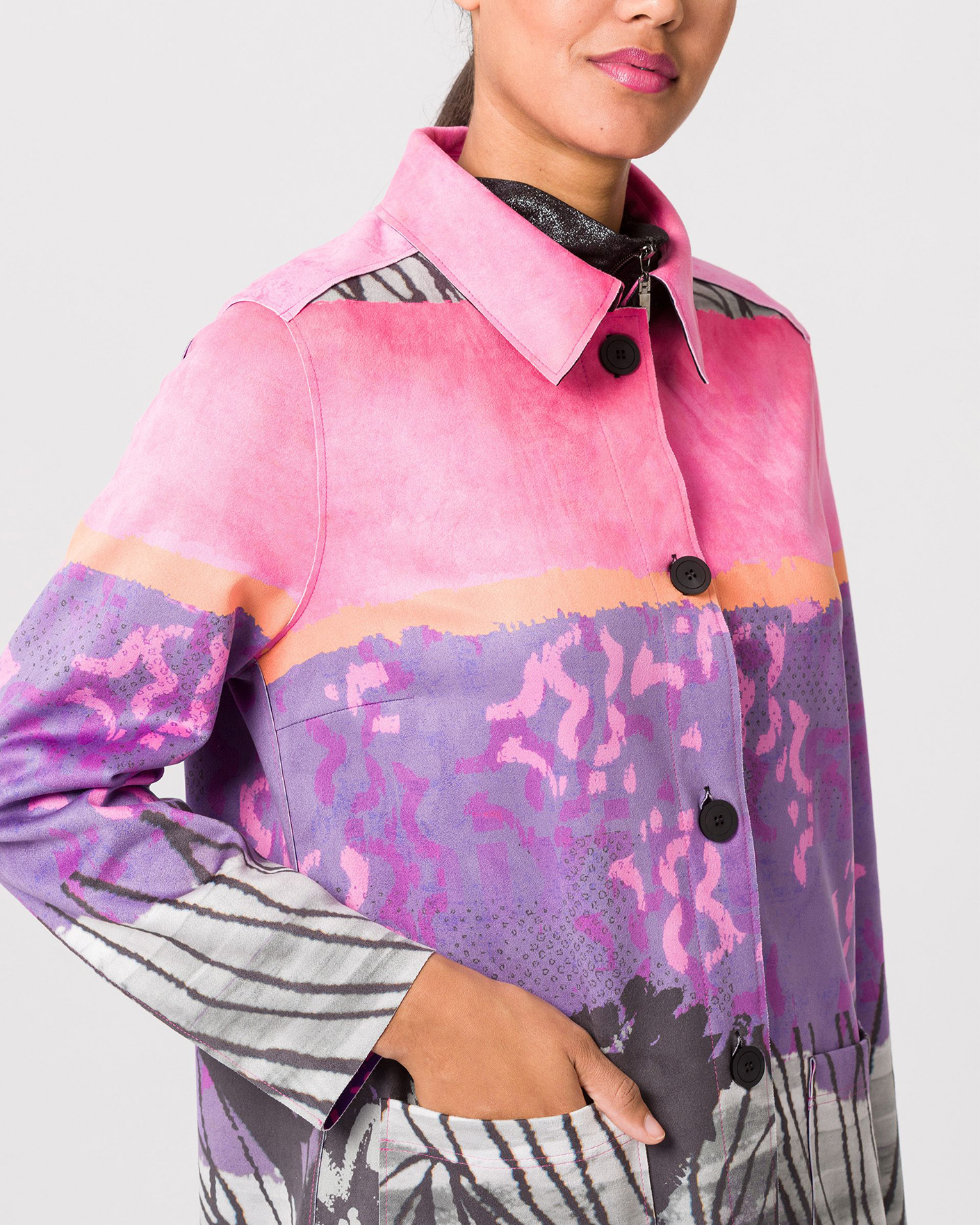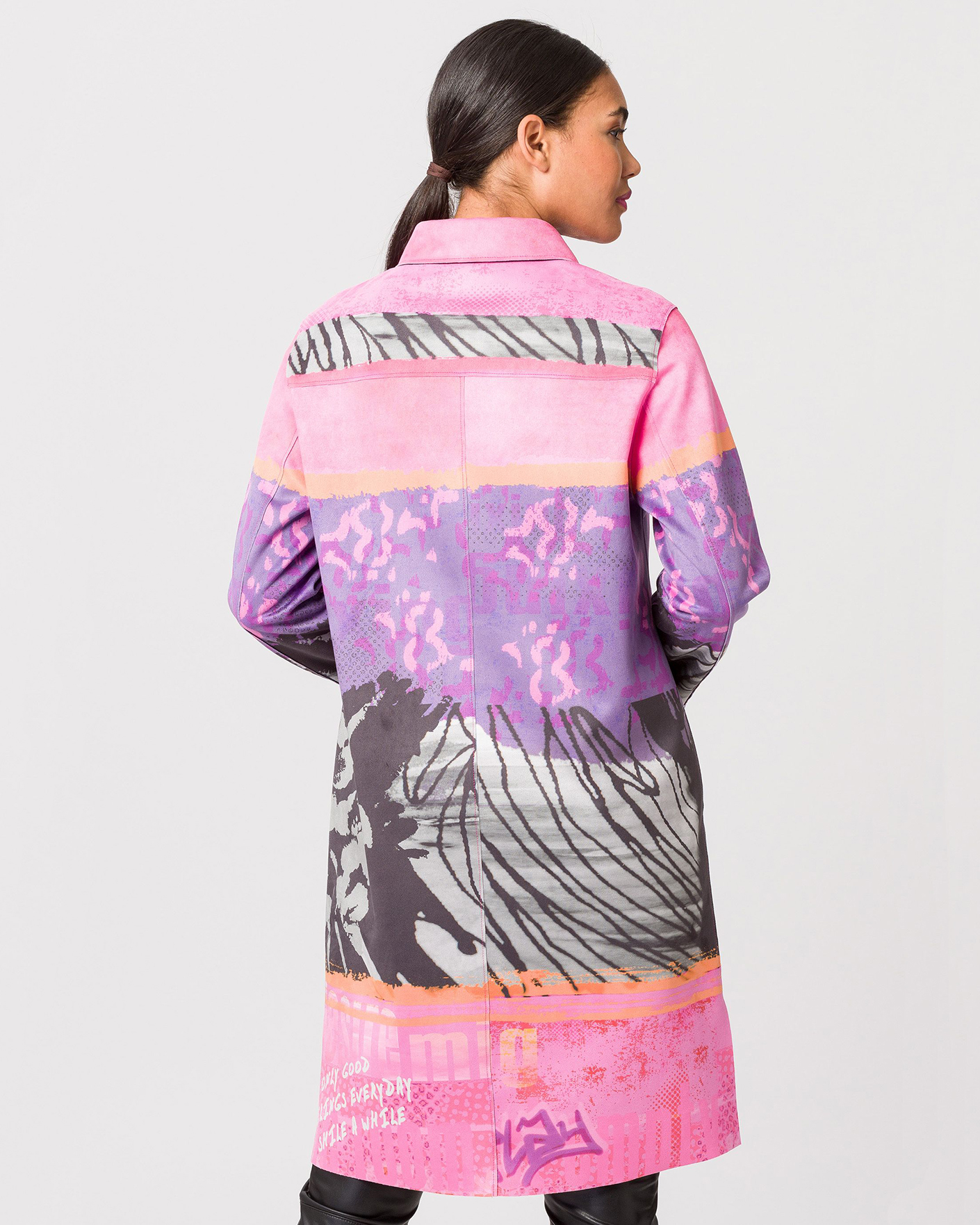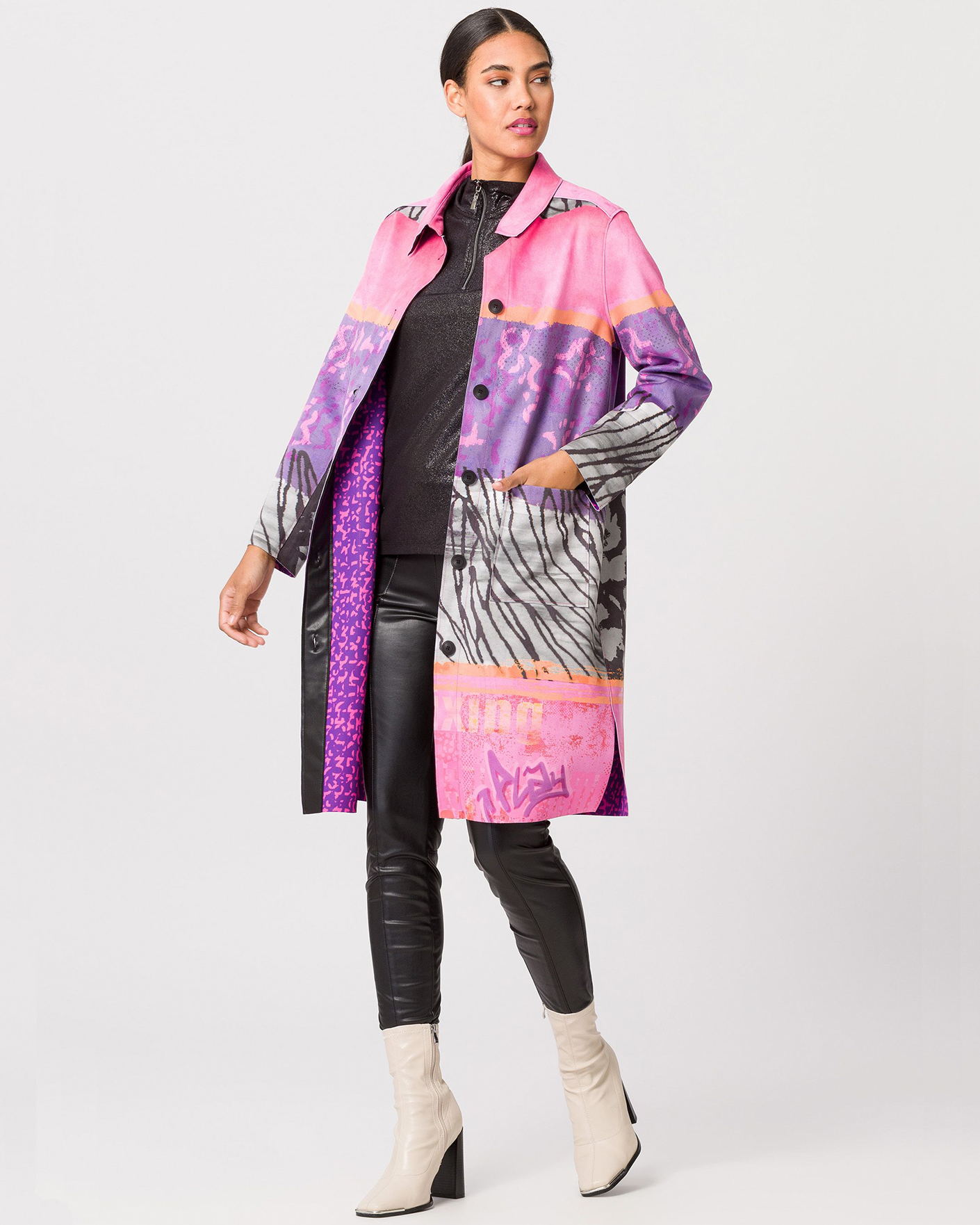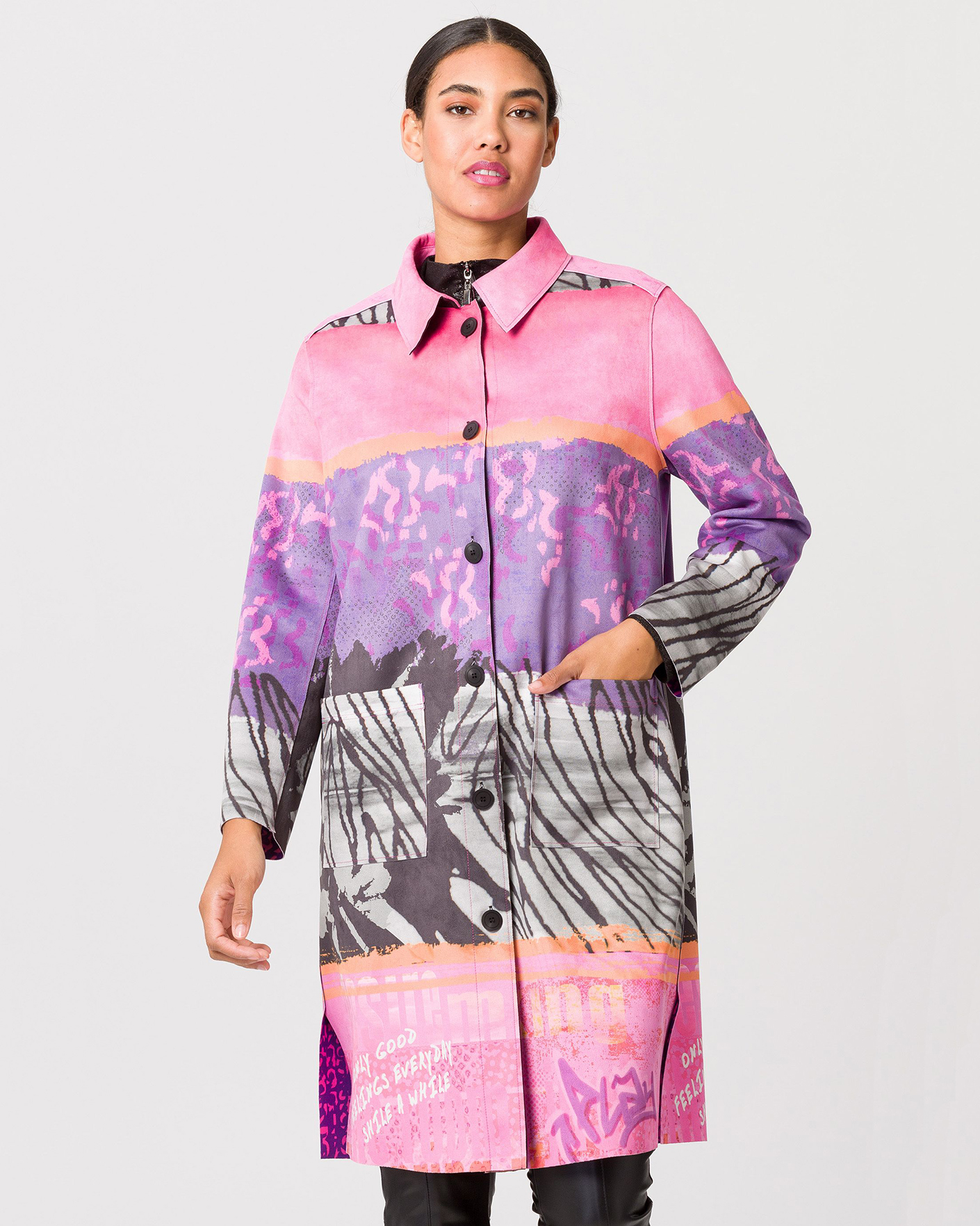 Пальто-пыльник Tuzzi фиолетово-розового цвета в абстрактный рисунок. Модель с отложным воротником, застежкана крупные пуговицы по всей длине. Имеются накладные карманы по бокам. Стильное пальто-пыльник станет ярким завершением образа.