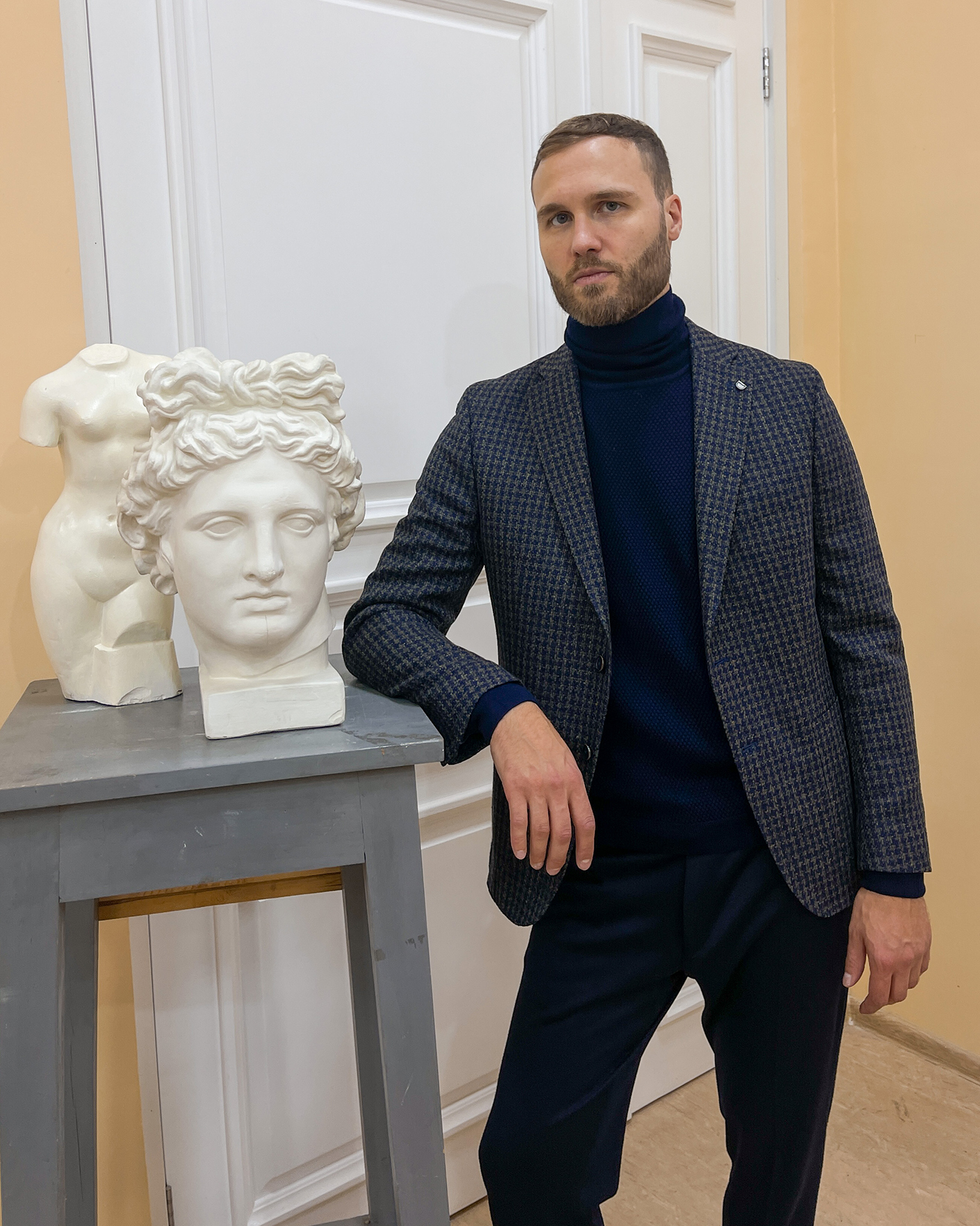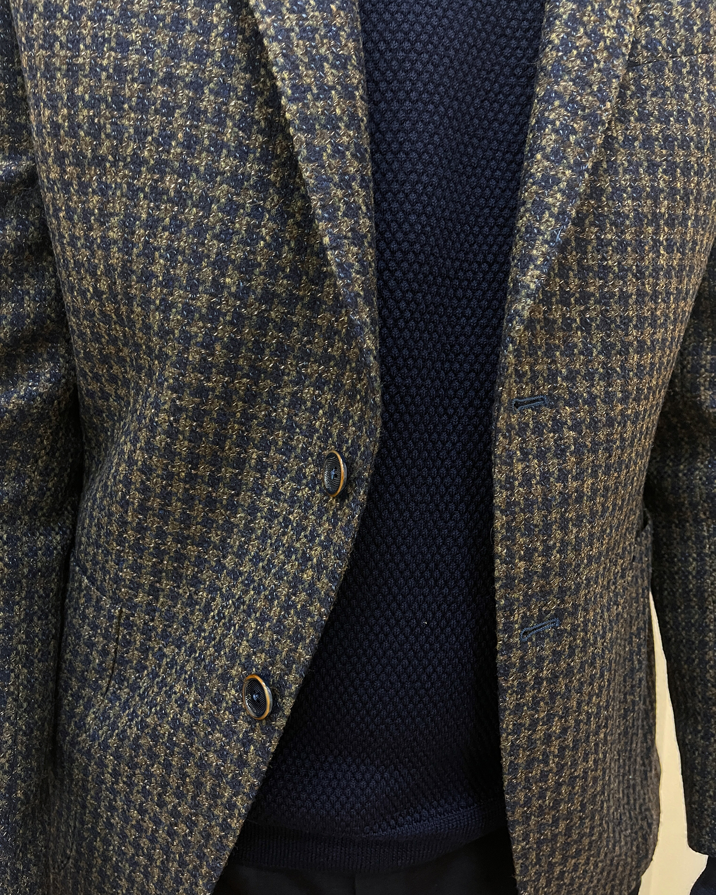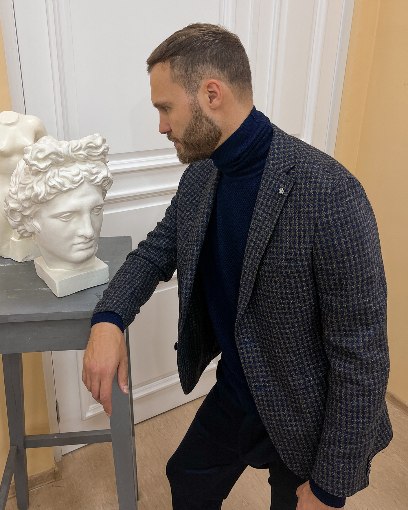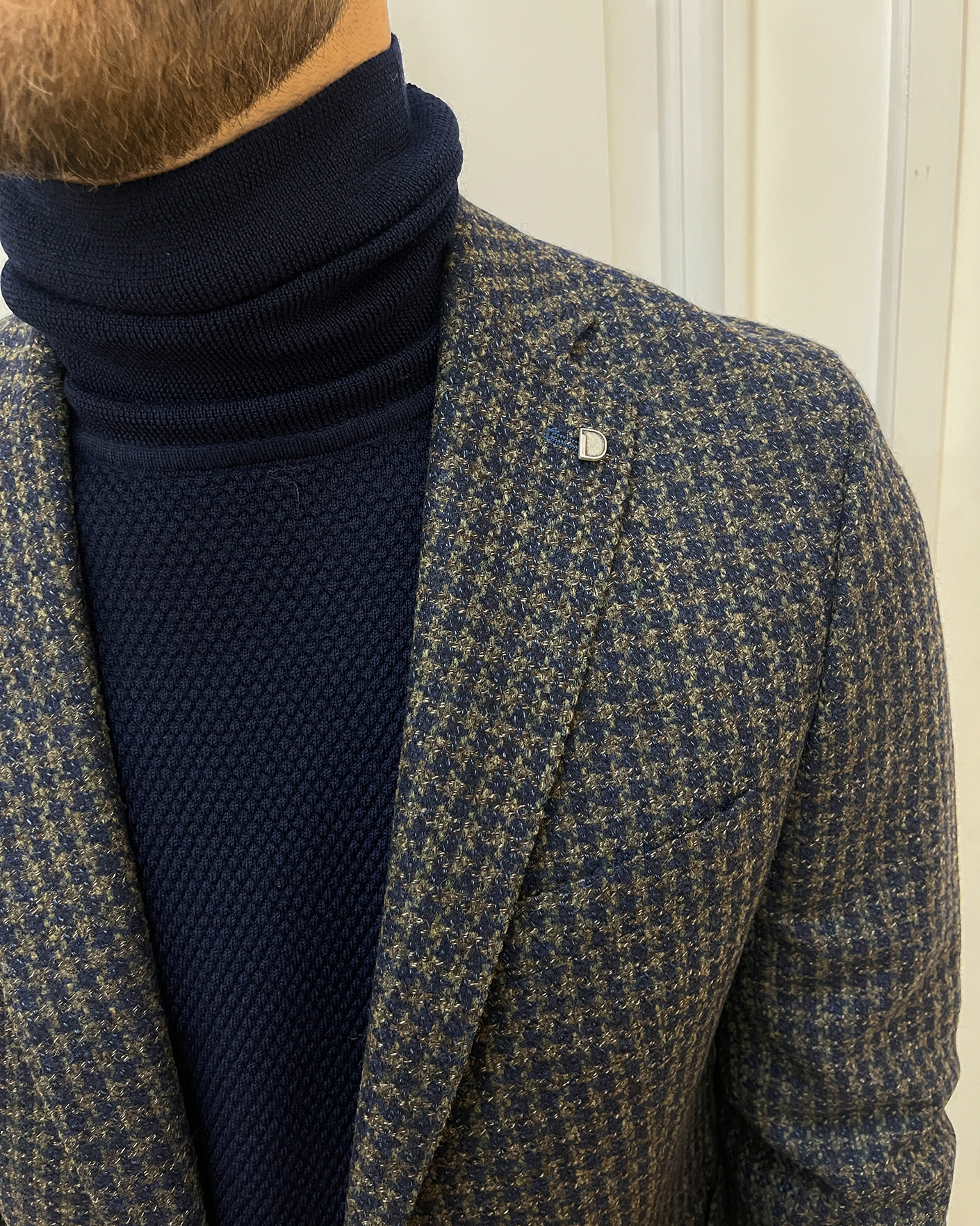 Пиджак Digel зелено-синего цвета в рисунок гусиные лапки. Шерстяная модель с лацканами, застежкой на пуговицы и накладными карманами по бокам. Пиджак можно сочетать с рубашкой, тонкой водолазкой, джемпером и брюками.