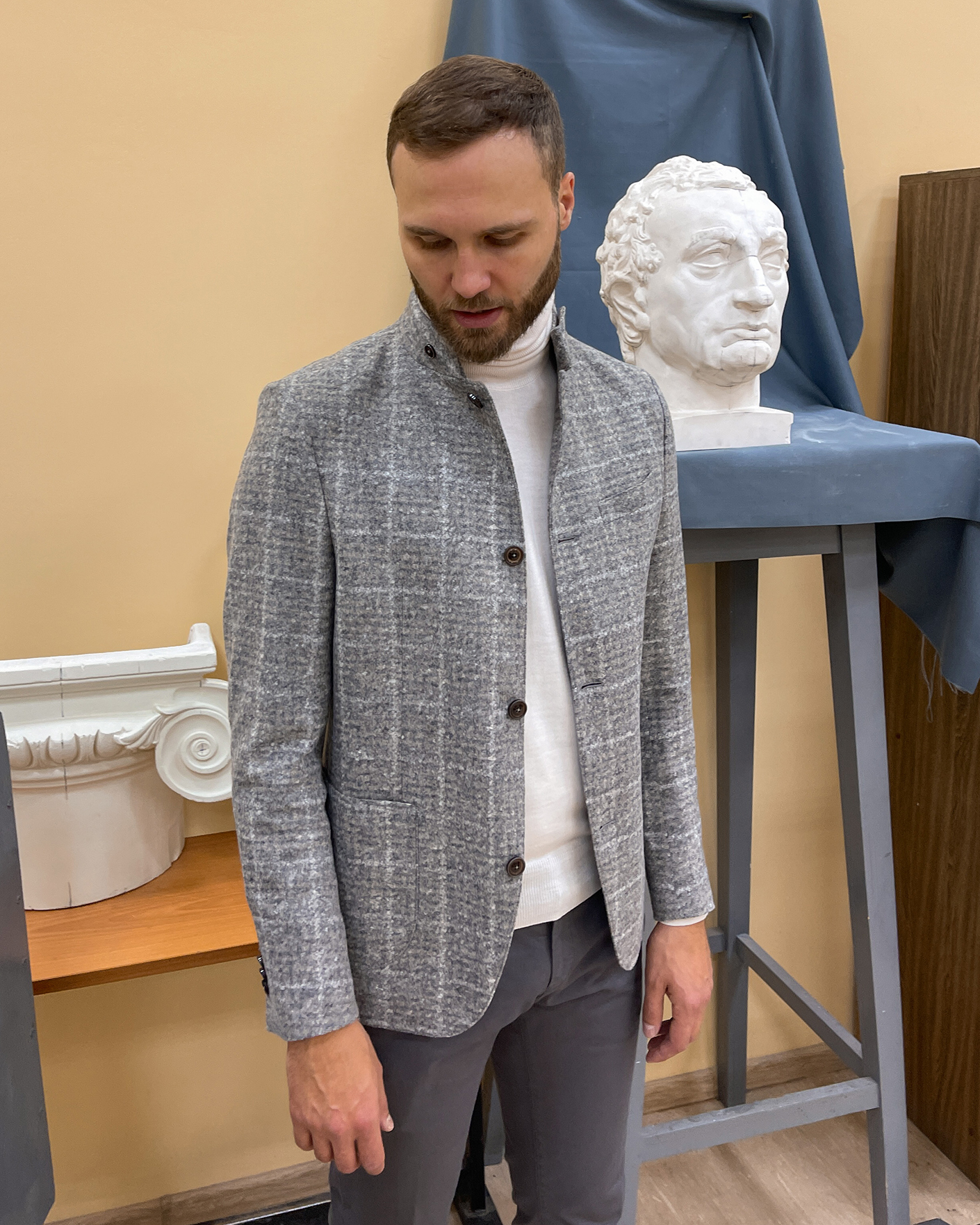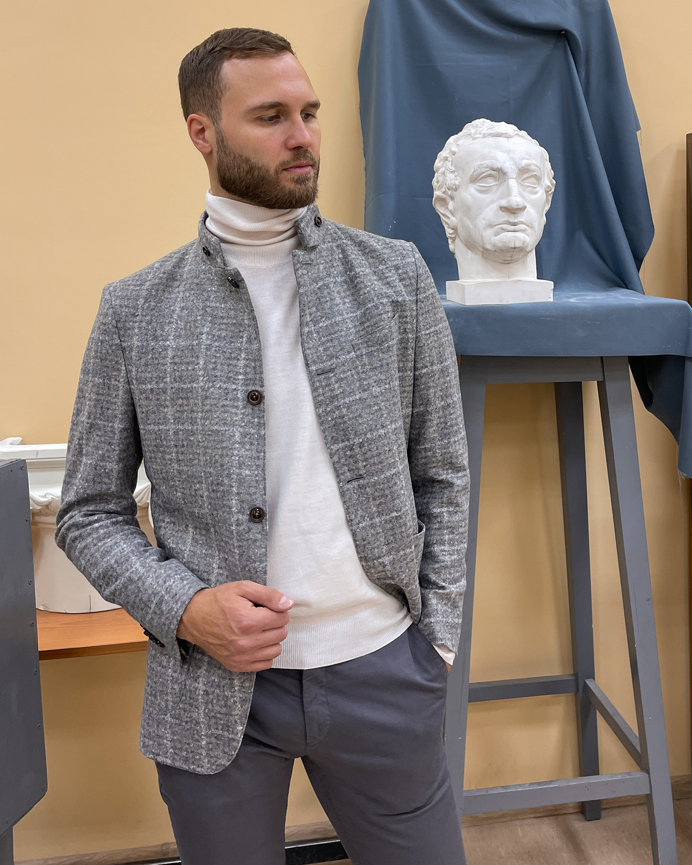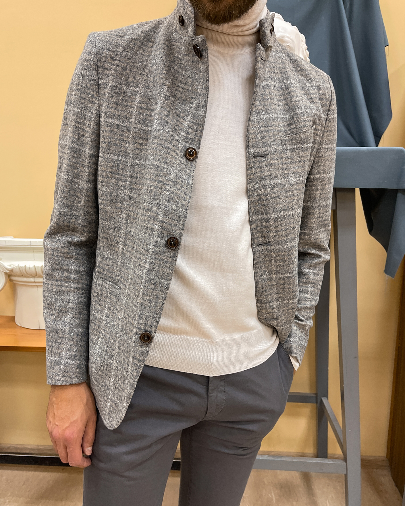 Утепленный пиджак Digel бежево-серого цвета в крупную клетку. Стильная модель с воротником-стойка со шлейкой на пуговицу, застежка ан контрастные пуговицы, имеются накладные карманы по бокам и один врезной на груди. Пиджак отлично сочетается с любым повседневным гардеробом.