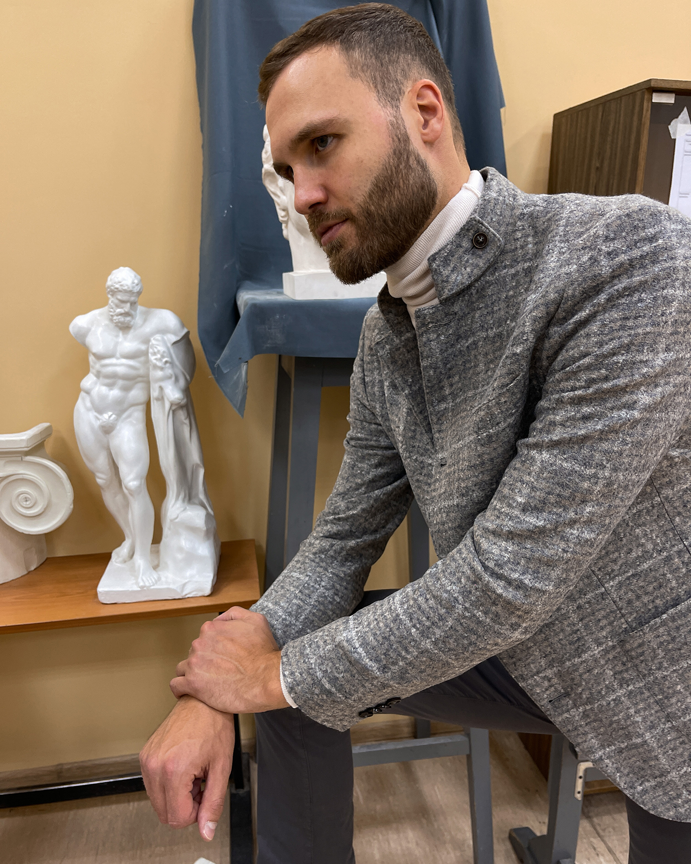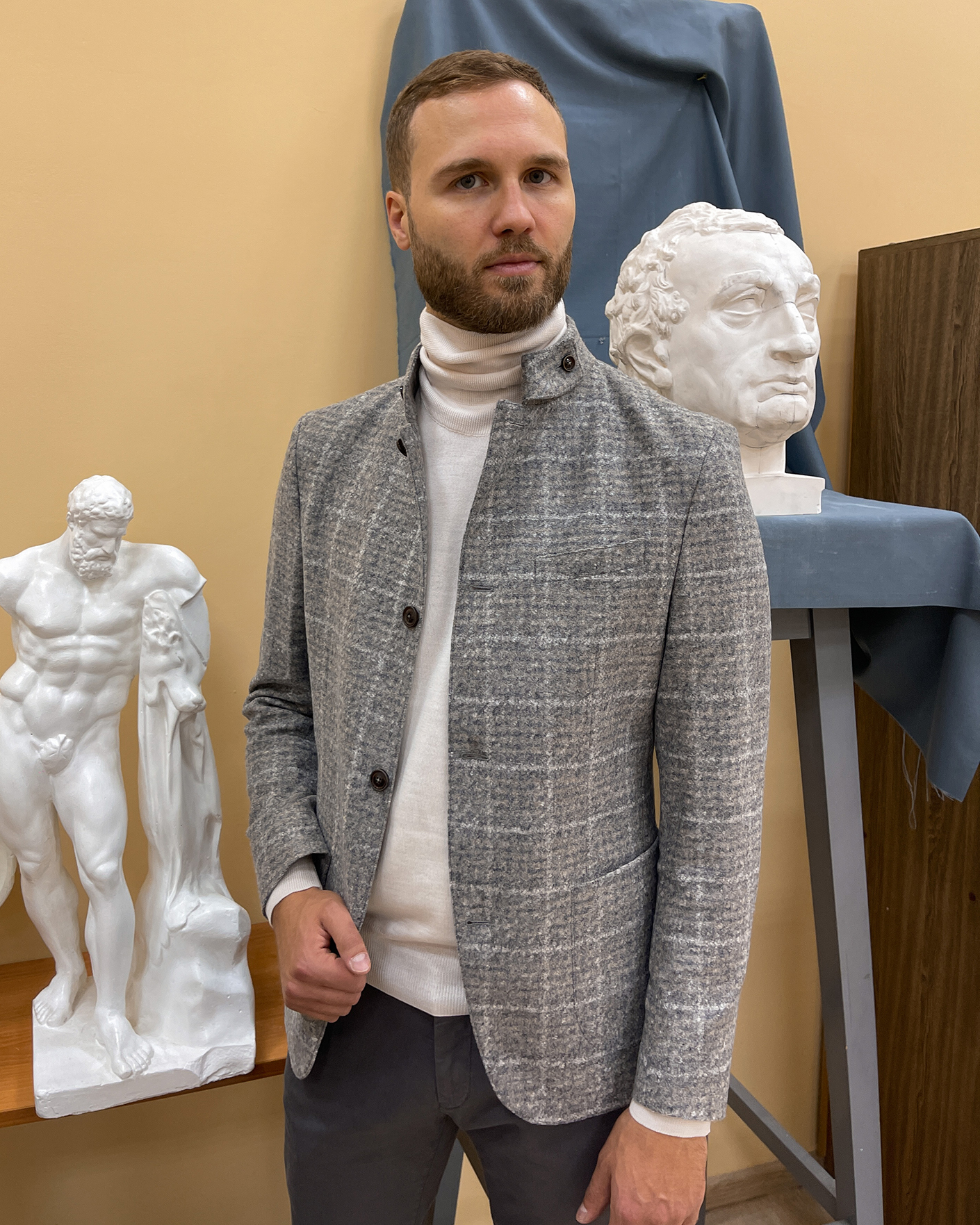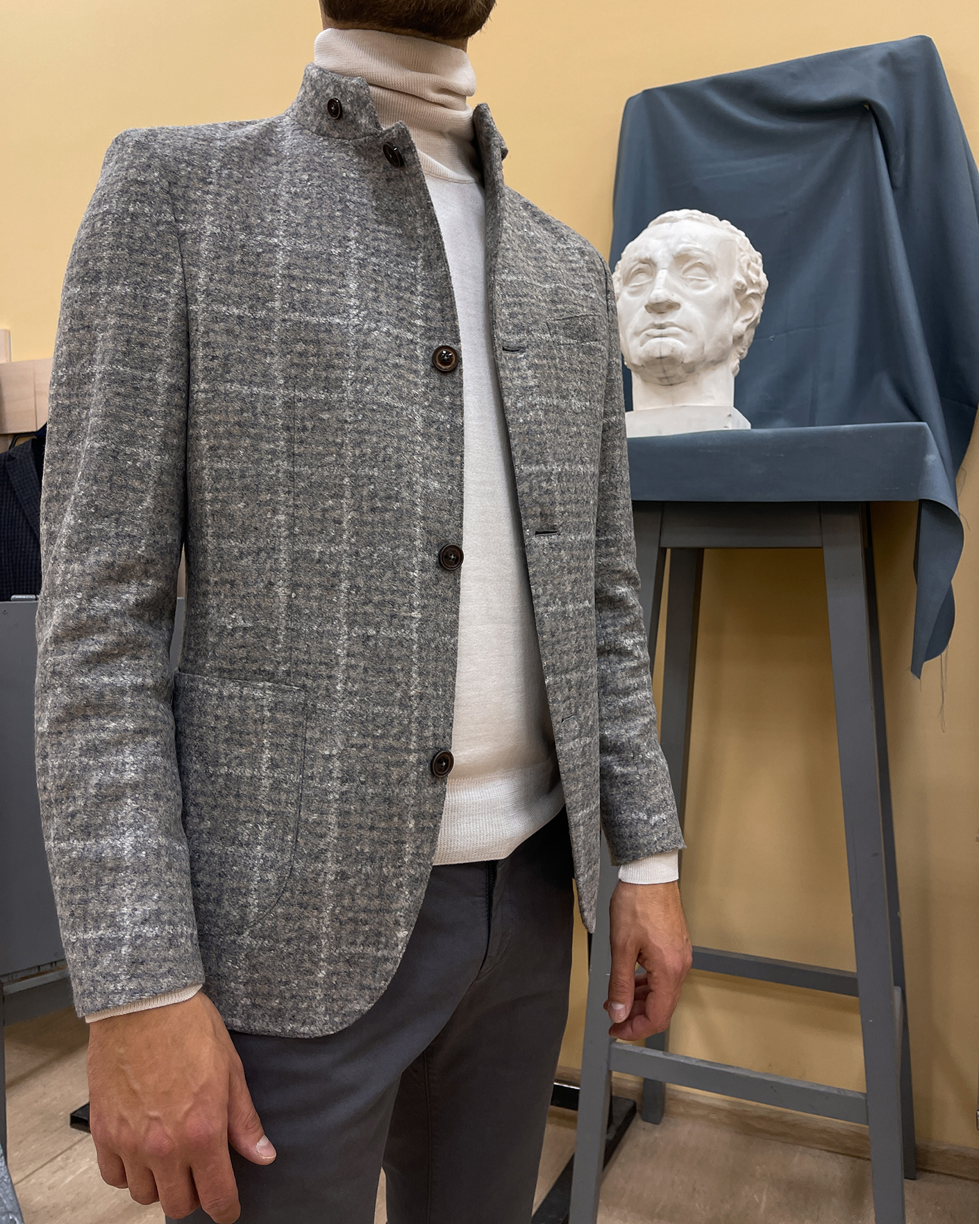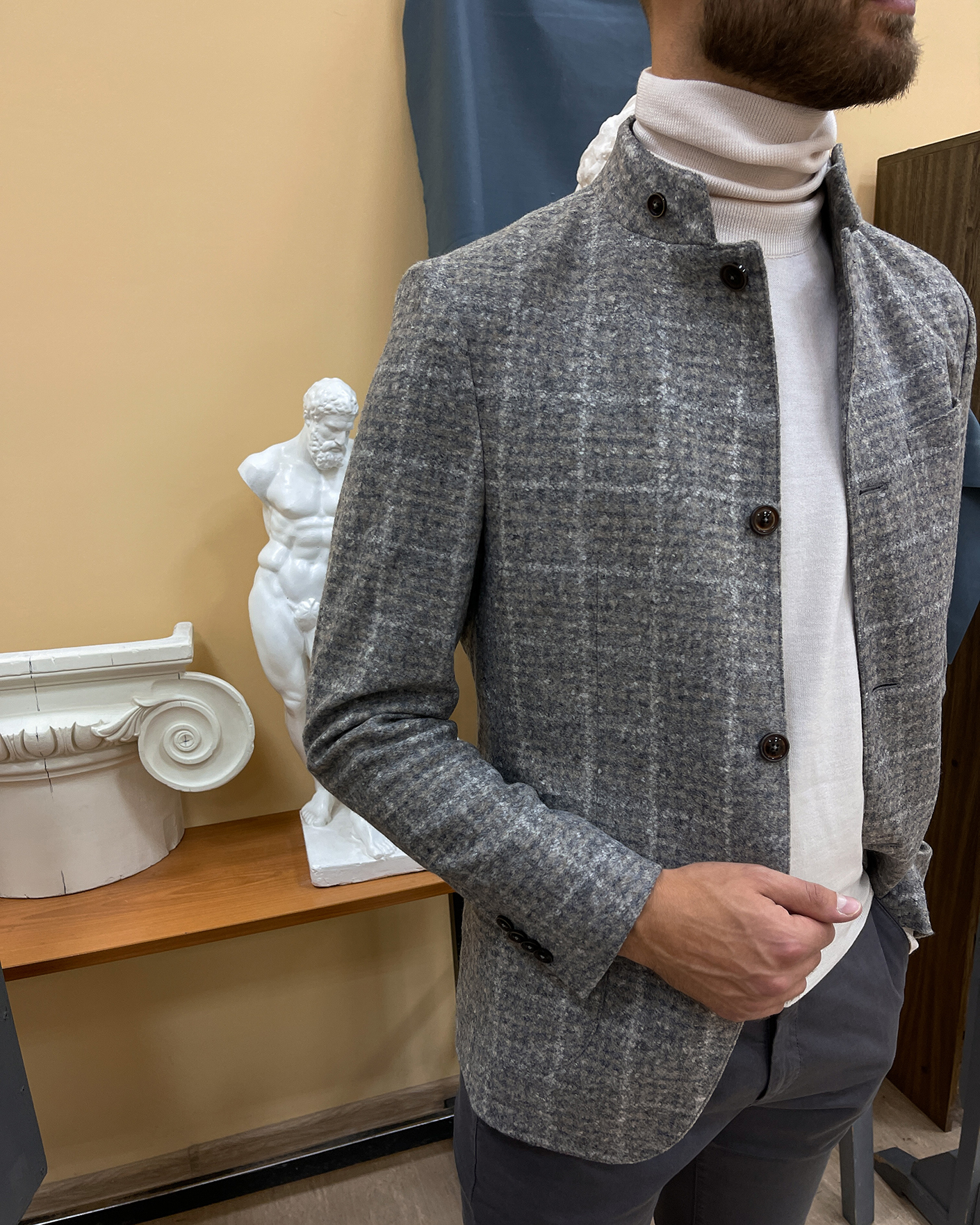 Утепленный пиджак Digel бежево-серого цвета в крупную клетку. Стильная модель с воротником-стойка со шлейкой на пуговицу, застежка ан контрастные пуговицы, имеются накладные карманы по бокам и один врезной на груди. Пиджак отлично сочетается с любым повседневным гардеробом.