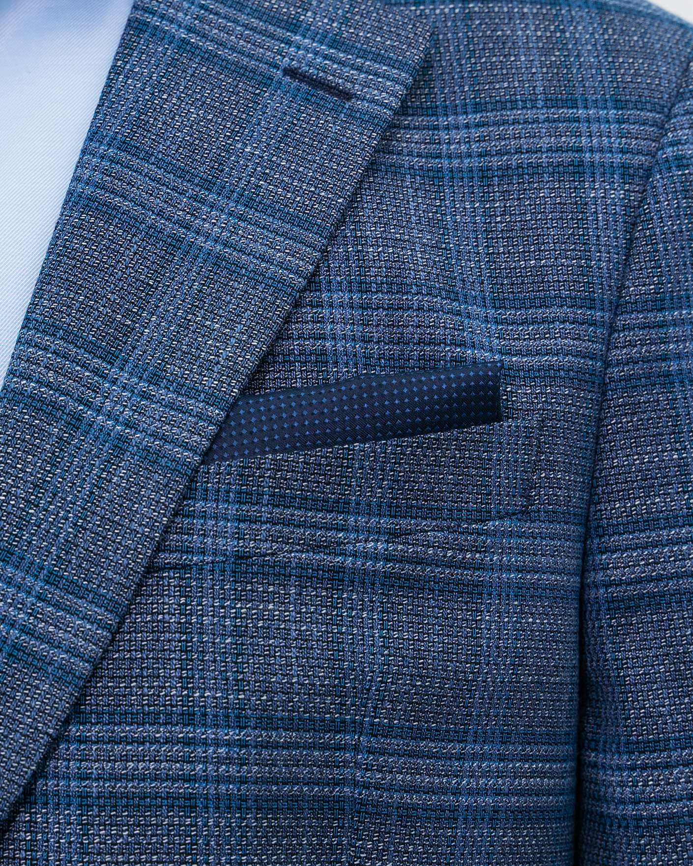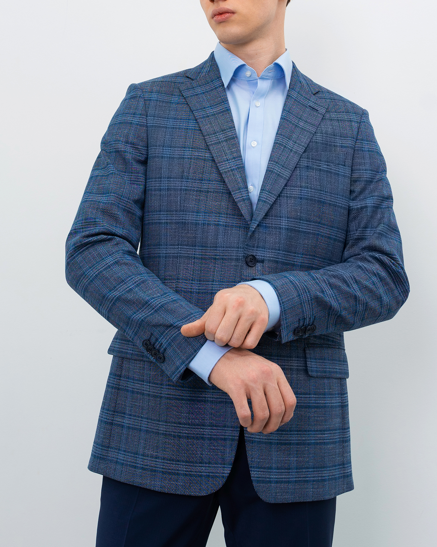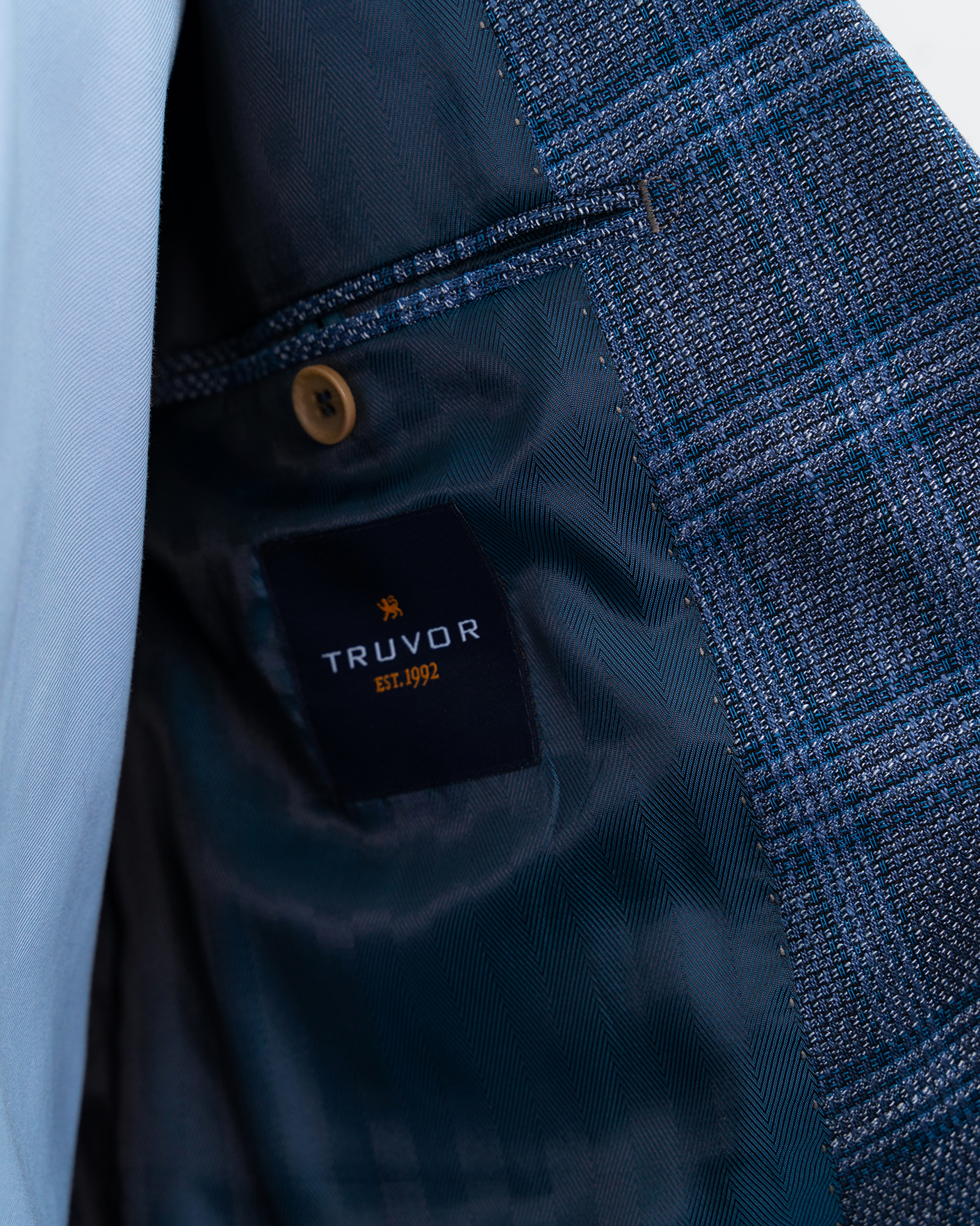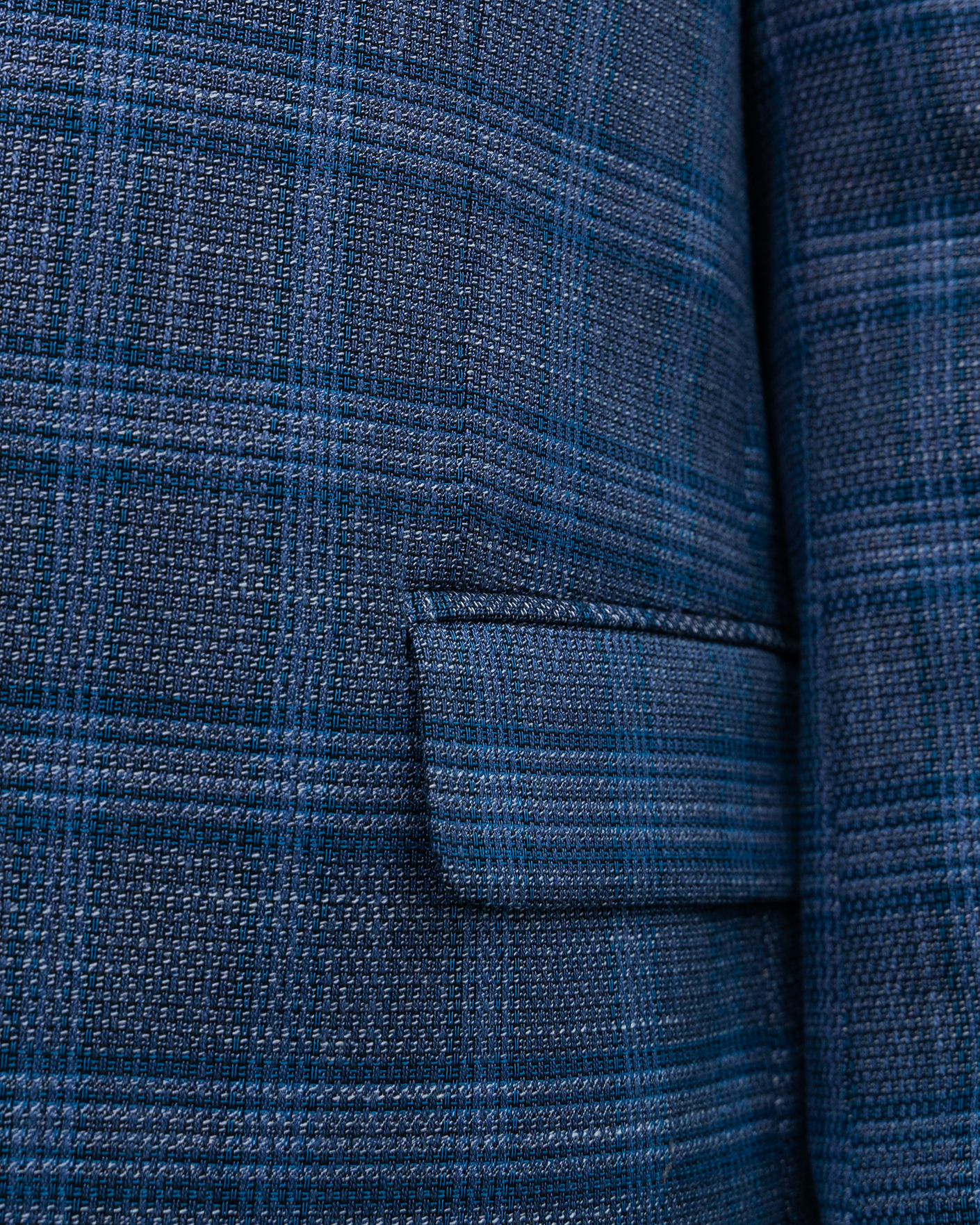 Пиджак Truvor серо-голубого цвета в строчный рисунок и клетку. Модель с лацканами, застежка на пуговицы в тон, имеются врезные карманы склапанами по бокам. Пиджак - отлчиный спутник на любом мероприятии.