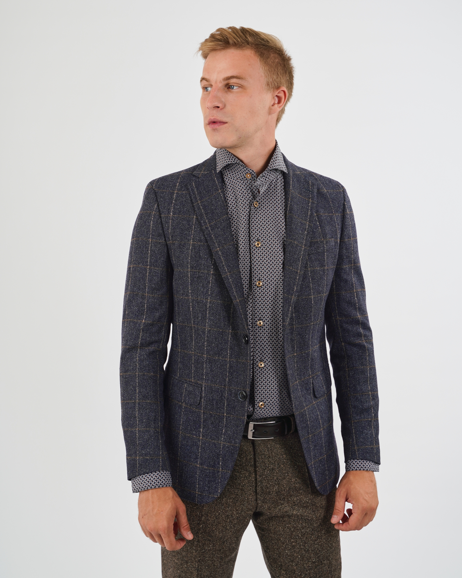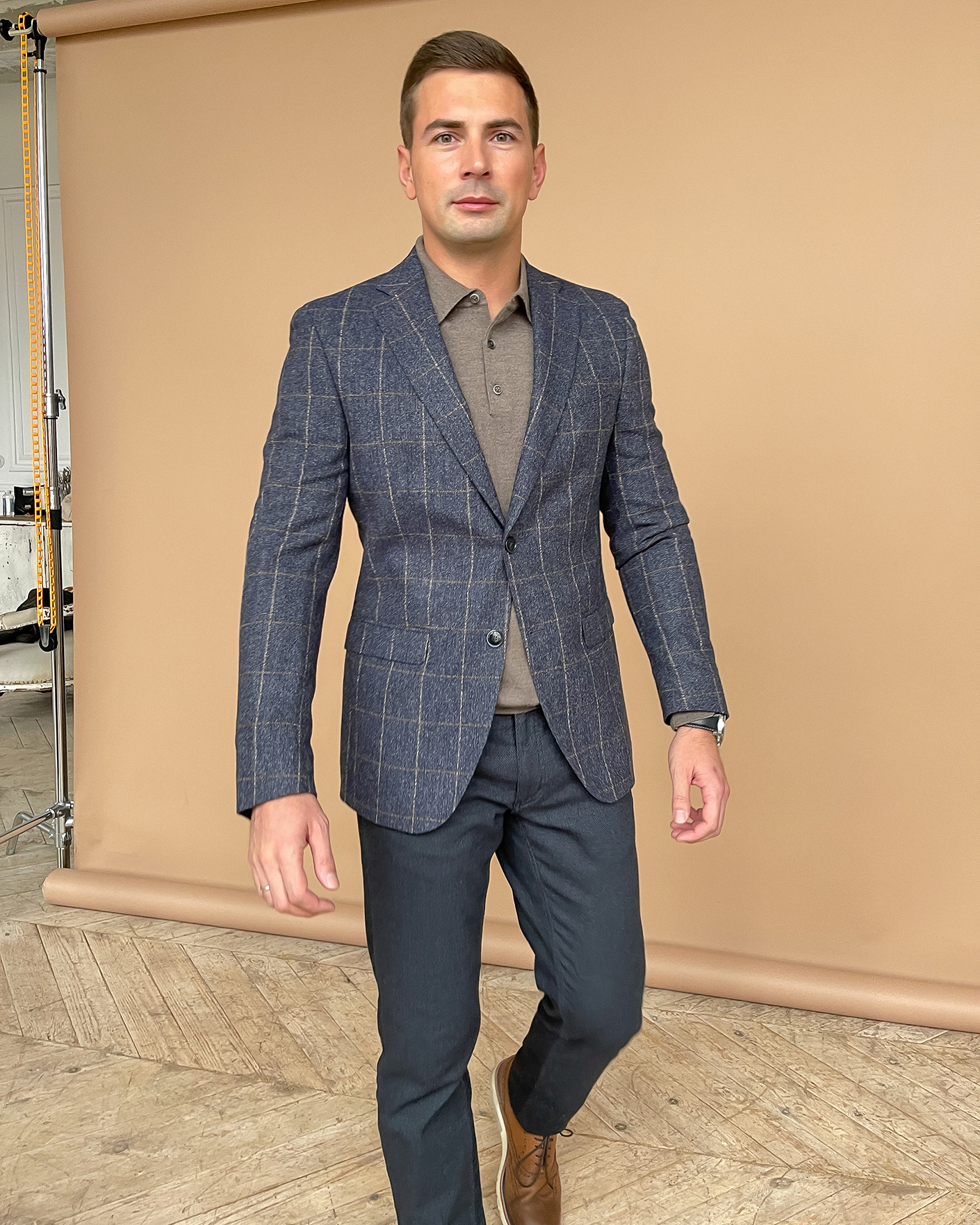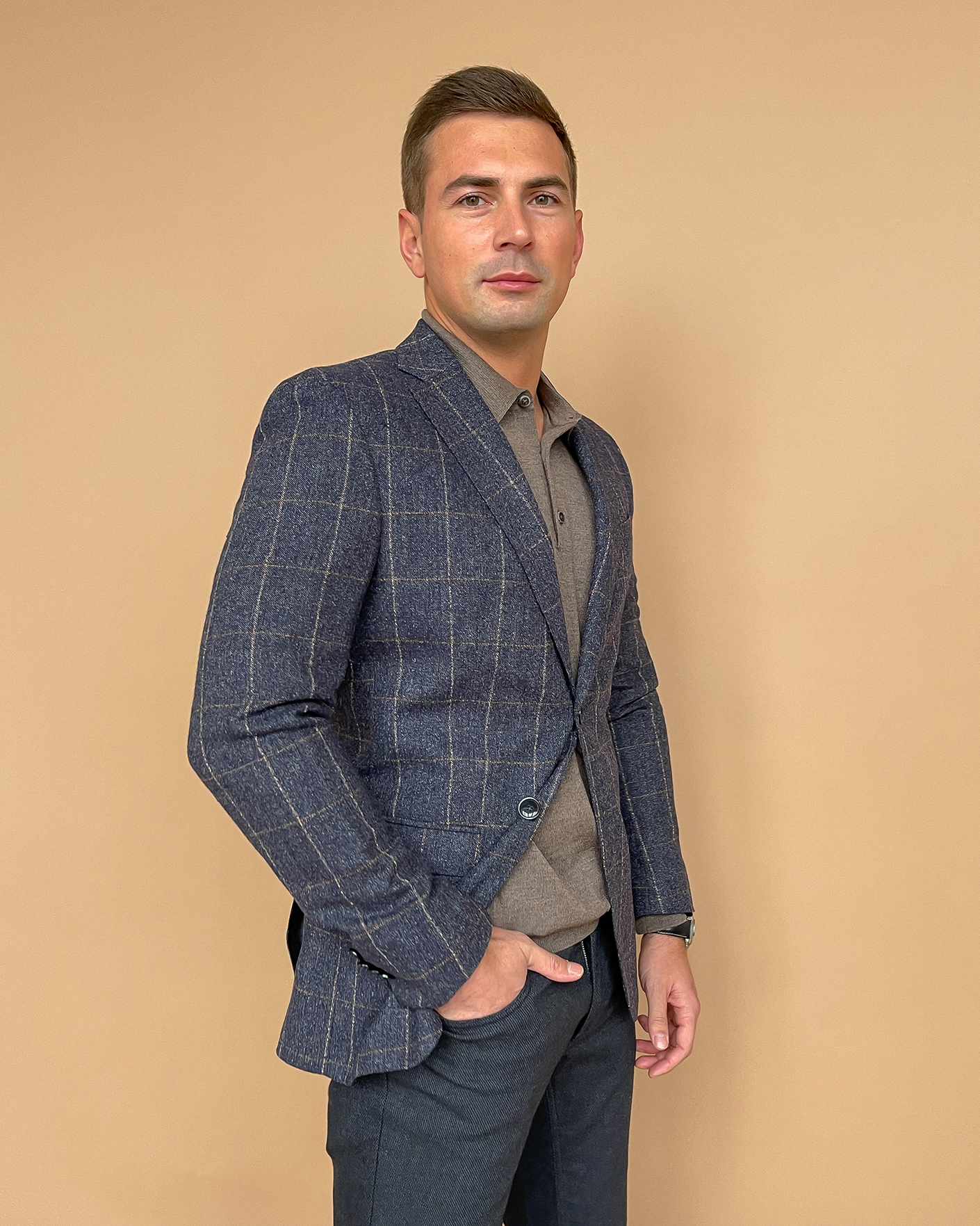 Пиджак Digel сине-коричневого цвета в крупную тонкую клетку. Имеются два боковых кармана с клапаном. Данная модель отлично сочетается, как с классическими однотонными рубашками, так и с рисунком, а также с утепленными брюками.