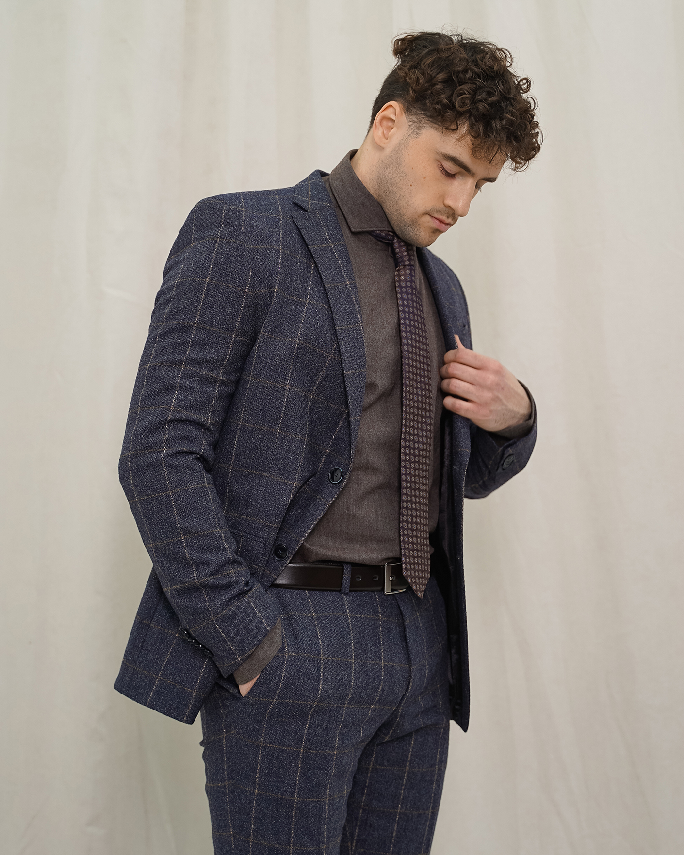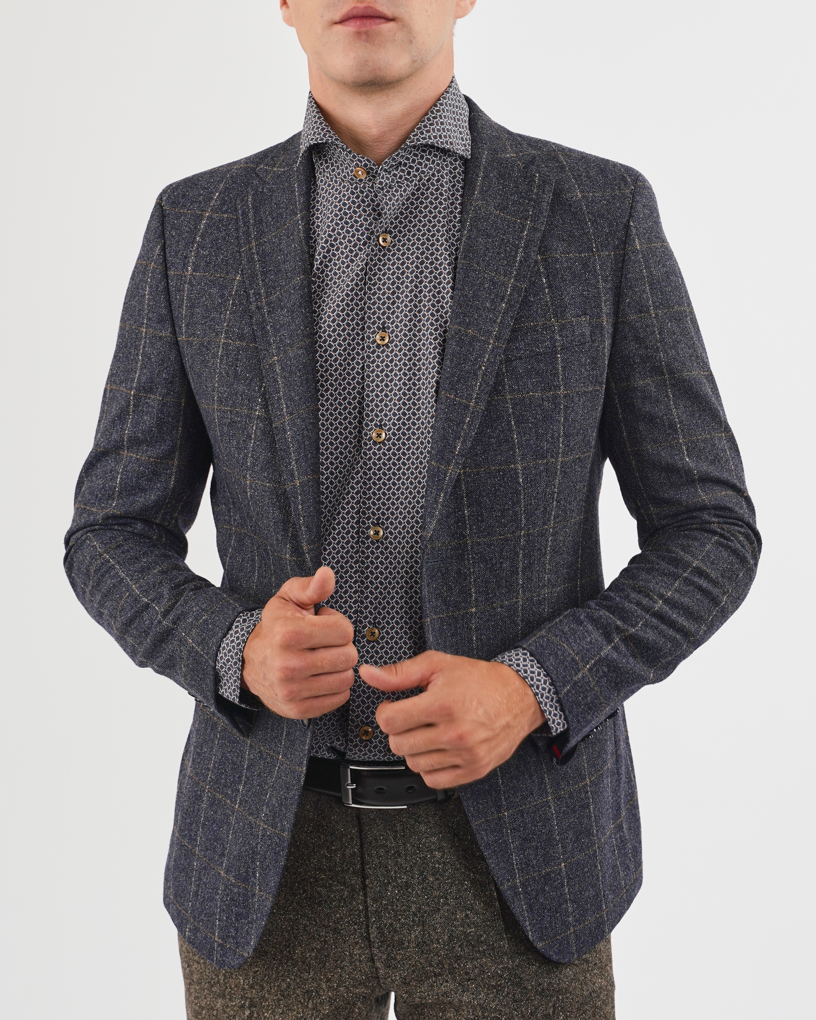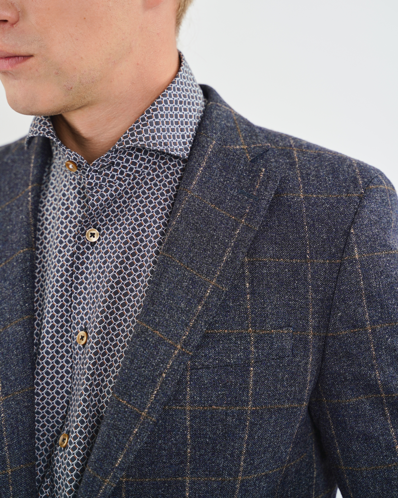 Пиджак Digel сине-коричневого цвета в крупную тонкую клетку. Имеются два боковых кармана с клапаном. Данная модель отлично сочетается, как с классическими однотонными рубашками, так и с рисунком, а также с утепленными брюками.