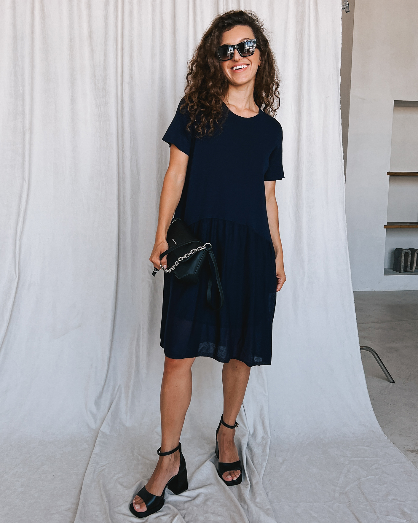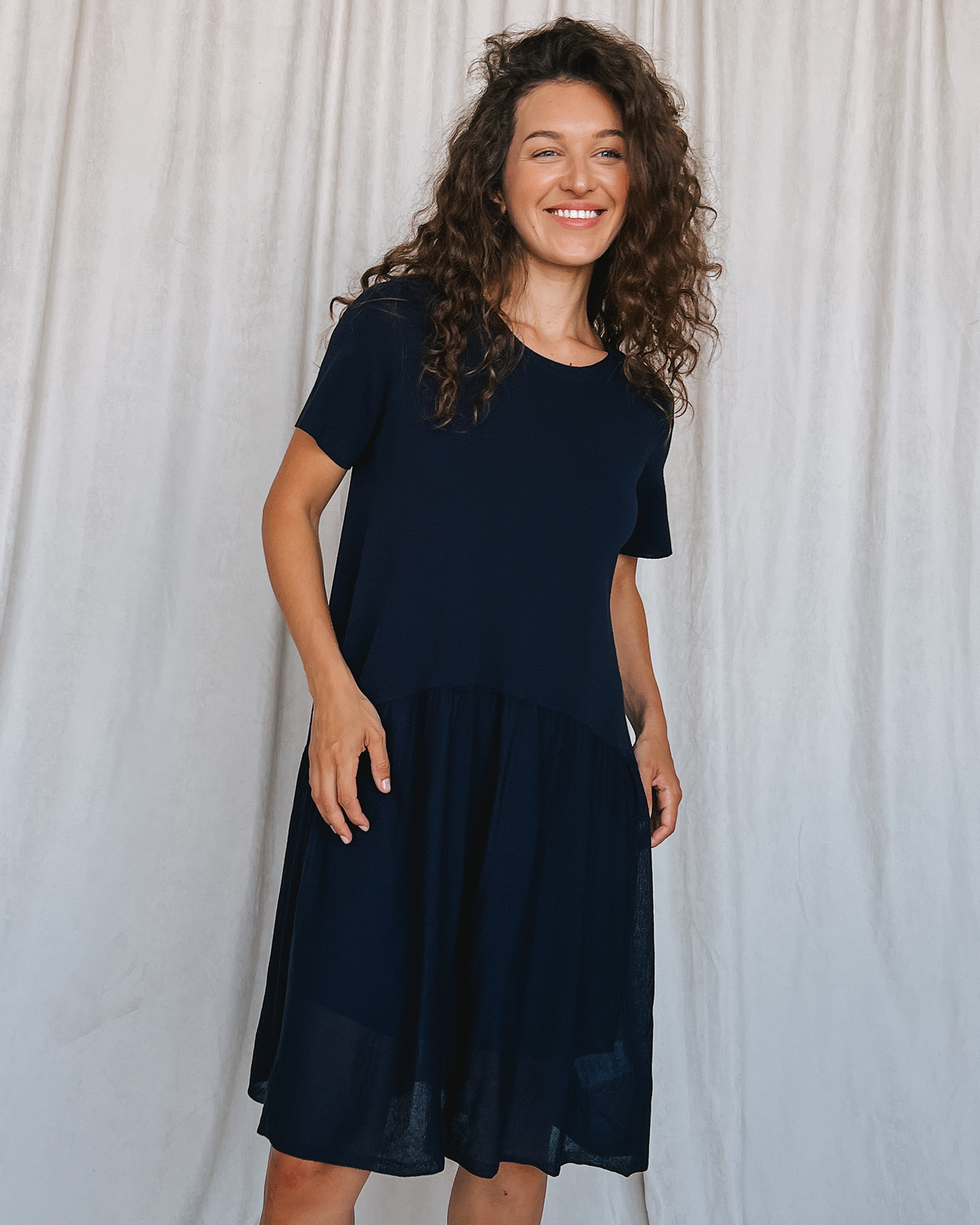 Свободное платье OUI темно-синего цвета в строчный рисунок. Модель с круглым вырезом на тонкой ребристой резинке, короткие рукава, а также присборенный низ с расклешенной юбкой. Универсальное платье отлично впишется в ваш гардероб на каждый день.