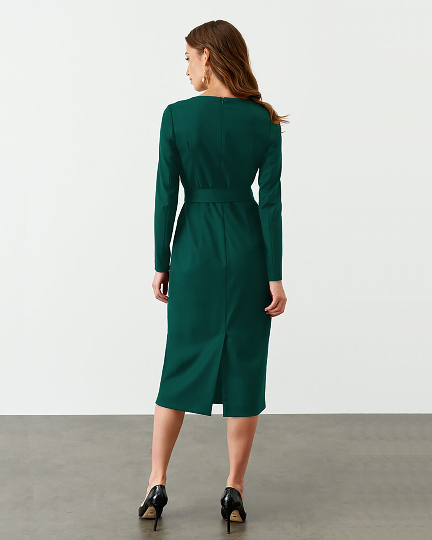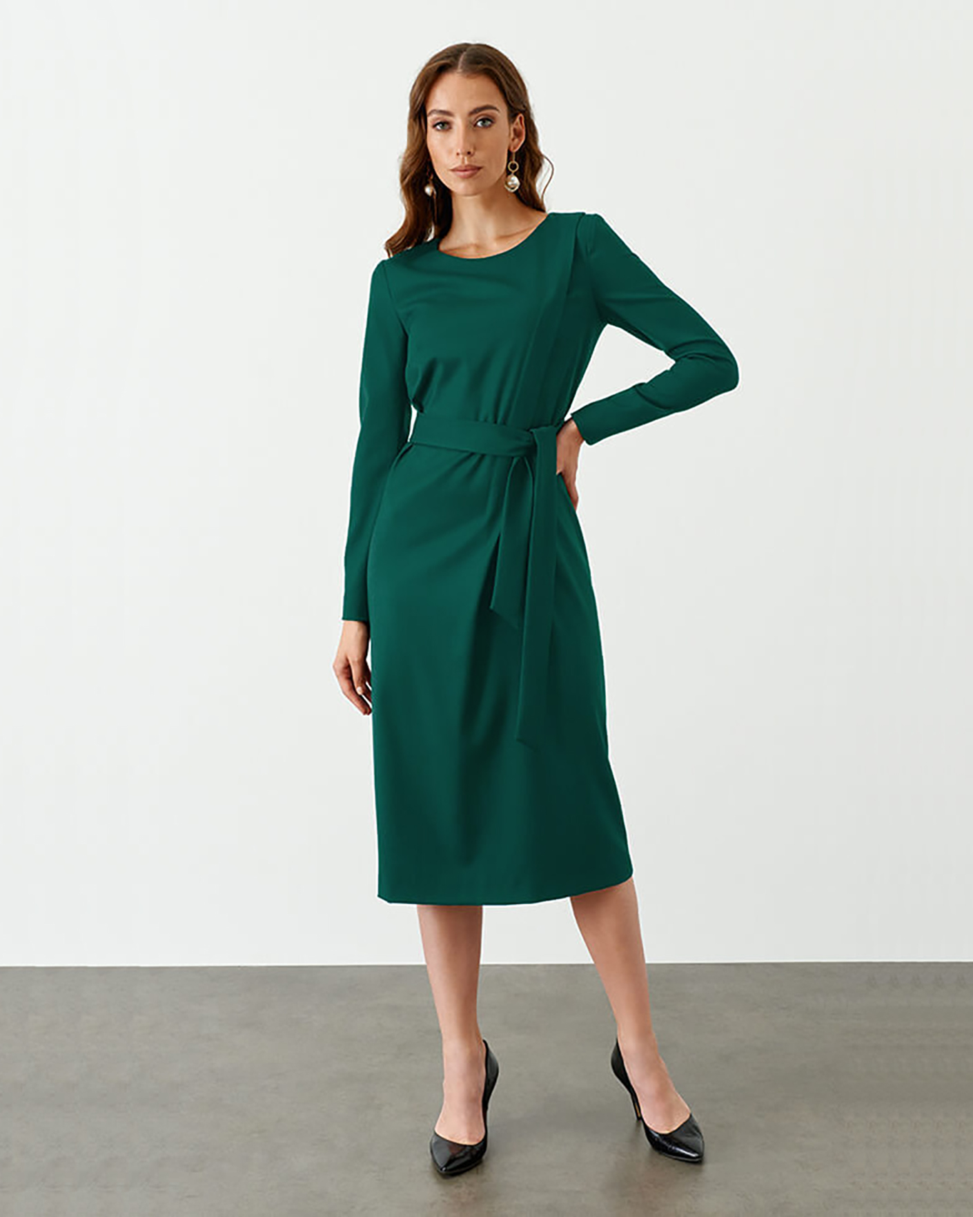 Полуприталенное платье-футляр Nelva зеленого цвета на поясе. Модель с круглым вырезом, длинными рукавами и потайной молнией на спинке. Стильное женственное платье станет незаменимой вещью на каждый день.